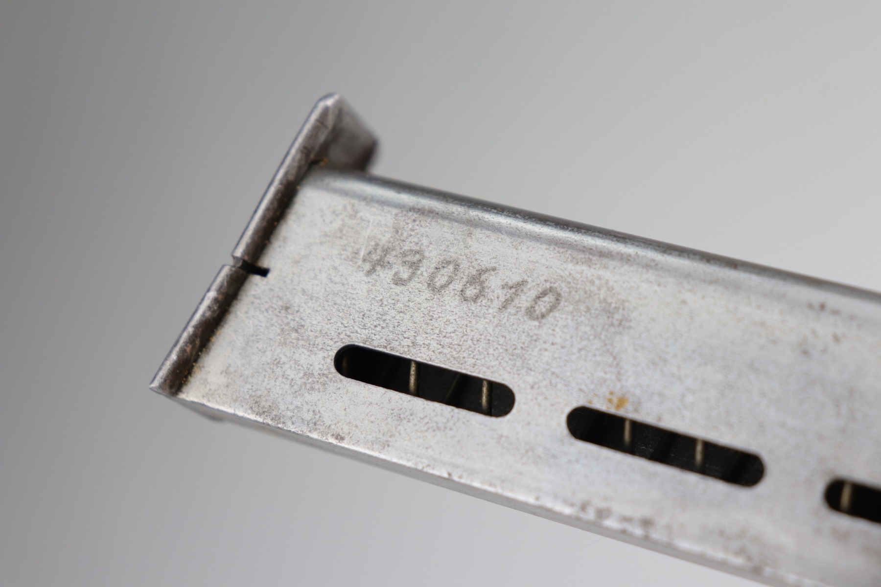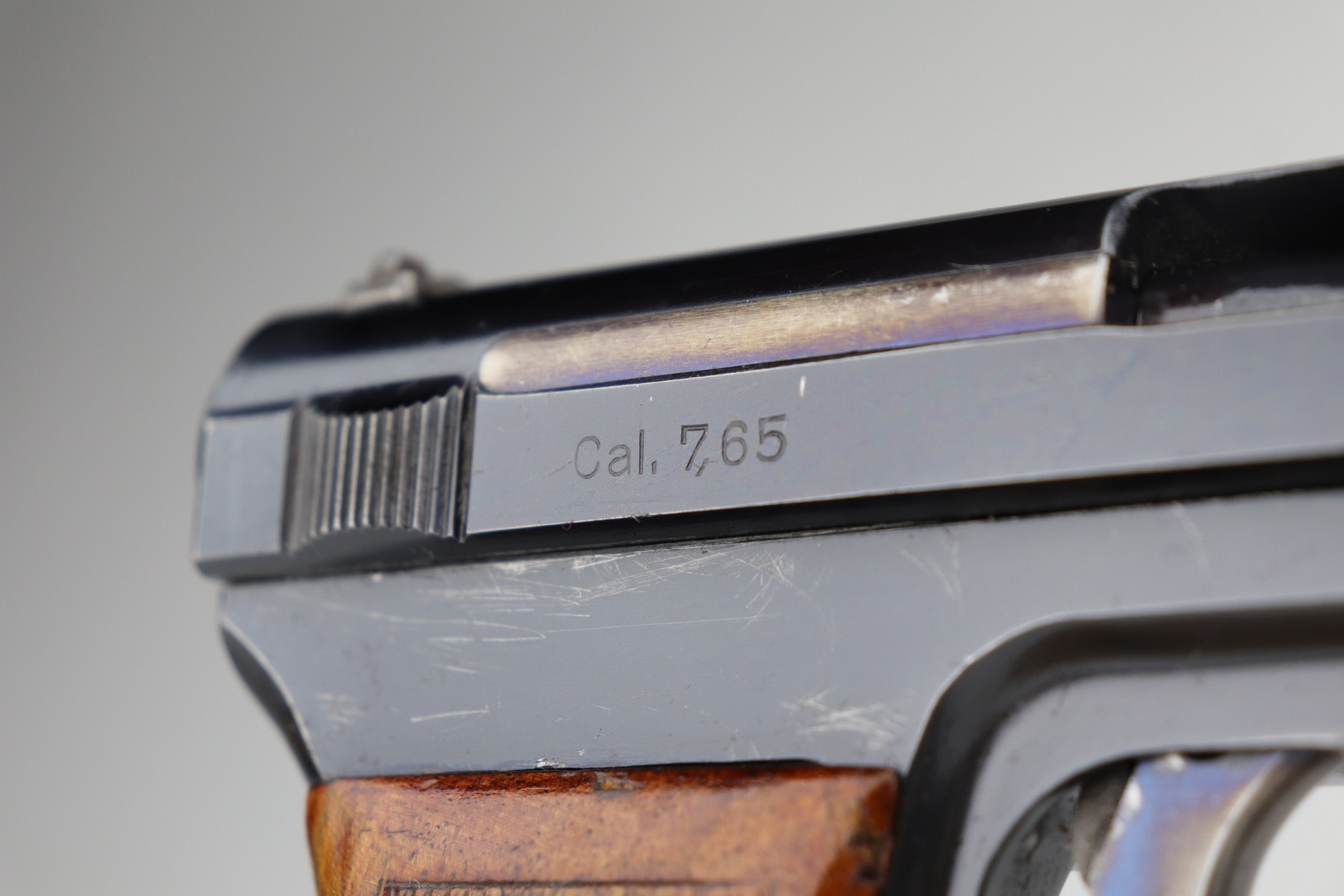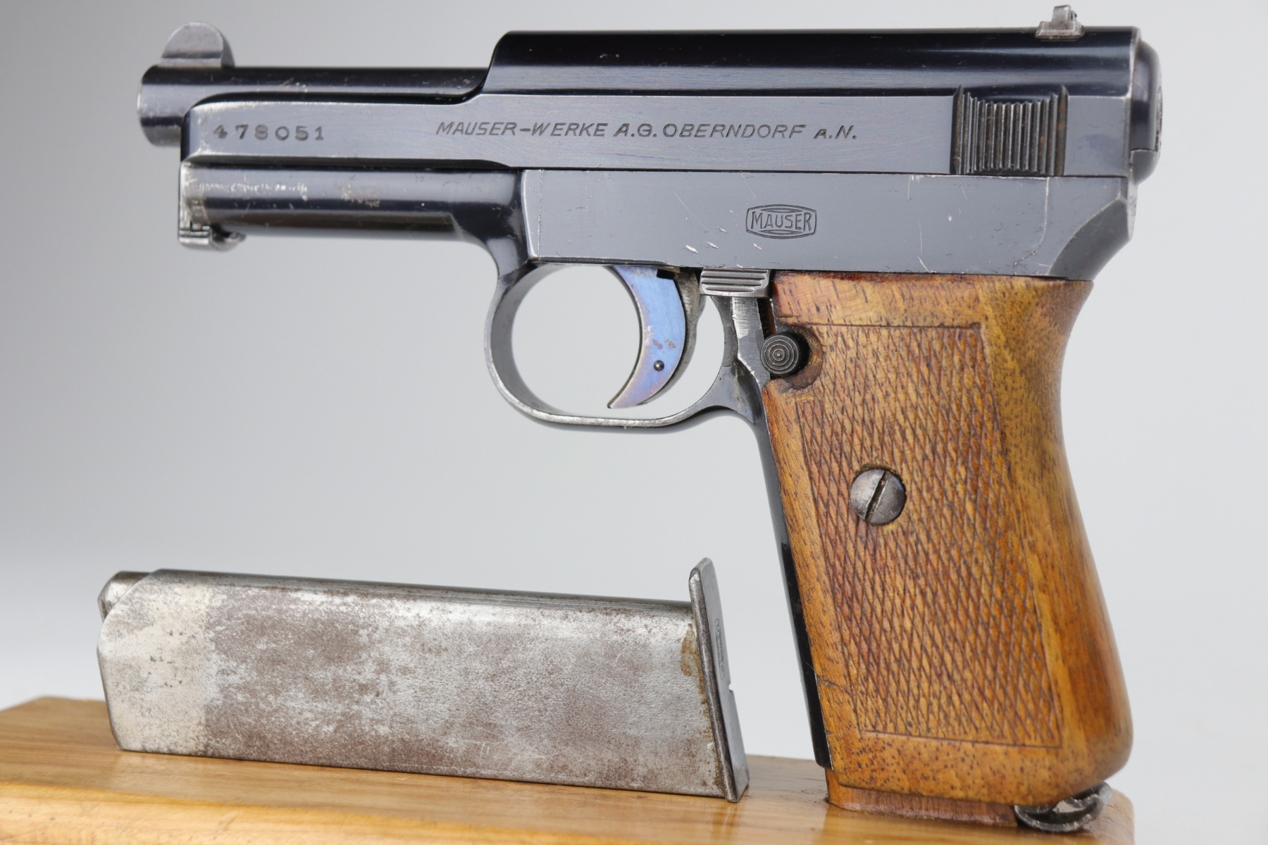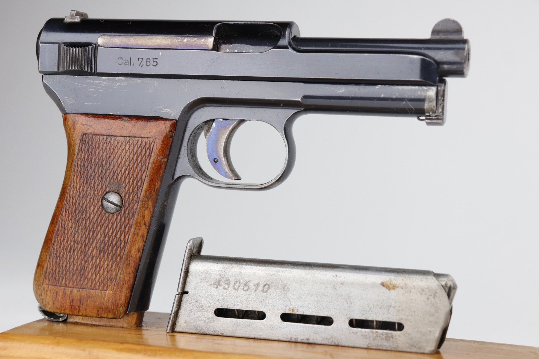 1/13/21 – This is a very nice example of a Mauser Model 1914/34 Transitional, made in about 1929-33. The only real difference between this and the earlier model is the slide legend. They made about 58,000 of this variation. This one is excellent, retaining about 95-96% of its original bluing. While there isn’t much actual finish loss, there are light scratches and handling marks throughout. There is also some spotty wear around the muzzle and on the front strap. It comes with a very nice grip – small chip near the spine. Also comes with a period-correct magazine. The slide has trouble staying back with this mag. The bore is excellent – shiny with strong rifling.