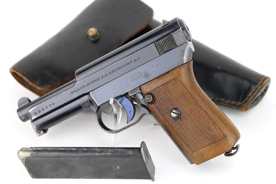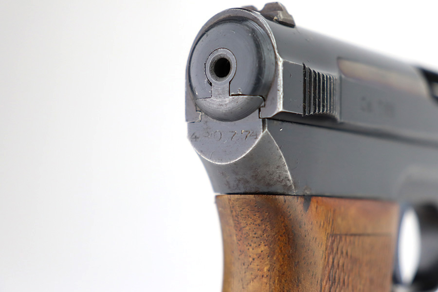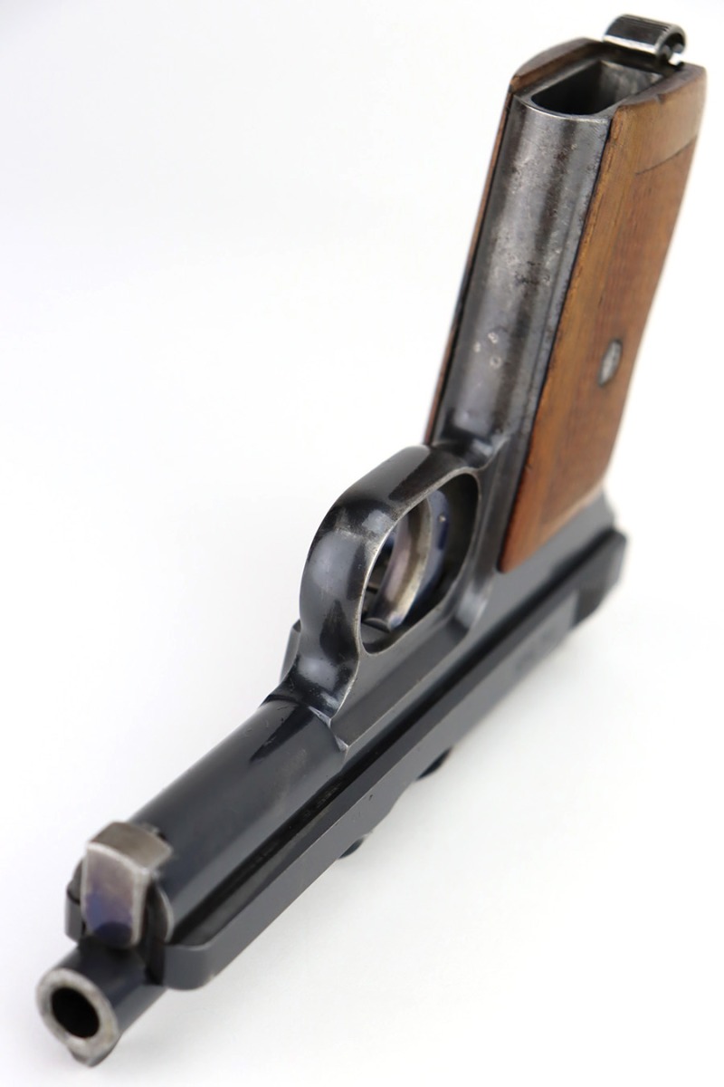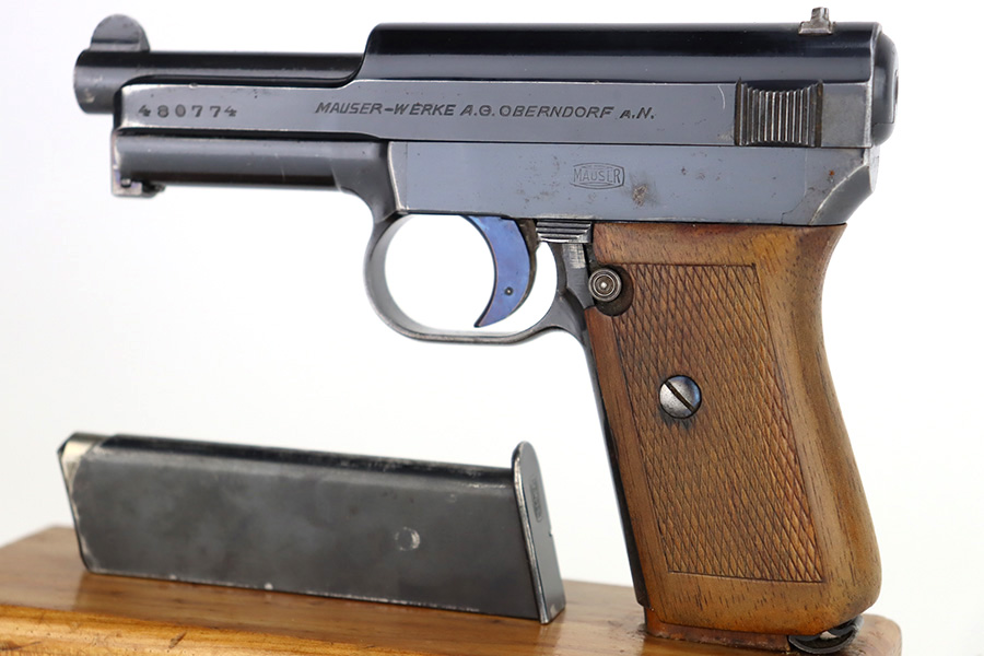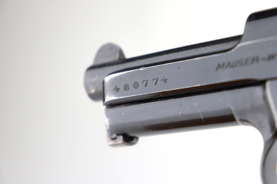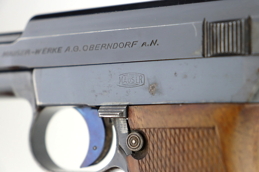 1/12/24 – This is a very nice example of a scarce, transitional Mauser Model 1914/34 from 1929-33. It is matching and “Double Crown U” proofed. Comes as a rig with a generic period-correct black leather holster and one proper magazine. The original high polish finish rates somewhere between 85-90%. The majority of the wear is on the front strap, so the profile views are excellent. Fitted with a minty period-correct wood grip. Near-mint bore.