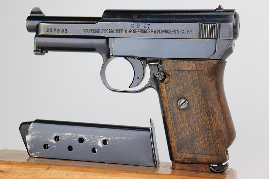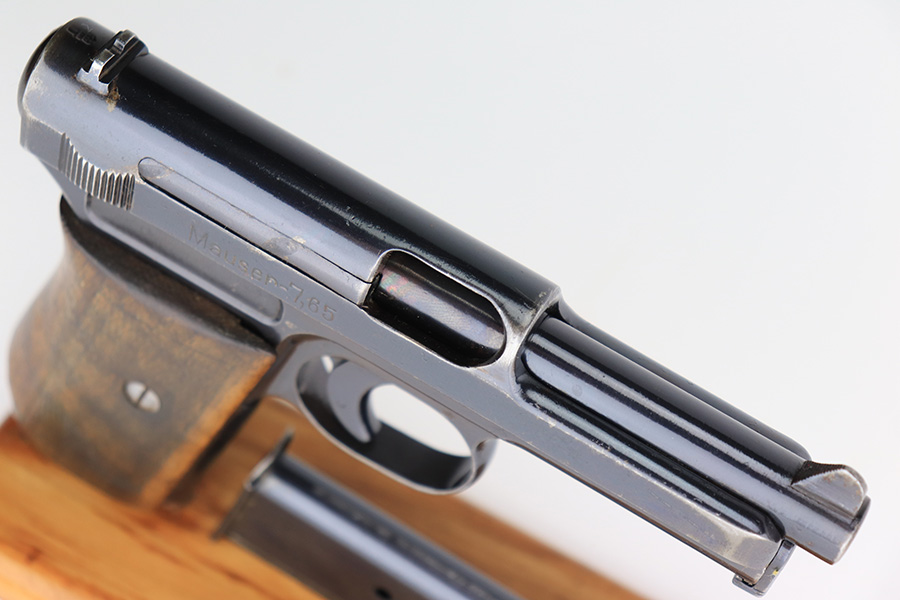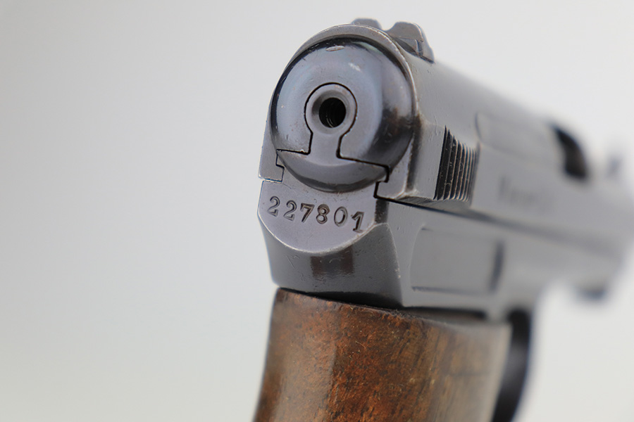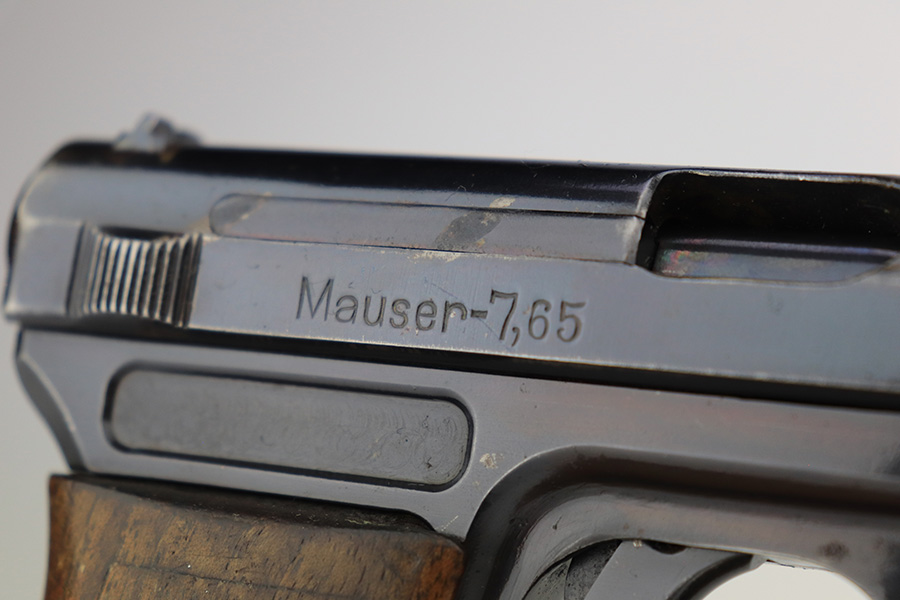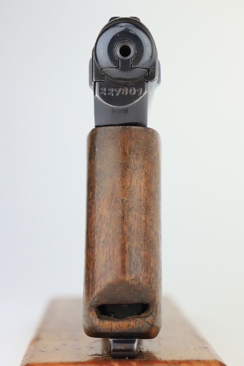 3/6/23 – This is a nice example of a Mauser Model 1914, chambered in 7.65mm. It is all matching except for the barrel. It is double “Crown U” proofed and has a “GP 17” marking on the left side of the slide. It is believed that this represents an inventory number for the “Gemeentepolitie” or Dutch Municipal Police before 1940. Other examples of these guns have also been observed with the same lanyard loop cutout on the spine of the grip – there is no known explanation for this feature. We believe that at least the frame has been refinished on this one. In any case, there is just some very minor thinning on the front strap, minor wear around the muzzle and high edges, and a few small dots of discoloration on the left side of the slide. The grip is fairly worn. Comes with one post-war magazine. The bore has good rifling with minor frosting and pin-pricking throughout.