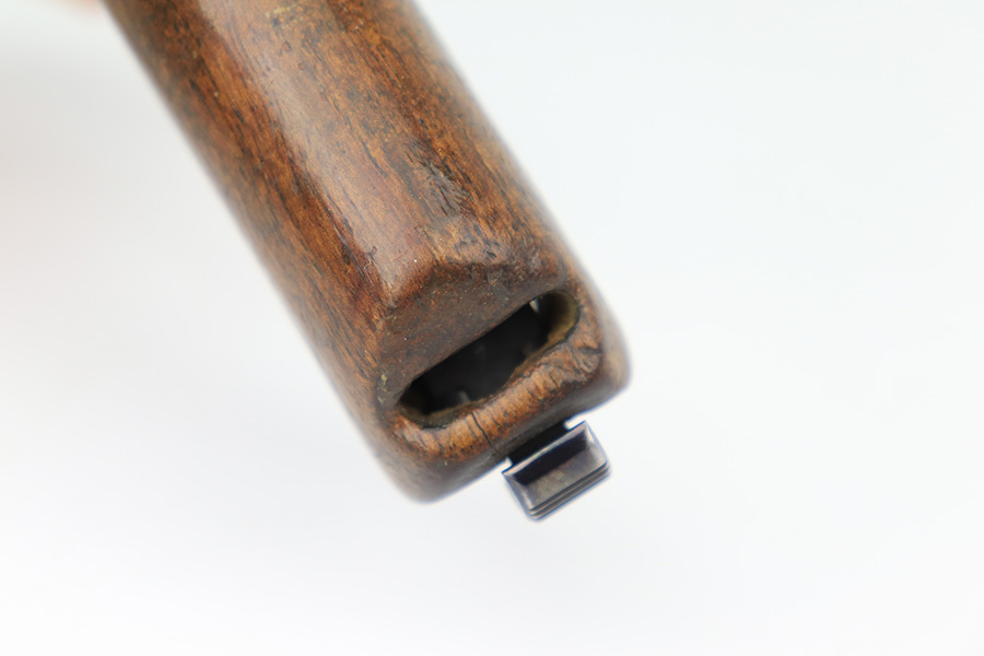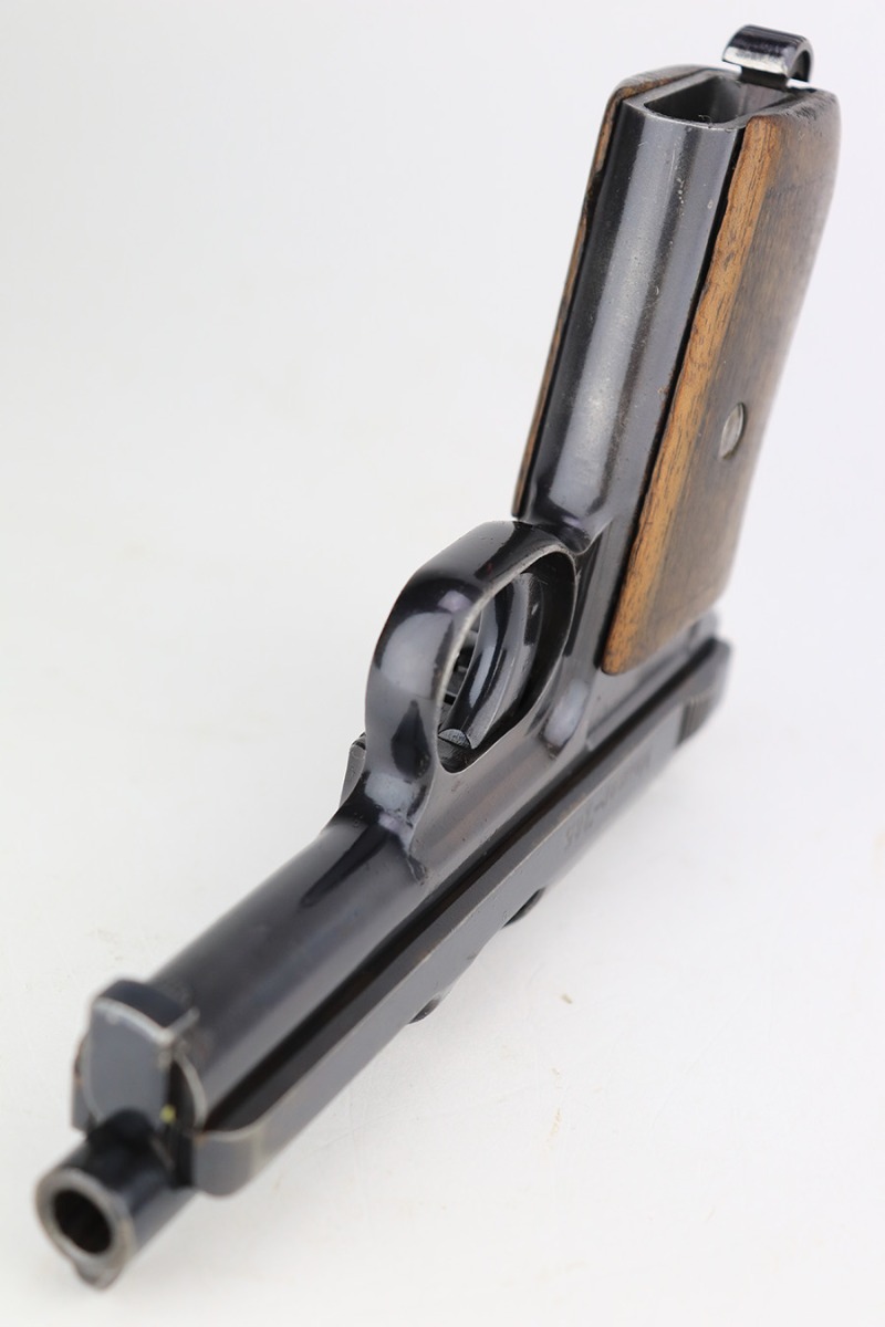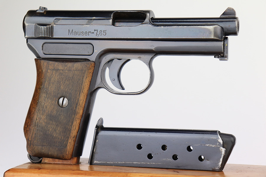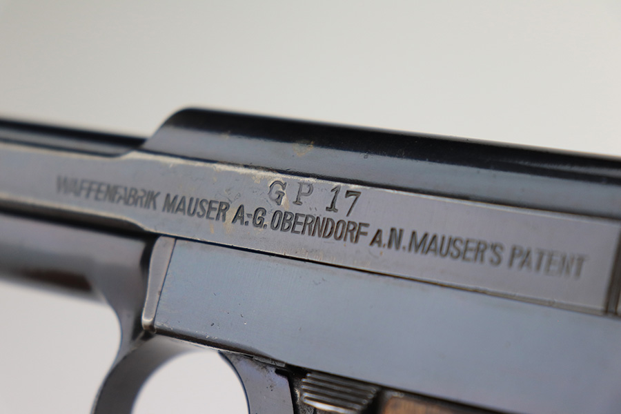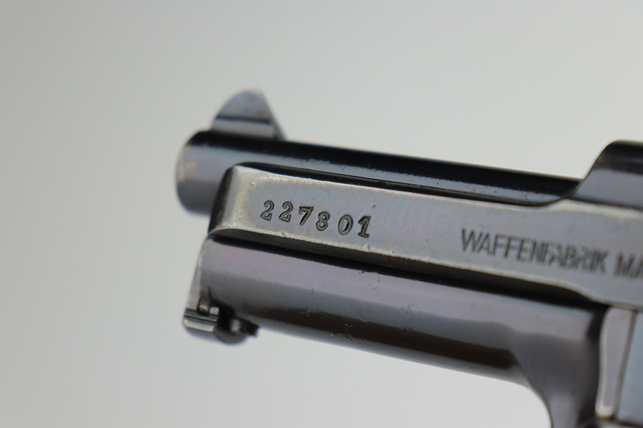 3/6/23 – This is a nice example of a Mauser Model 1914, chambered in 7.65mm. It is all matching except for the barrel. It is double “Crown U” proofed and has a “GP 17” marking on the left side of the slide. It is believed that this represents an inventory number for the “Gemeentepolitie” or Dutch Municipal Police before 1940. Other examples of these guns have also been observed with the same lanyard loop cutout on the spine of the grip – there is no known explanation for this feature. We believe that at least the frame has been refinished on this one. In any case, there is just some very minor thinning on the front strap, minor wear around the muzzle and high edges, and a few small dots of discoloration on the left side of the slide. The grip is fairly worn. Comes with one post-war magazine. The bore has good rifling with minor frosting and pin-pricking throughout.
