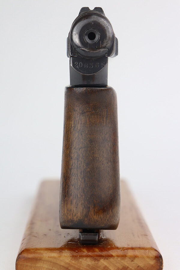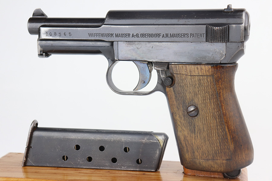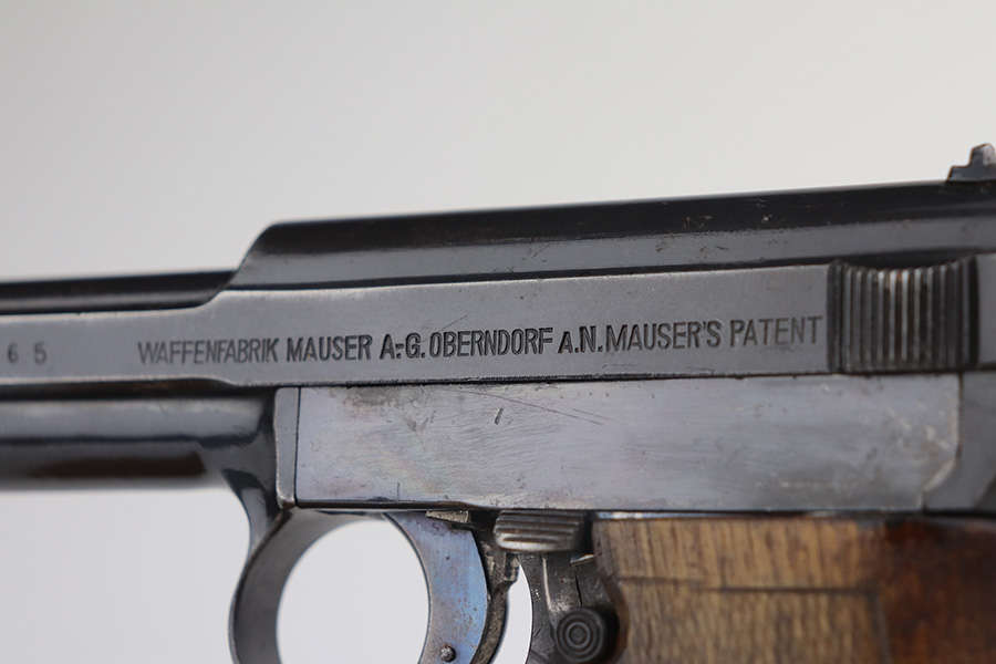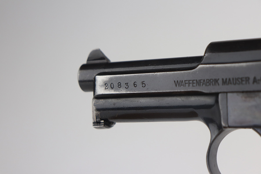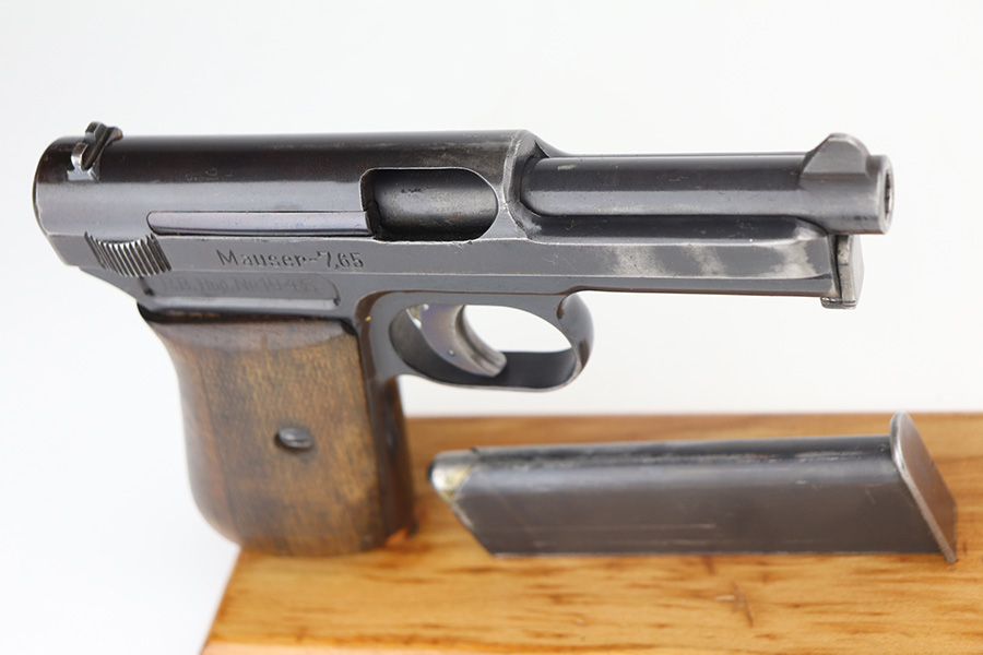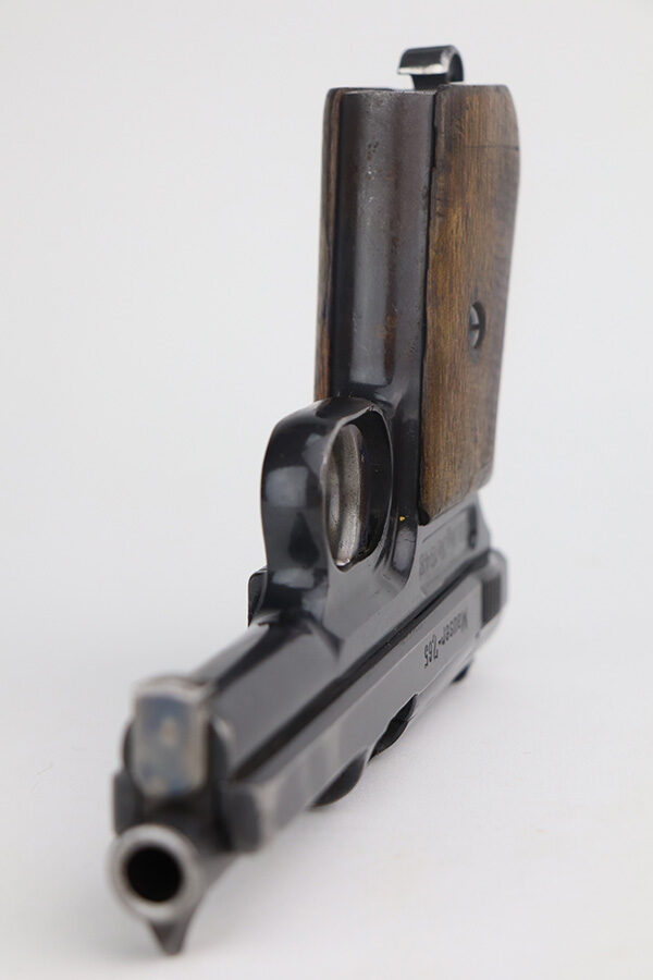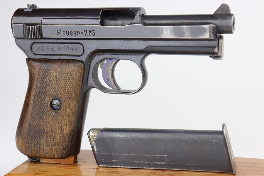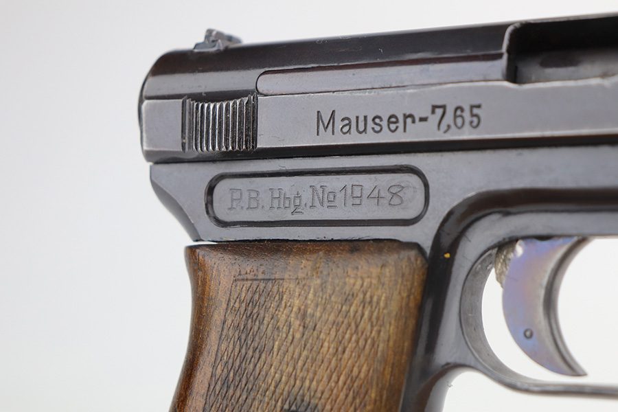 6/2/21 – This is a nice example of a Mauser Model 1914 that was originally sold in the commercial market in the 1920’s. It was then issued to the Hamburg police force. It is all matching, has “Crown U” proofs, and has a “P.B. Hbg. No 1948” police unit marking on the right side of the frame. It has retained about 80% of its bluing. There are areas of minor wear on the high edges of the slide, around the muzzle, back of the slide, top of the slide, and on the slide toward the muzzle. Areas of spotty oxidation, discoloration, and light scratches on the right side of the frame. There is patina, spotty oxidation, and spotty discoloration on the front strap. Comes with a slightly worn wood grip and a period-correct magazine. Very nice bore with good rifling.