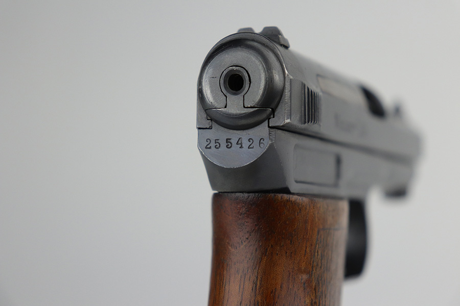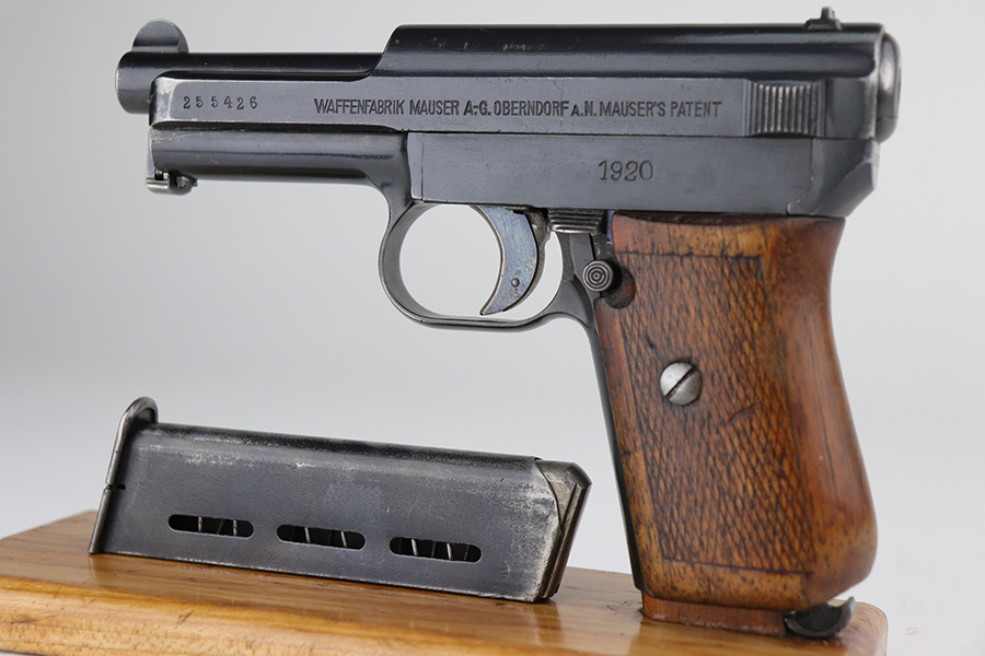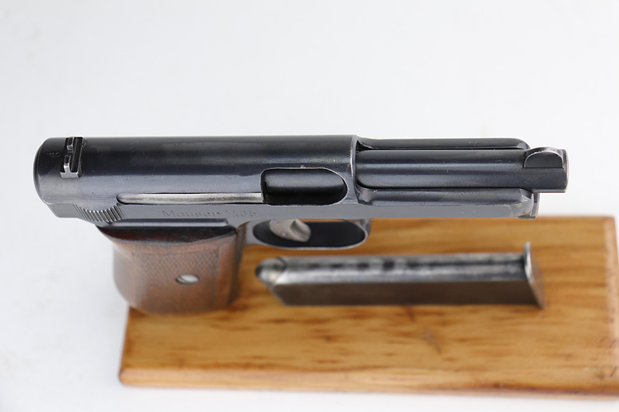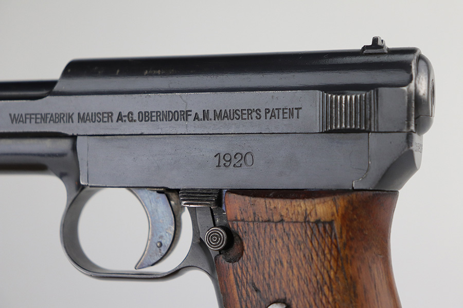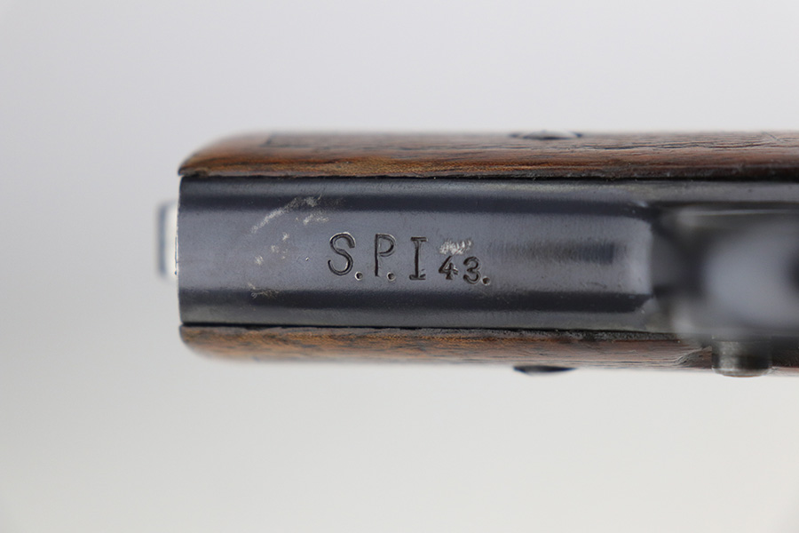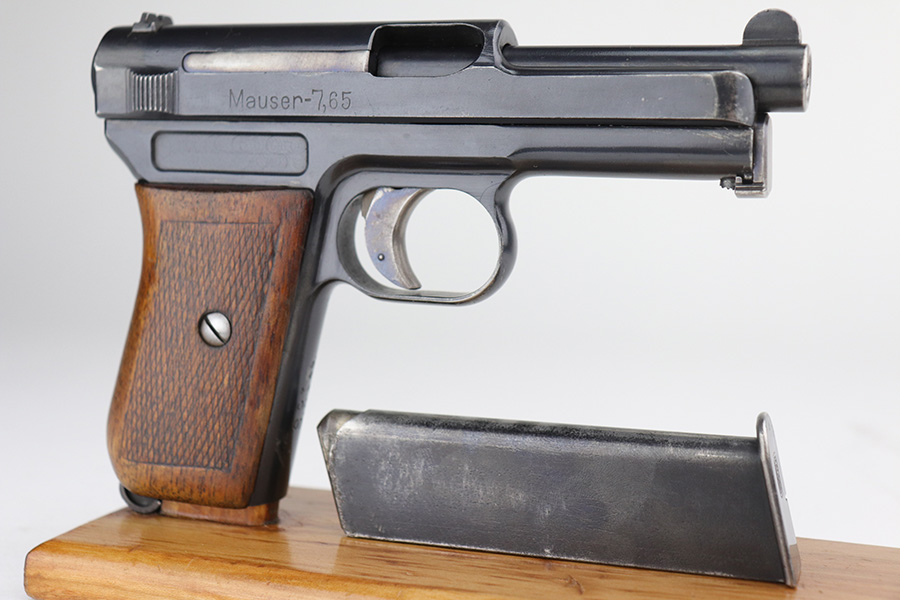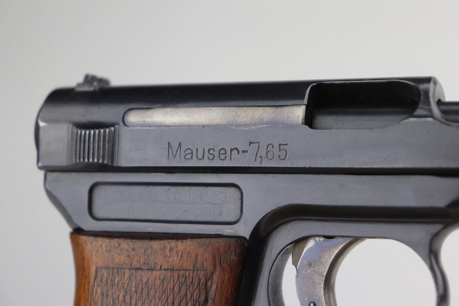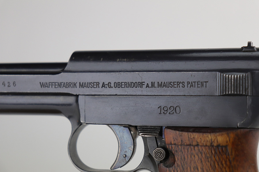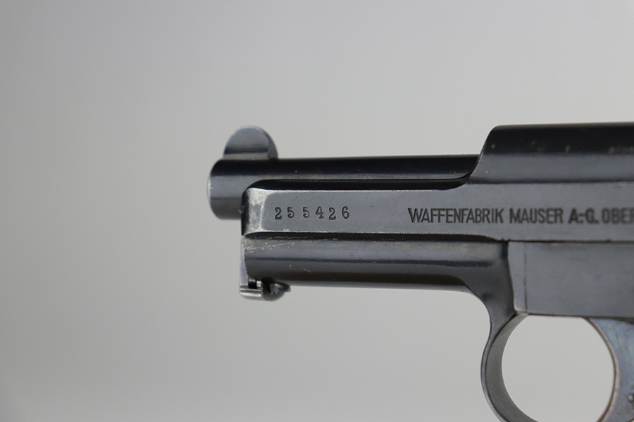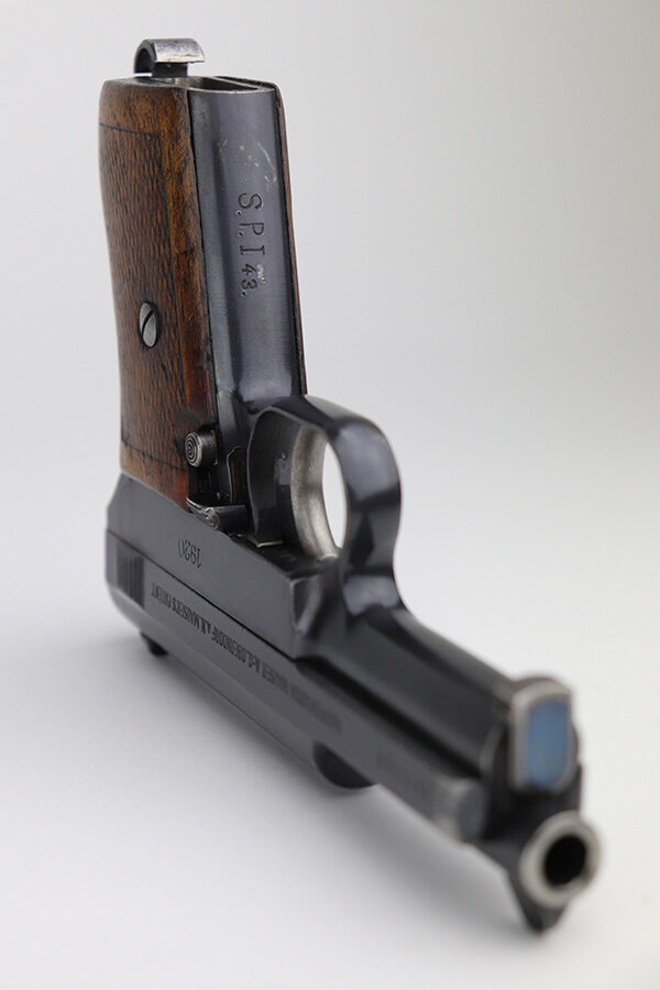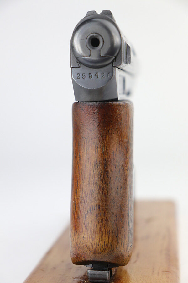9/1/21 – This is an excellent example of a Mauser Model 1914 that was originally sold in the commercial market, reworked, and issued to the German police in the 1920’s. This one is all matching and has the proper “Crown U” proofs. There is also a “1920” rework stamp on the left side of the frame and a “S.P.I. 43.” police unit marking on the front strap. It has retained about 95% of its finish. Most of the wear is around the muzzle. There are also some handling marks along the top of the slide and some spotty wear on the front strap. Comes with a nice brown grip (minor dings and bruises) and a proper magazine. The bore is very nice – shiny with good rifling.