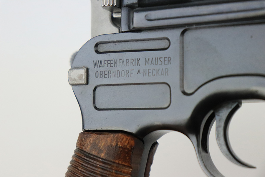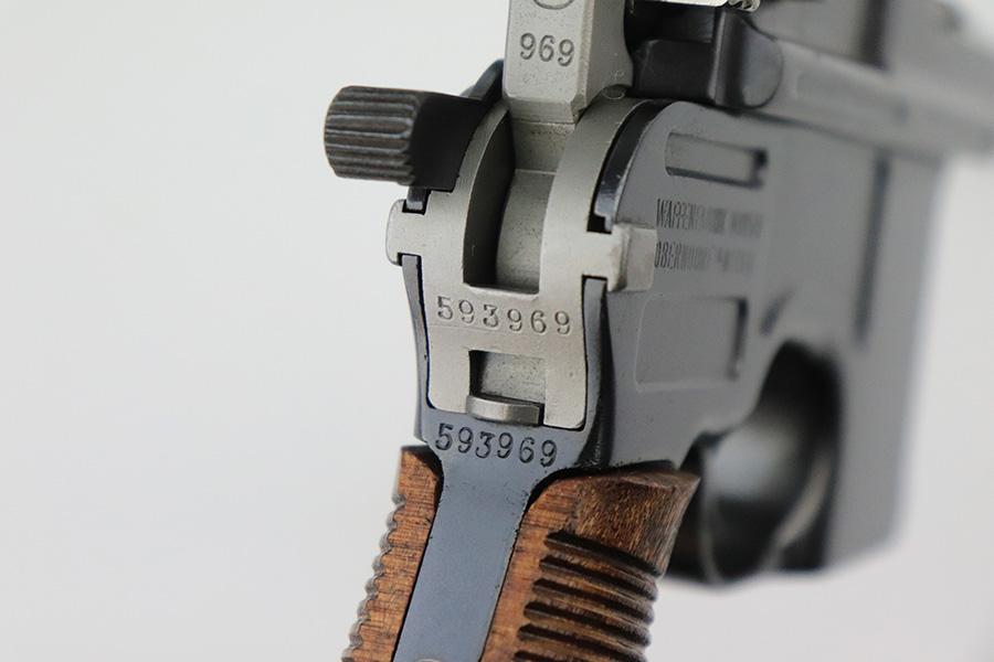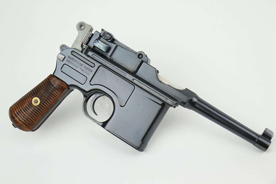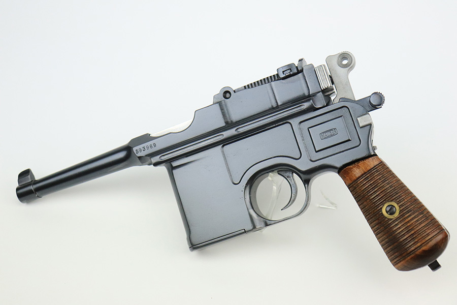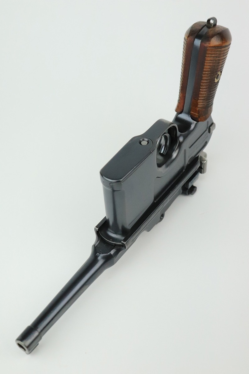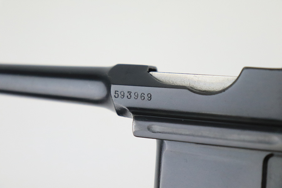 6/17/22 – This is an original Mauser Bolo pistol from shortly after the Great War. After the Armistice, the Allies imposed restrictions on German arms production, and handguns were limited in barrel length and caliber. Mauser began producing new pistols again in the early 1920s, and while the standard Mauser 7.63 mm caliber was in compliance with the Treaty of Versailles, the 5.5″ barrel was too long. Instead of making guns identical to their prewar or wartime commercials but with shorter barrels, Mauser essentially put their prewar Bolo back into production. This postwar Bolo was the standard C-96 made by Mauser through the 1920s. This one is all matching and has the proper “Double Crown U” proofs. This particular gun has been completely professionally restored, so the bluing is very nice. There is almost no actual finish loss, but there are some areas with a few tiny pits under the bluing. Comes with minty wood grips. Mint bore. Lanyard ring is missing.