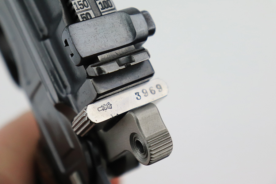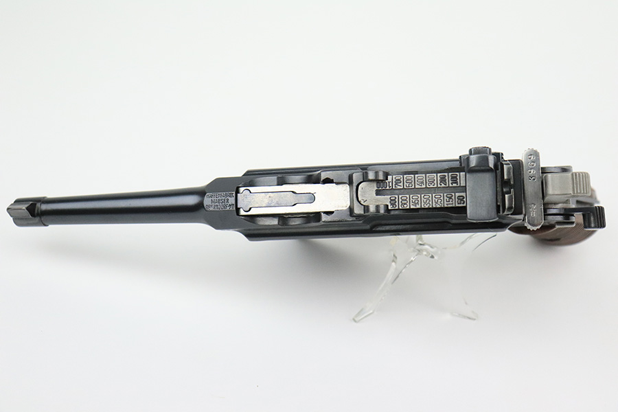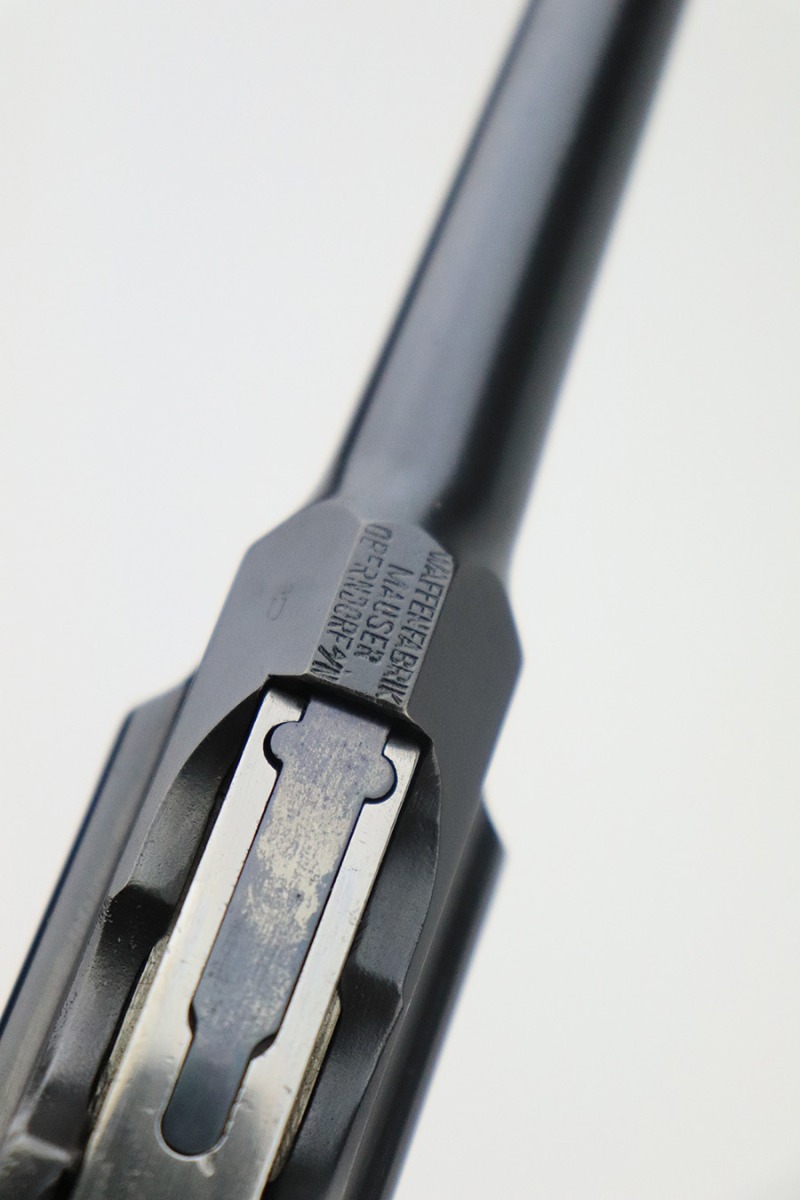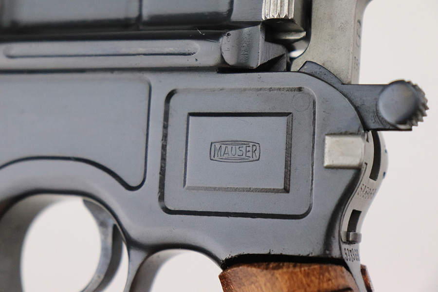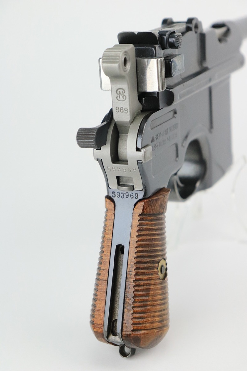 6/17/22 – This is an original Mauser Bolo pistol from shortly after the Great War. After the Armistice, the Allies imposed restrictions on German arms production, and handguns were limited in barrel length and caliber. Mauser began producing new pistols again in the early 1920s, and while the standard Mauser 7.63 mm caliber was in compliance with the Treaty of Versailles, the 5.5″ barrel was too long. Instead of making guns identical to their prewar or wartime commercials but with shorter barrels, Mauser essentially put their prewar Bolo back into production. This postwar Bolo was the standard C-96 made by Mauser through the 1920s. This one is all matching and has the proper “Double Crown U” proofs. This particular gun has been completely professionally restored, so the bluing is very nice. There is almost no actual finish loss, but there are some areas with a few tiny pits under the bluing. Comes with minty wood grips. Mint bore. Lanyard ring is missing.