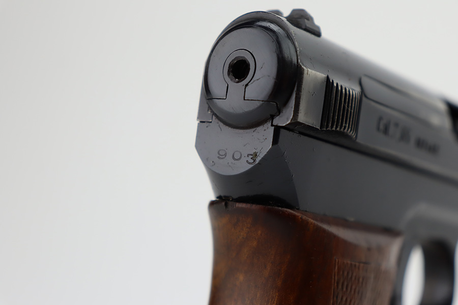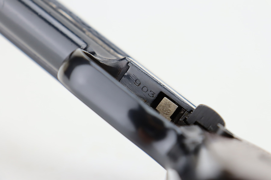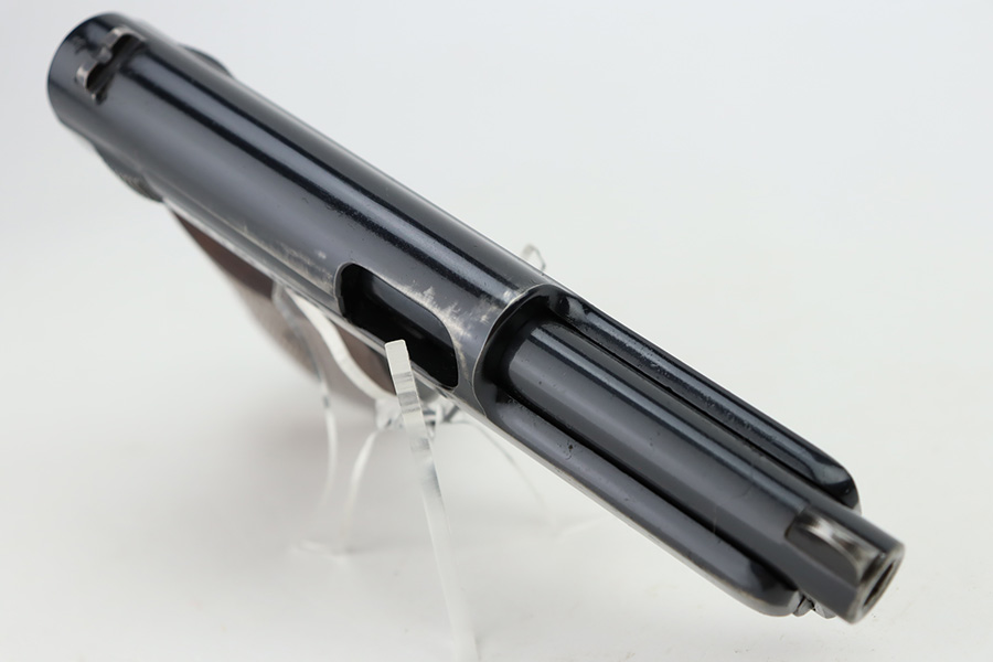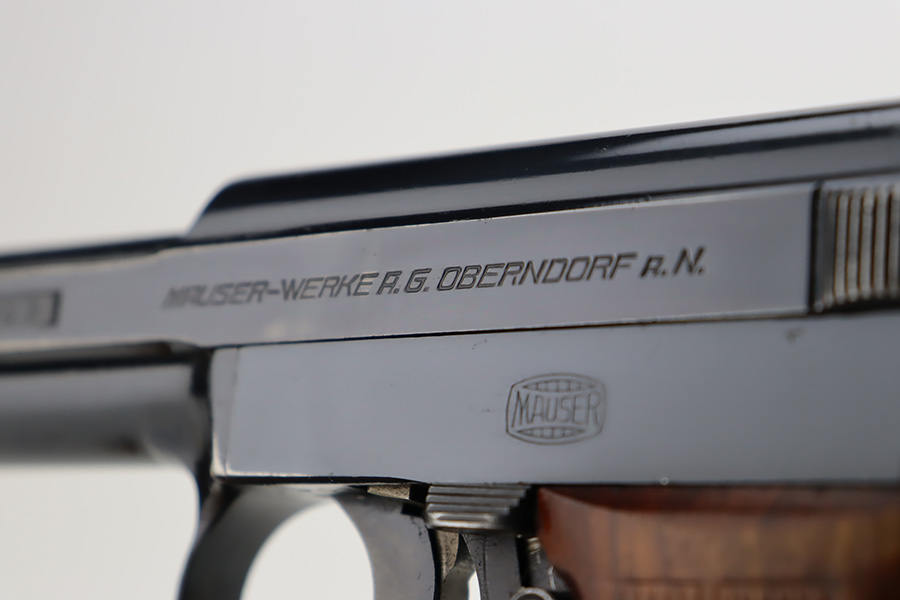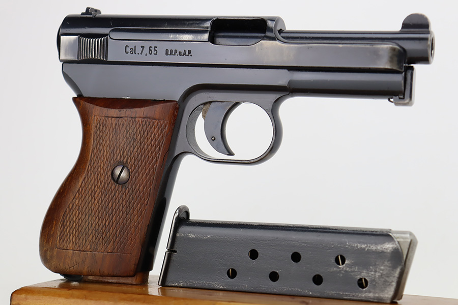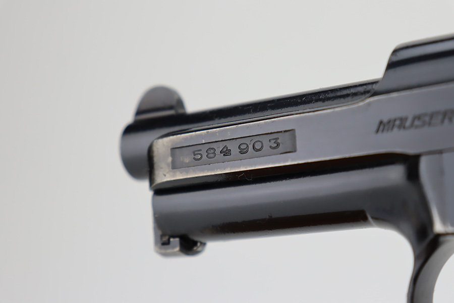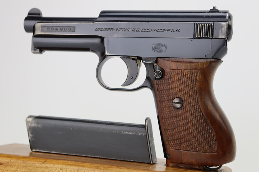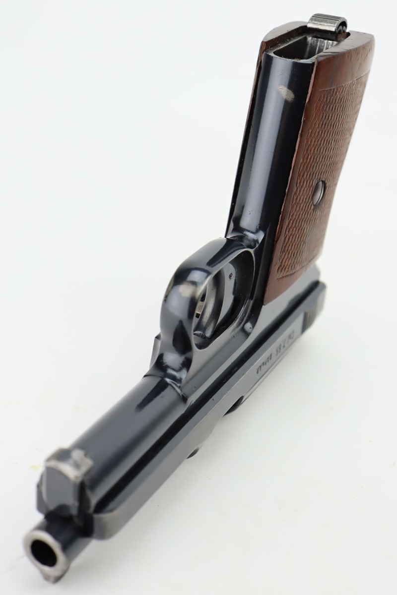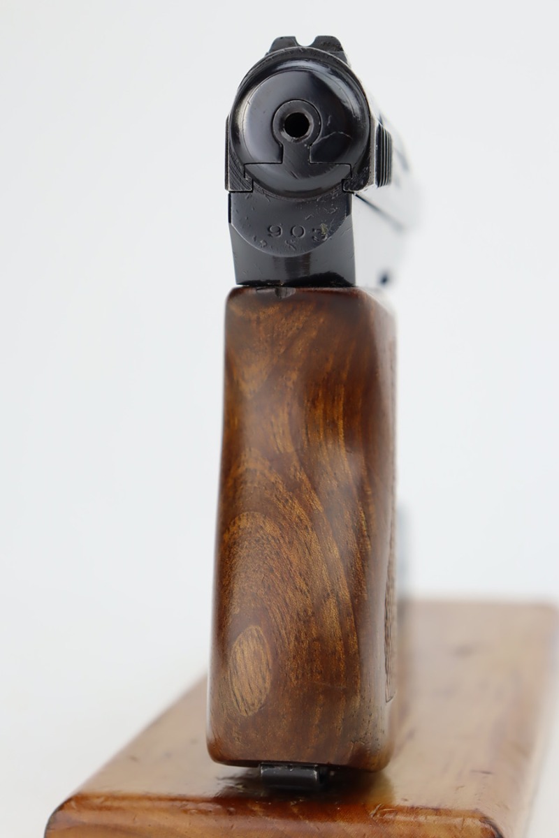 11/1/23 – This is a very nice example of a Mauser Model 1934 sold in the commercial market around 1940. All matching and “Eagle N” proofed. It has retained about 92% of its original high polish finish. Generally, there is high edge wear, some spots of wear on the right side of the slide, and one small dot of wear on the front strap. Fitted with an excellent period-correct wood grip – tiny chip in the bottom left corner on the left side. Comes with one proper magazine. The bore has great rifling with just very minor frosting in the grooves.