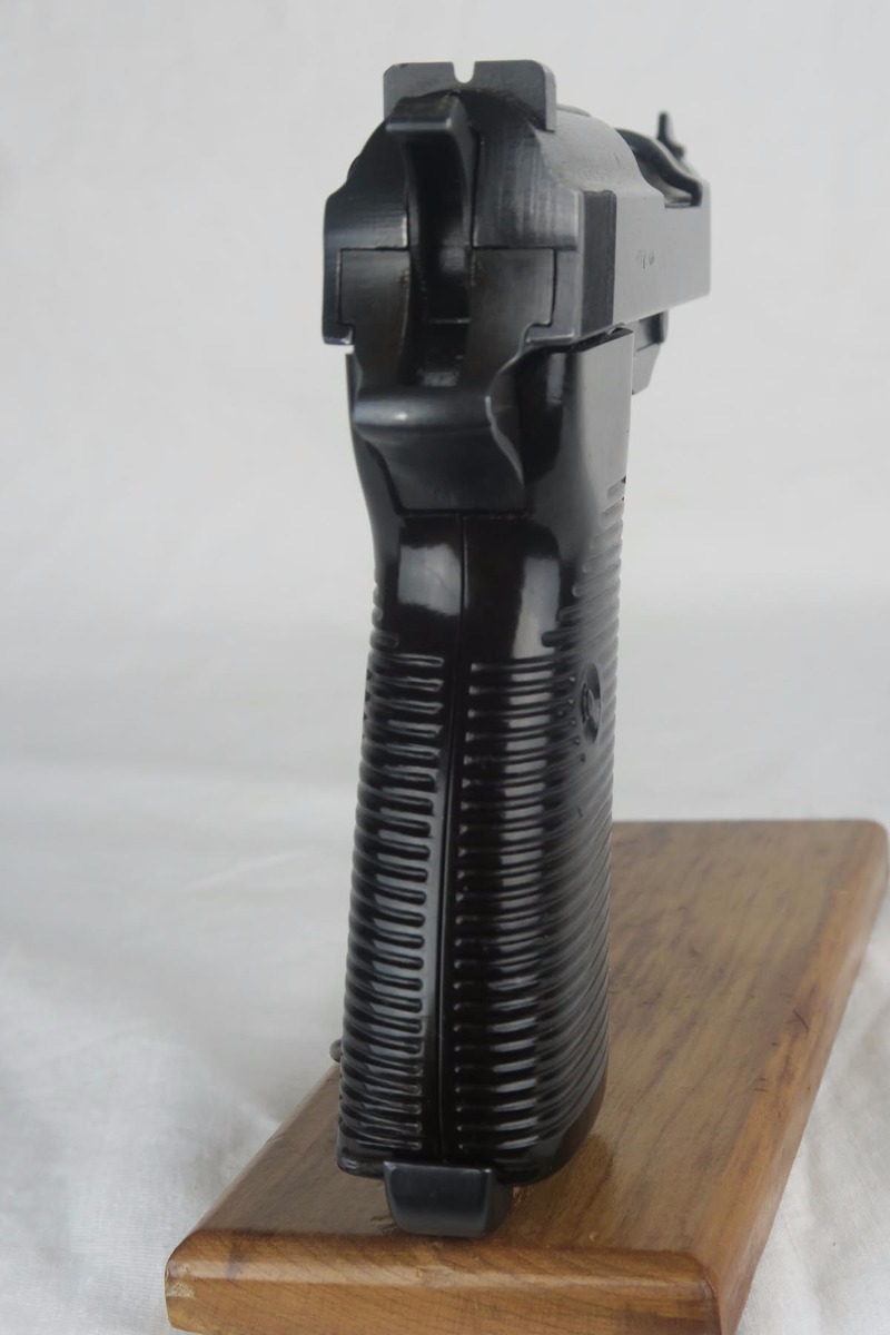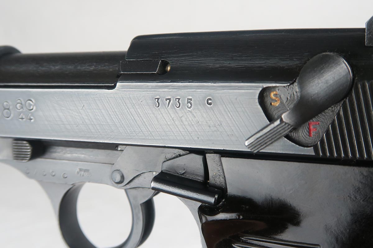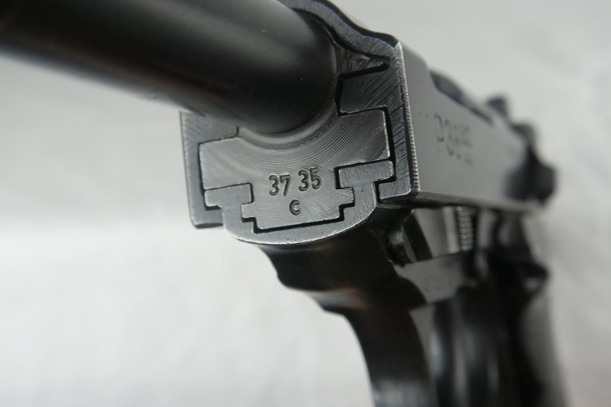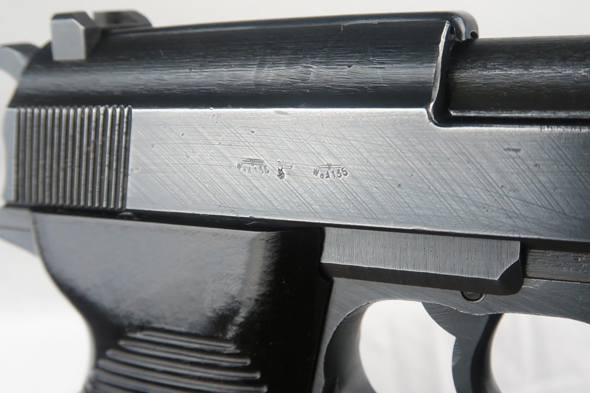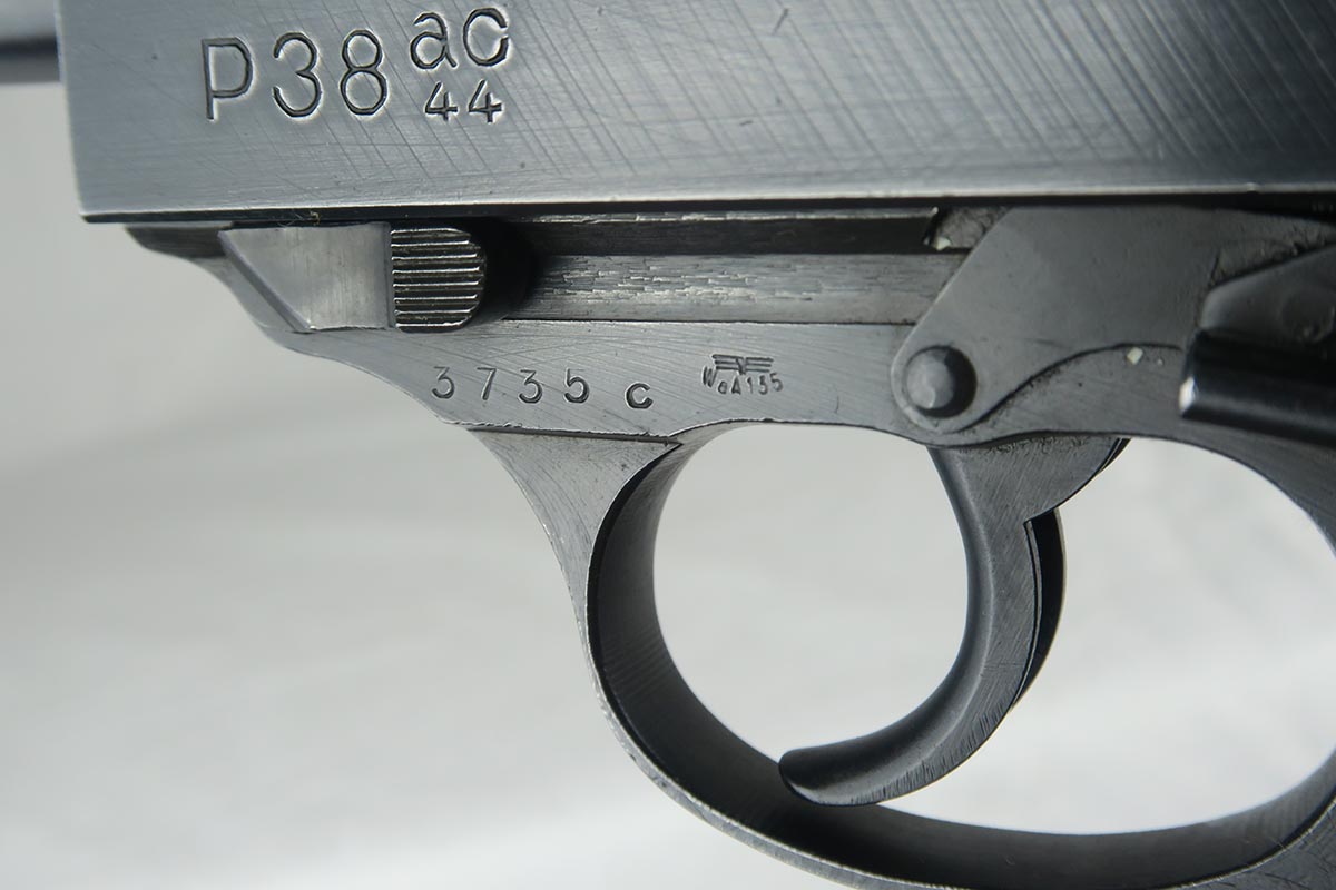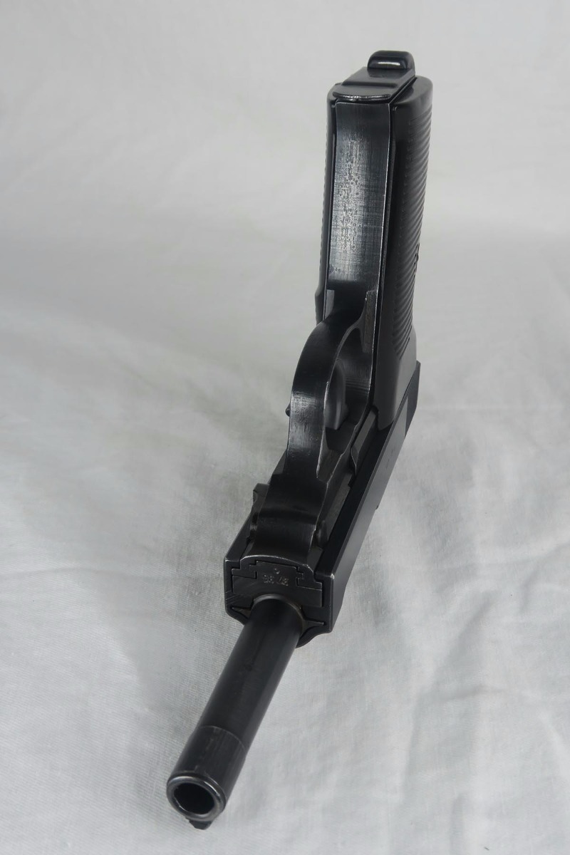 12/1/17 –  This is a fairly rare gun as it has a slide that was made in the Browning FN factory for assembly by Mauser.   All of the parts are matching including the slide, frame, barrel and locking block.  All parts are also proofed Eagle 135, including the magazine which is WaA135 on the spine.  The bore is shiny and strong.  The grips are excellent as well.  The finish, however, is more of a mystery.   All of the springs are clean and white.  The S and F paint show age, but other guns I have observed in this serial range (C block)  were dual-tone.  This one appears to be a wartime blue finish throughout.  Overall, a very clean and attractive P.38.  There are no import marks or Russian X on the gun.  Mechanically excellent condition.  De-cocker works as well.