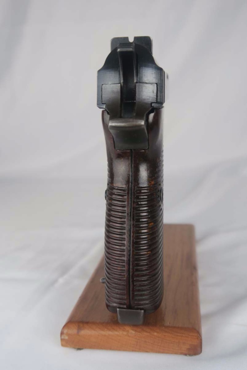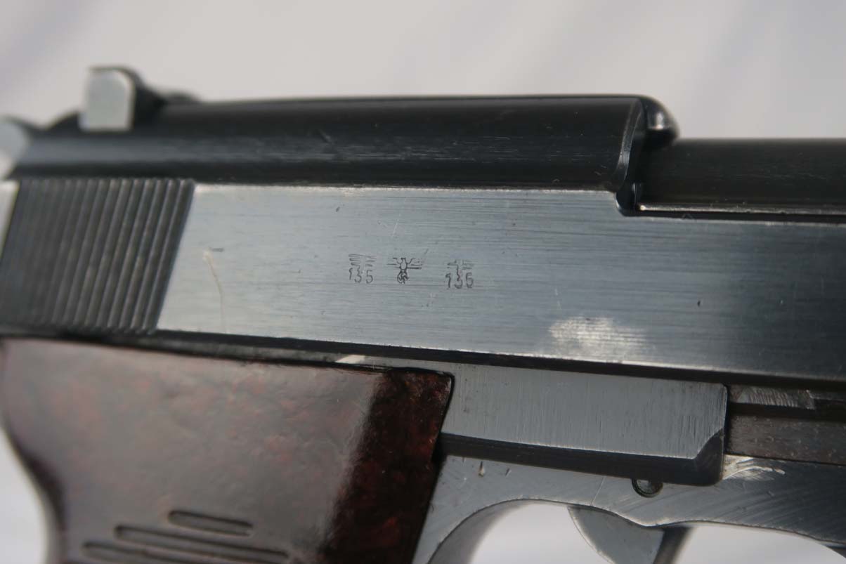 7/26/17 – This is an all original and correct Mauser P.38 from WW2.  Manufactured in 1943, all numbered parts are matching the original bluing rates at about 94-95%.  There is some high edge wear and a couple spots of finish loss on either side of the slide.  Excellent reddish grips.  Mag is only marked P.38v.  Very nice bore with no major flaws.