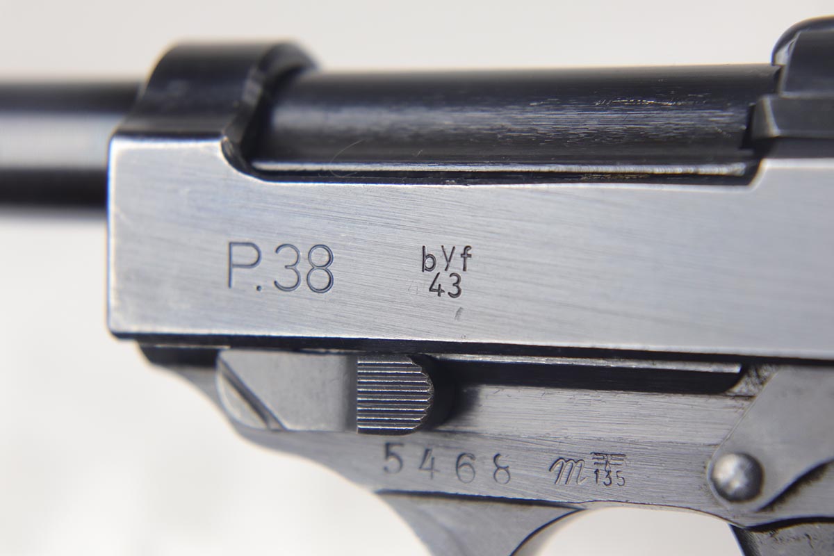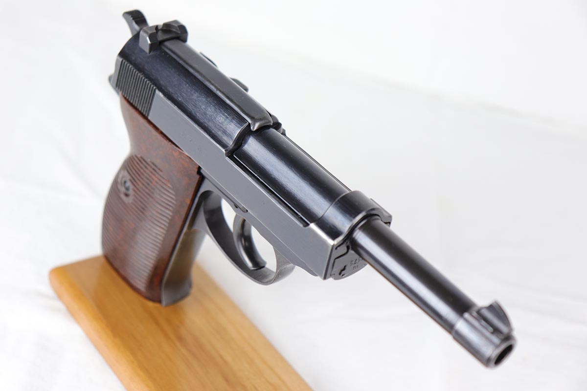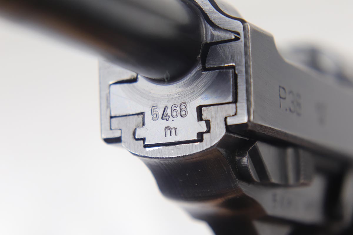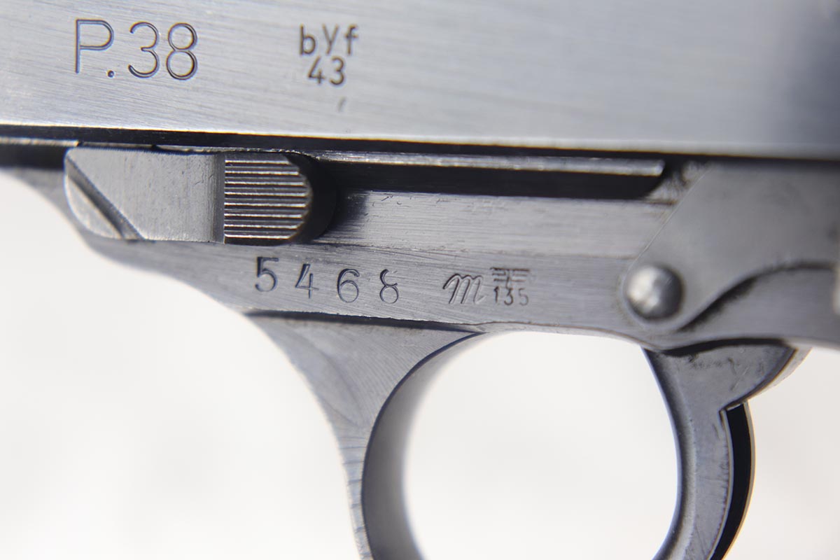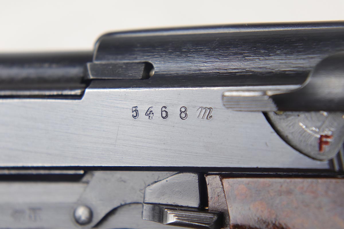 7/26/18 – This is an all matching and original Mauser P.38 from 1943. The original military blue rates in the mid 90s with some thinning on the front strap and muzzle. Excellent reddish grips. Mint bore.