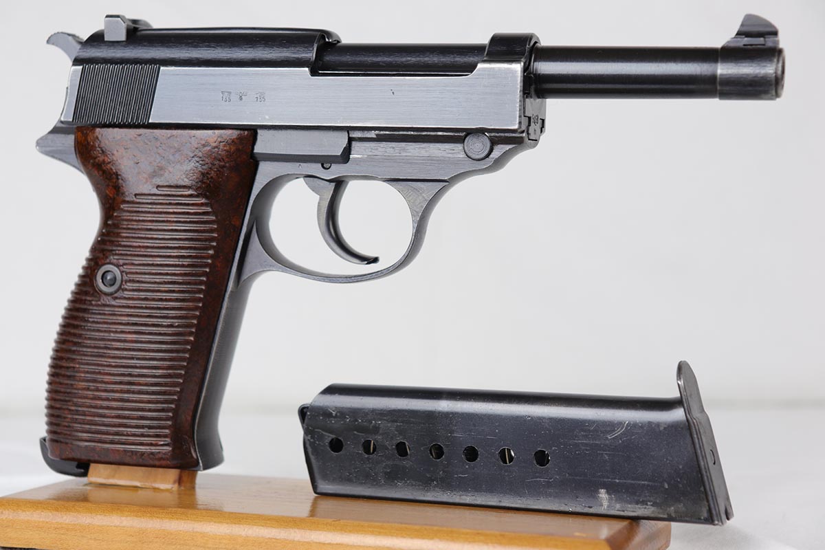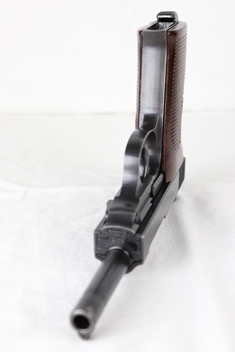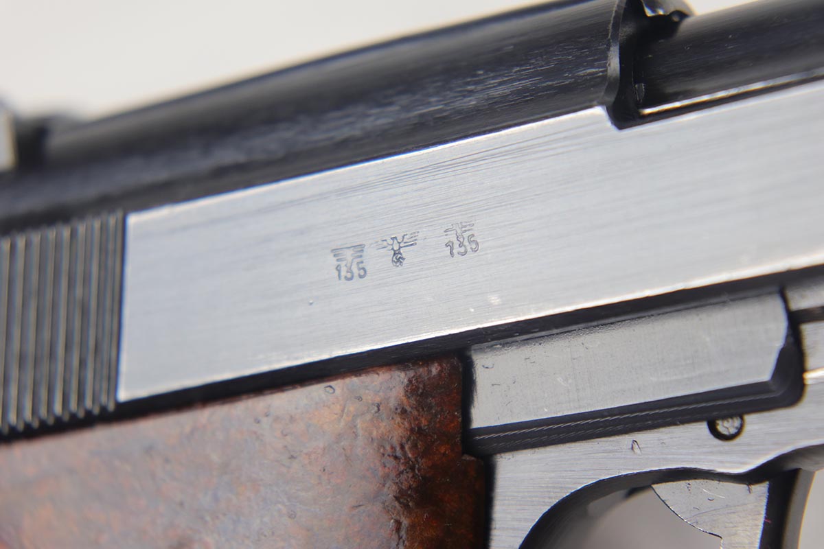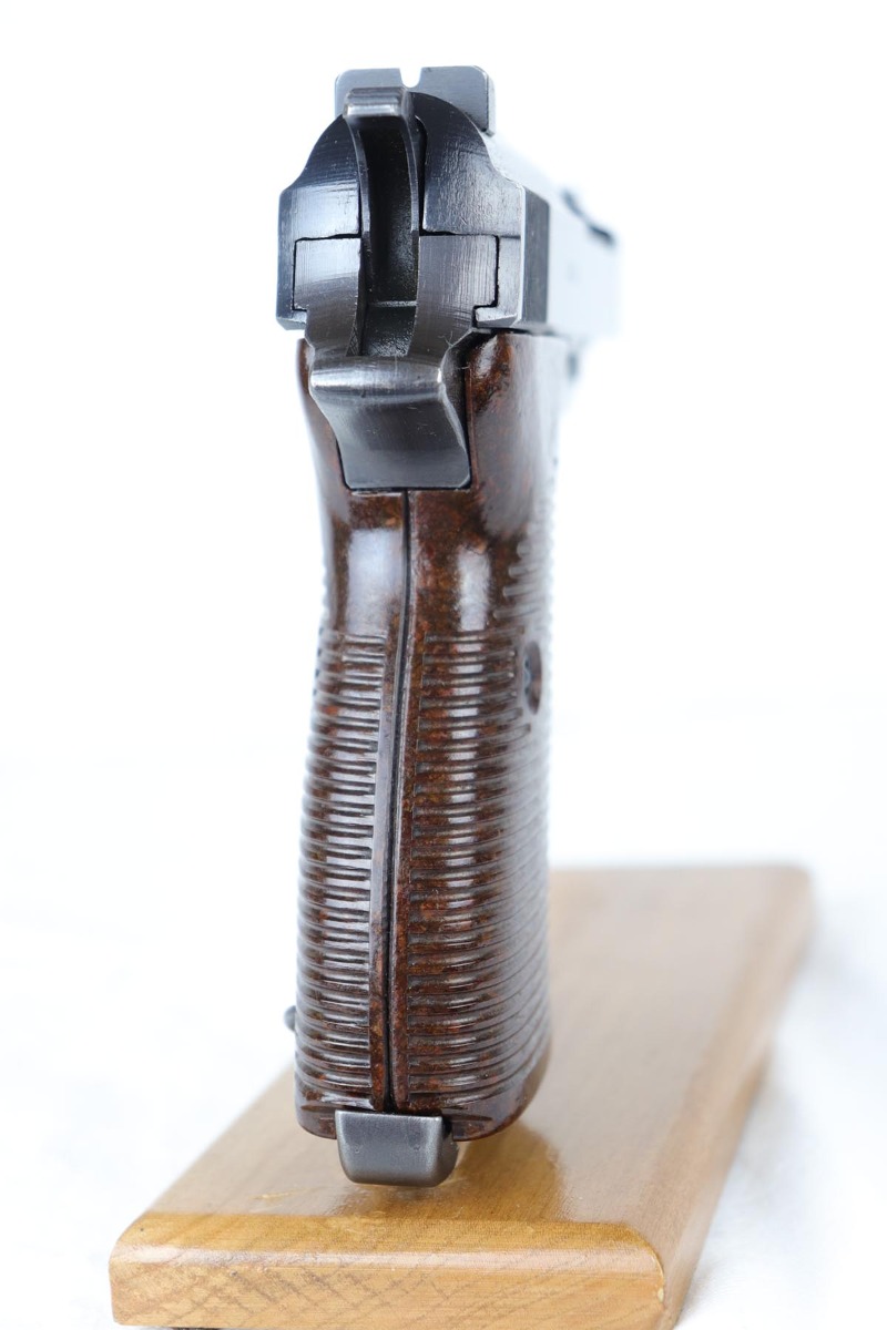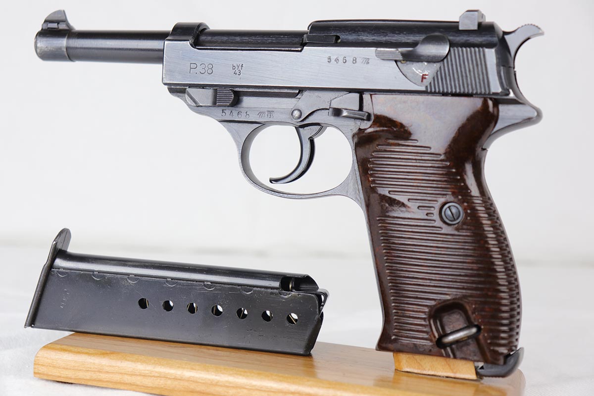 7/26/18 – This is an all matching and original Mauser P.38 from 1943. The original military blue rates in the mid 90s with some thinning on the front strap and muzzle. Excellent reddish grips. Mint bore.