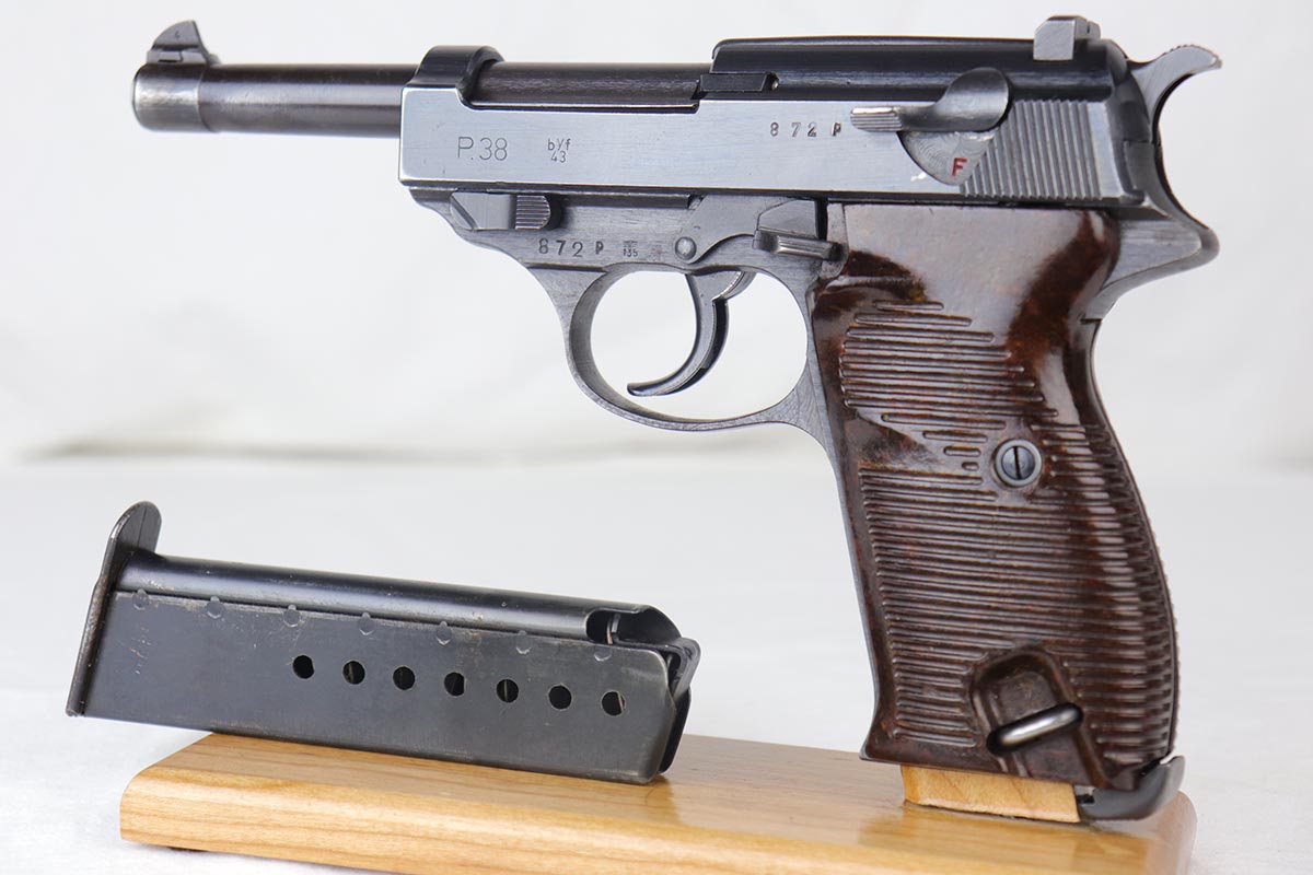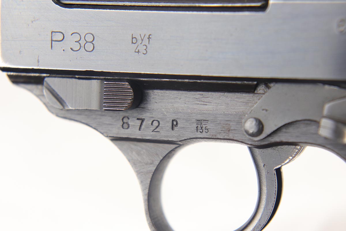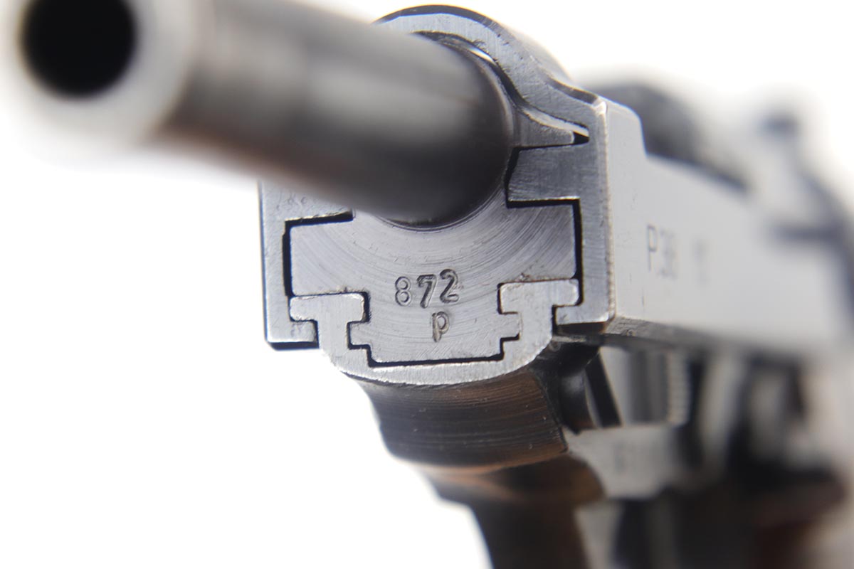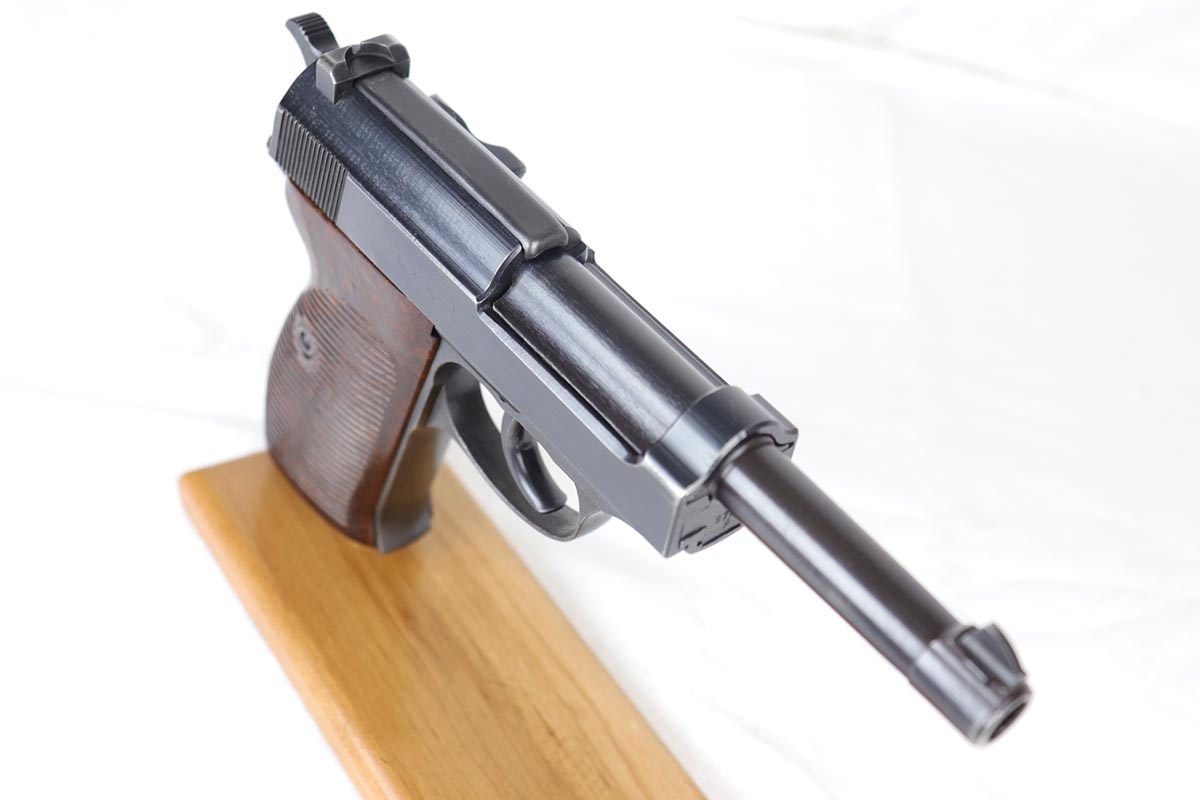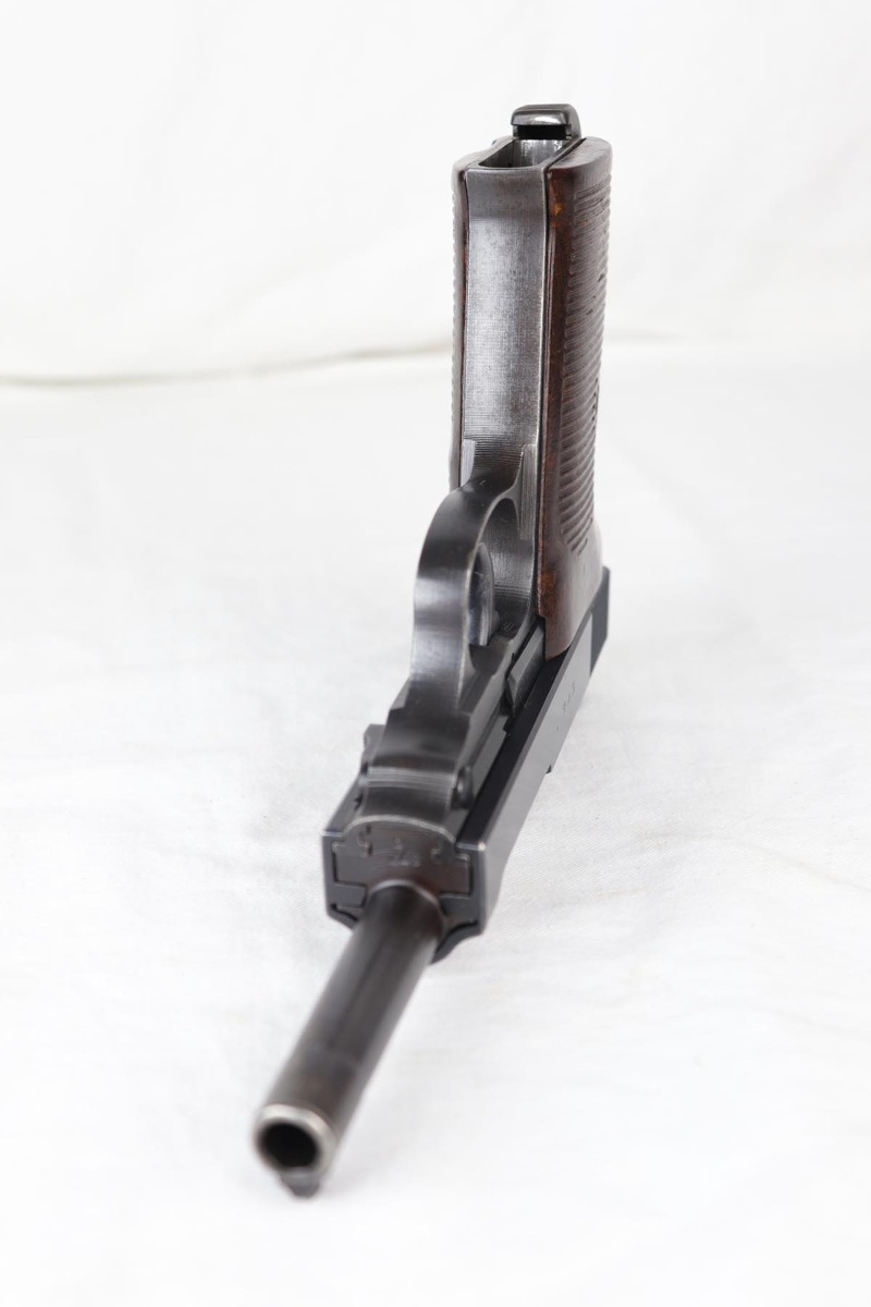7/30/18 – This is a very nice and all matching Mauser P.38 that was made in December of 1943.  It retains about 95% blue with minor muzzle wear and some thinning of the front strap.  Fantastic reddish grips and a minty bore.  Proper mechanics, including de-cocker.  Mauser magazine.