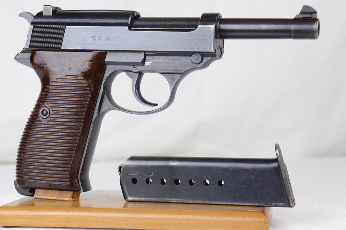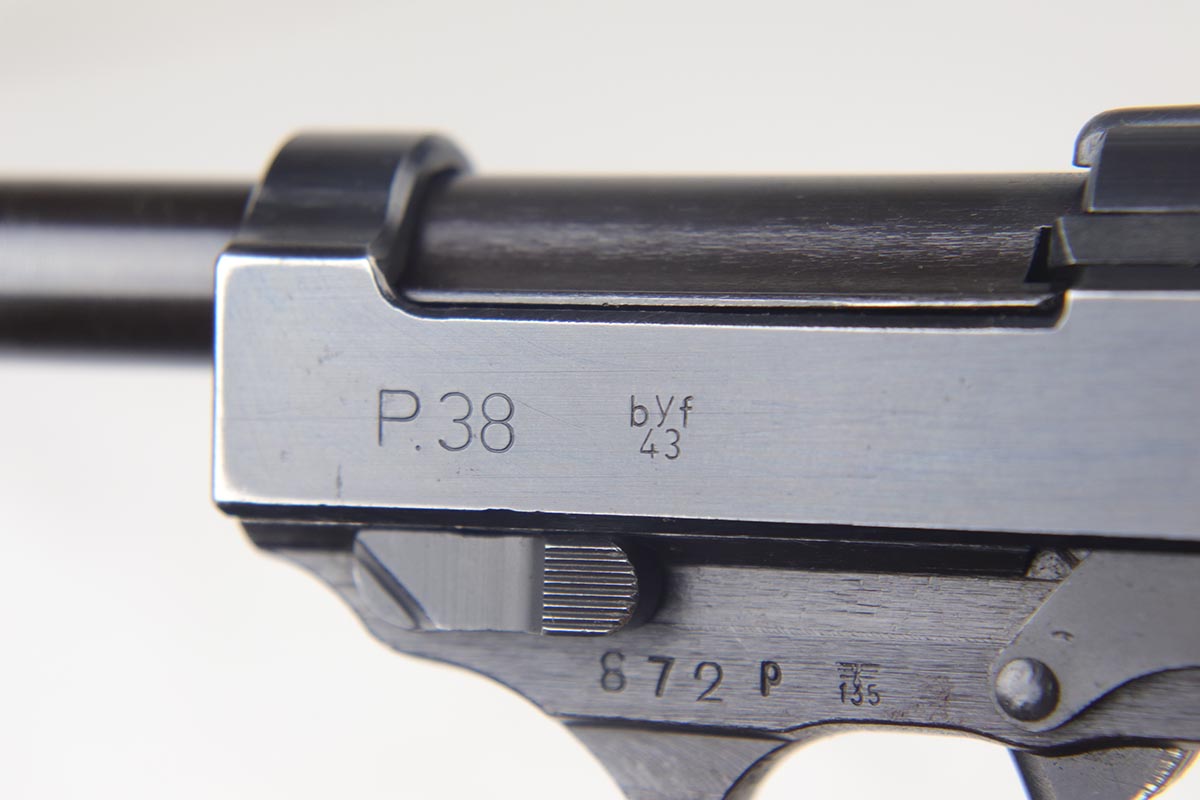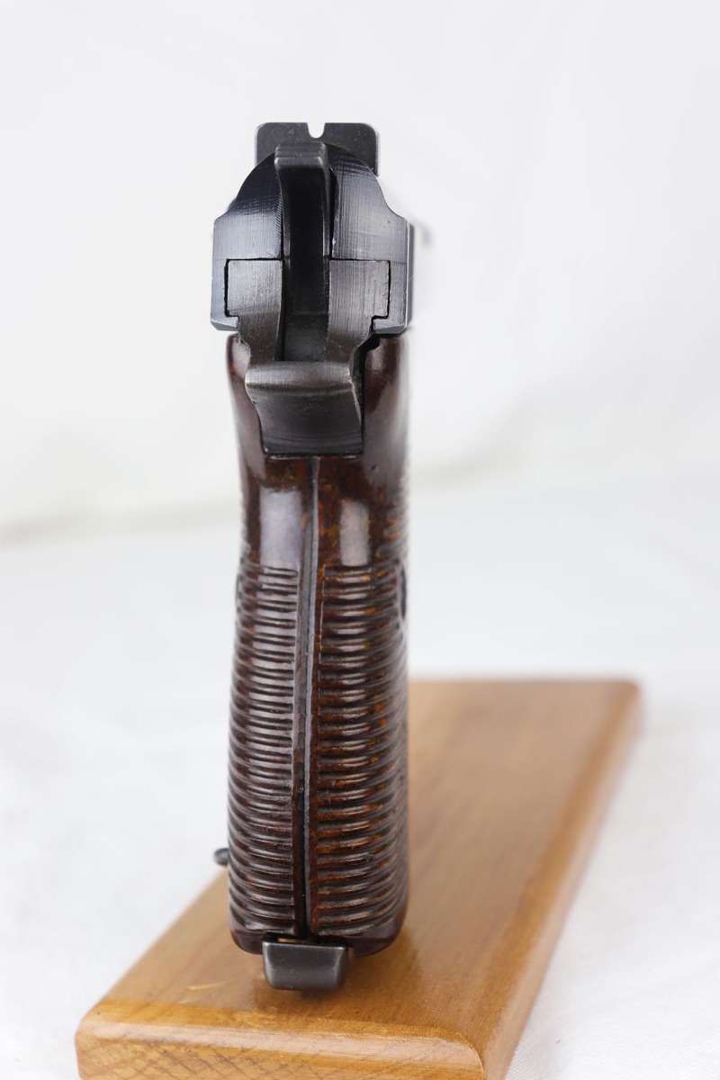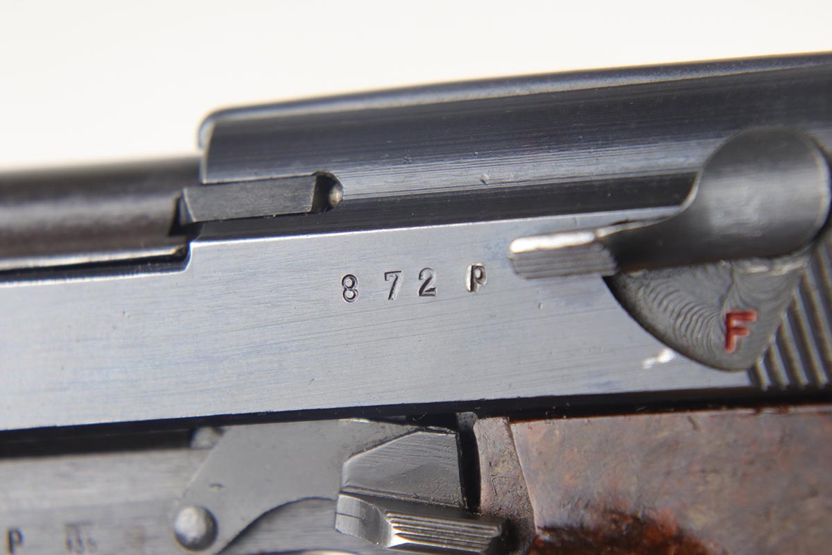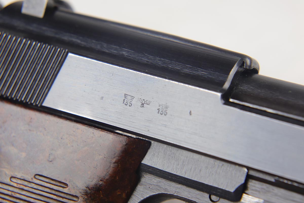 7/30/18 – This is a very nice and all matching Mauser P.38 that was made in December of 1943.  It retains about 95% blue with minor muzzle wear and some thinning of the front strap.  Fantastic reddish grips and a minty bore.  Proper mechanics, including de-cocker.  Mauser magazine.