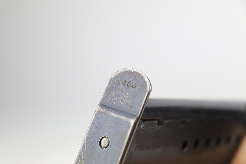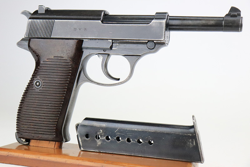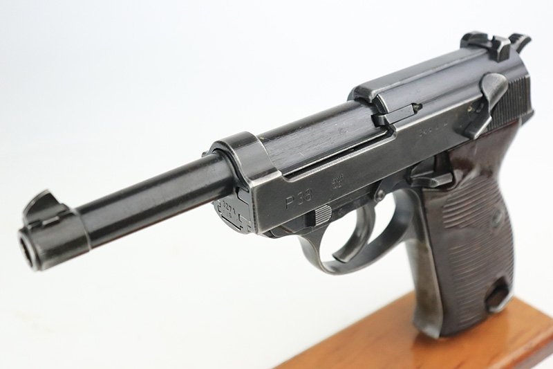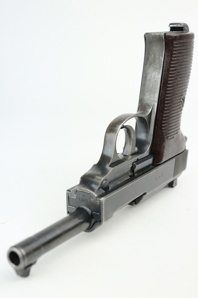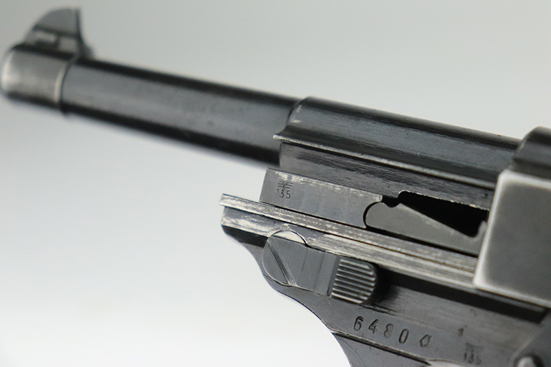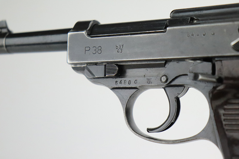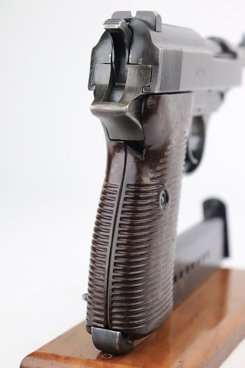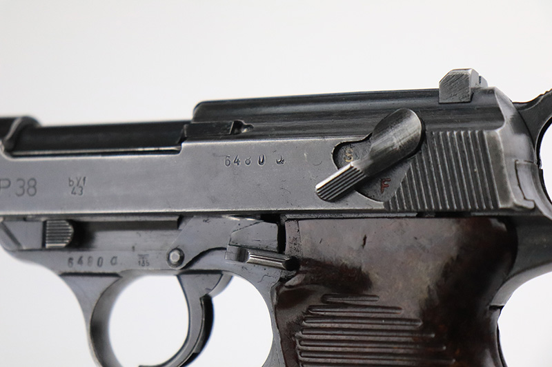 9/16/22 – This is a Mauser P.38 from early 1943 with dust blue finish on slide and frame, but the barrel is a replacement/mismatch. Nice original finish on slide and barrel but some wear on the strap. The barrel does have some pinpricking on both sides though. Bore has strong rifling but minor pitting and frost in the grooves. Original grips but there’s a chip in the back of the right panel. Magazine is numbered and matching on the base but was done postwar. Fully functional, including de-cocker.