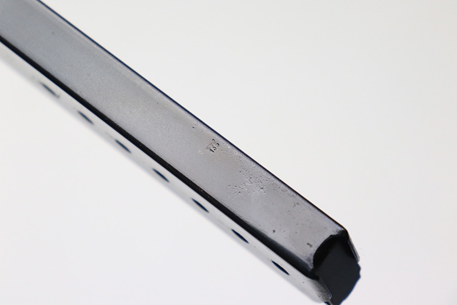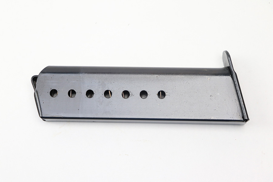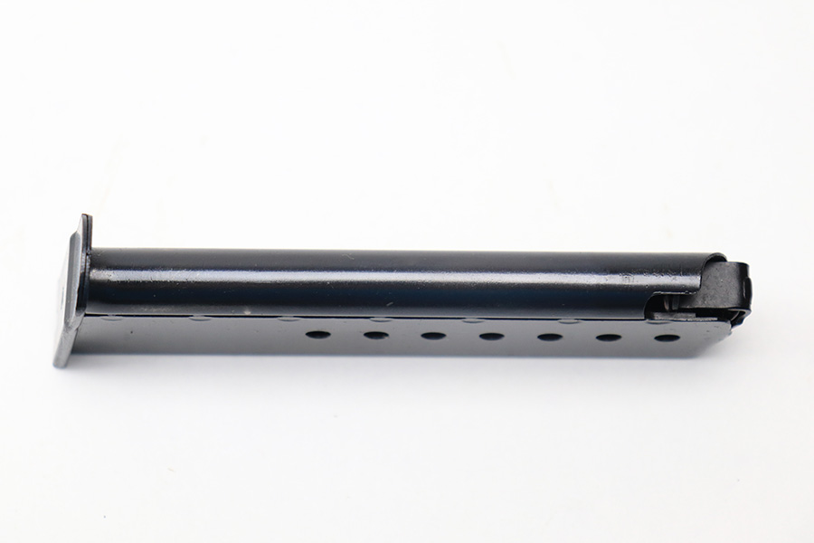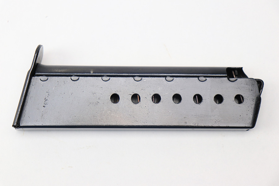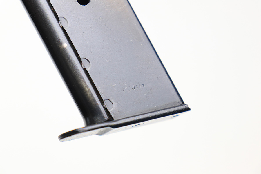 12/1/21 – This is an original WW2 era production Mauser P.38 magazine. The magazine is stamped “P.38v” on the tube, and waffen eagle 135 on the spine. The spine of the magazine also has some mild pitting on the metal that appears blued over. Because of this, we think this is likely an old refinish – the price is reduced accordingly. Strong, functional spring and no rust or pitting.