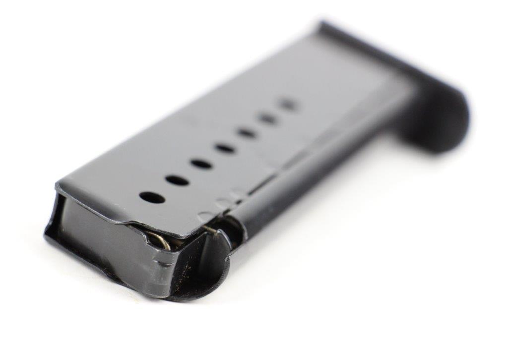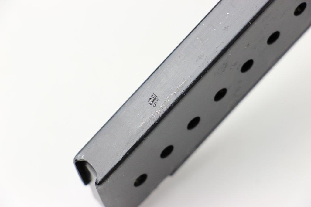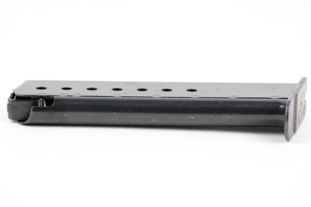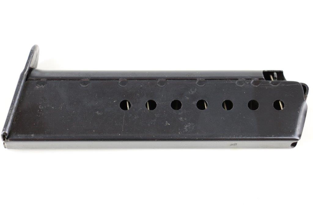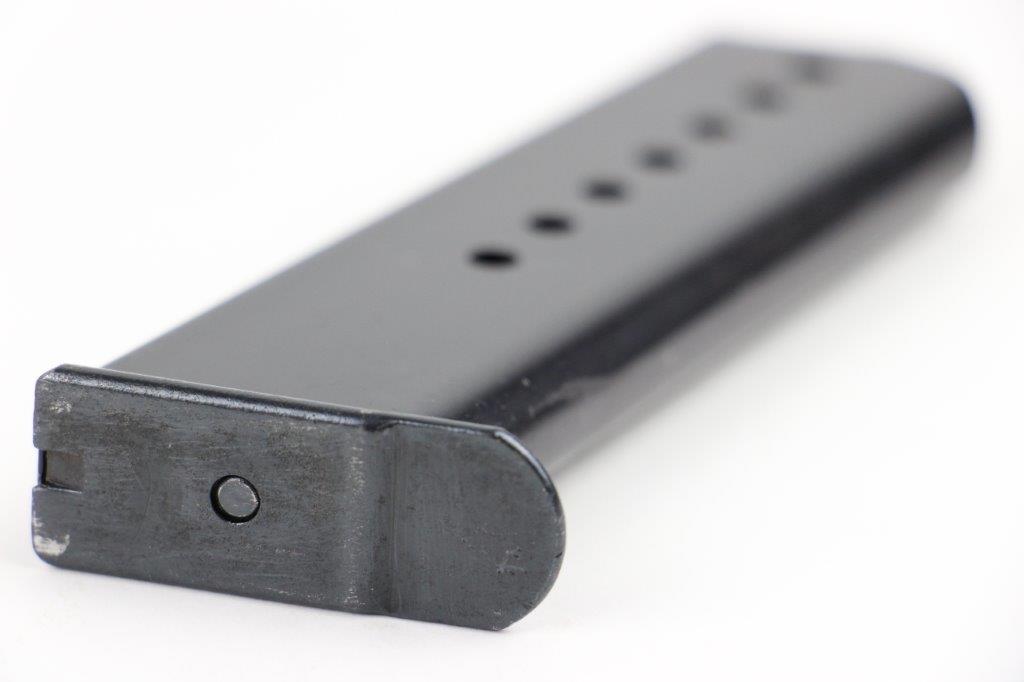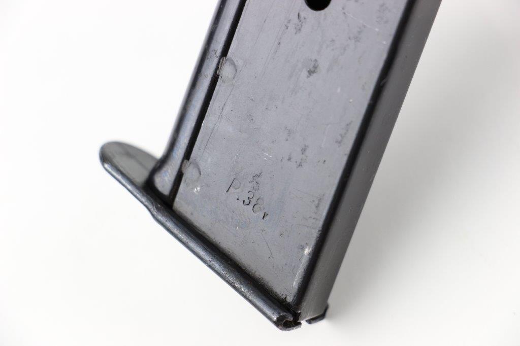 5/28/24 – This is an original WW2 production P.38 magazine by Mauser. The magazine is stamped with a P.38v marking on the left side of the tube, and is military proof stamped with a crisp eagle/135 on the spine. The blued finish is excellent throughout with some light surface patina in a few small spots, but this is minimal. The spring is strong and fully functional. A top-condition example.