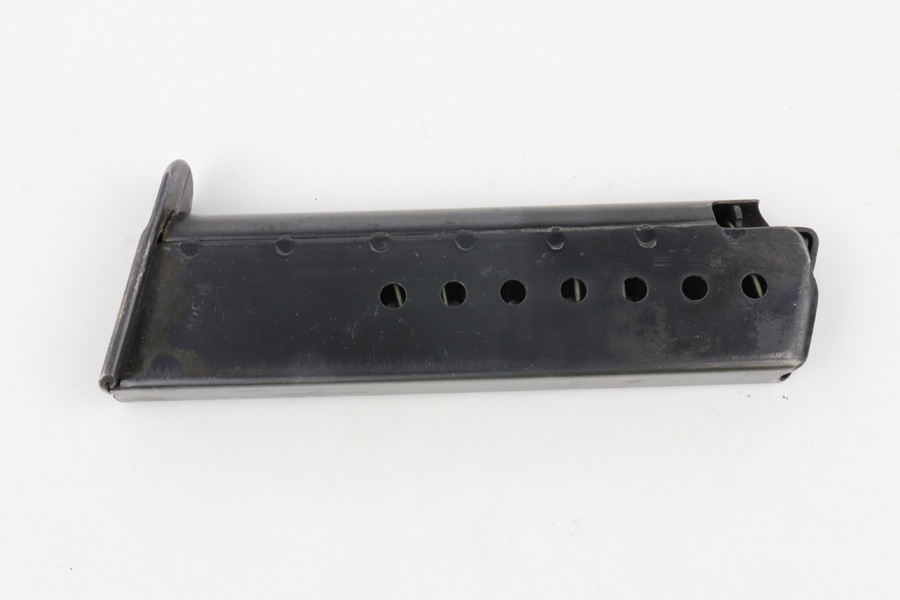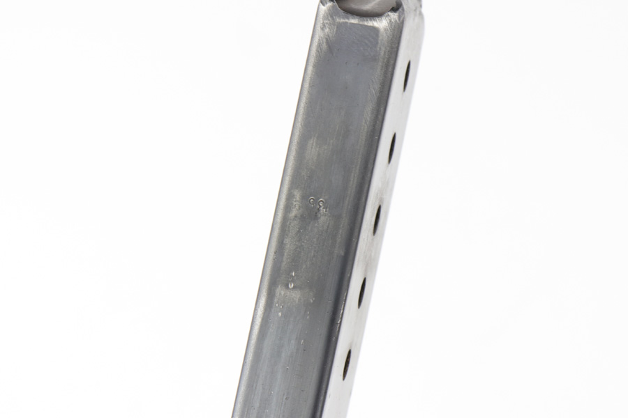 8/5/19 – This is an original WW2 wartime production P.38 magazine. The magazine has an eagle/135 proof on the spine from the Mauser factory, as well as P.38v stamped on the left side of the magazine. Great overall condition with no rust or pitting. Some minor discoloration on the left side of the magazine, but minor overall. Strong fully functional spring.