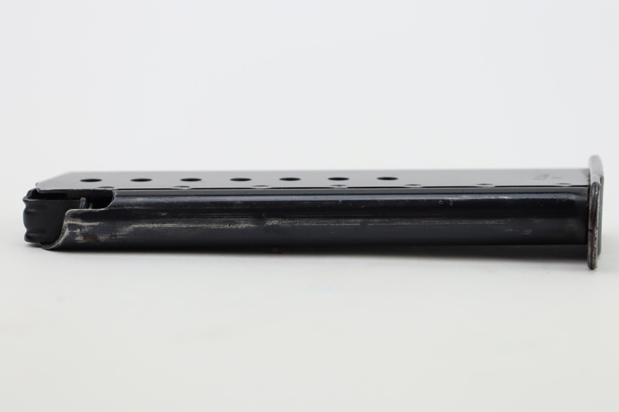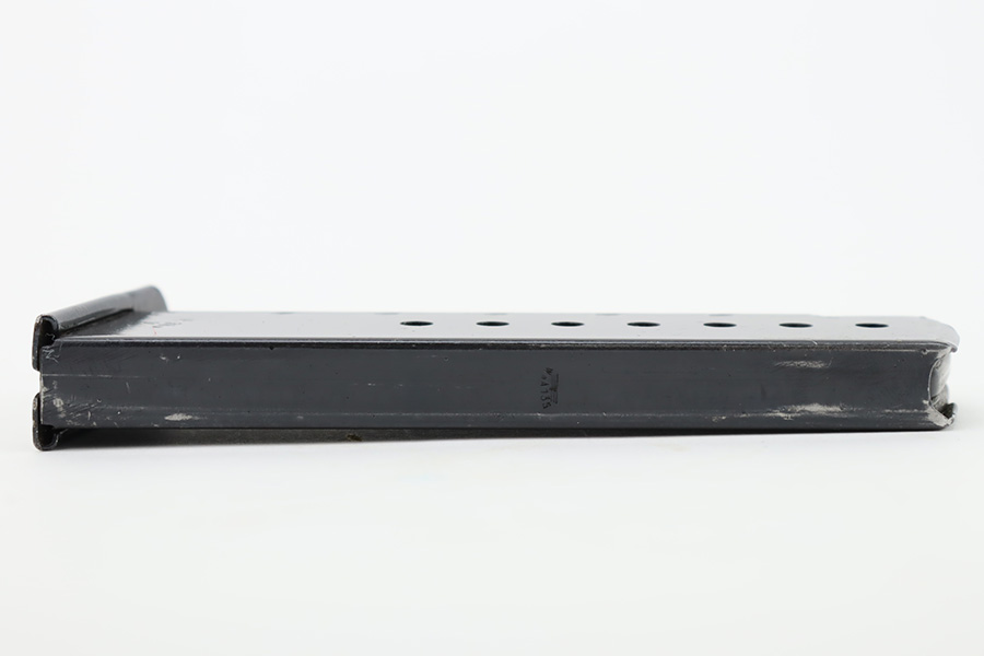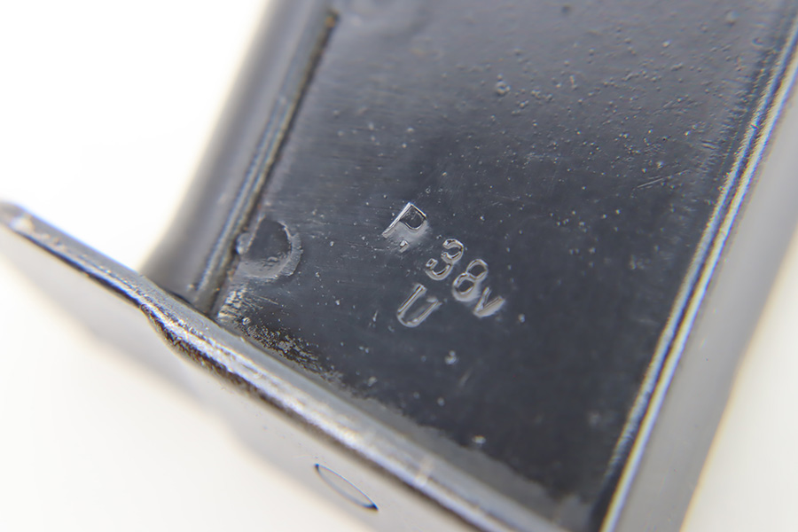 11/14/23 – This is a late WW2 production Mauser P.38 magazine with some rare late-war features. First, the left side of the tube is stamped P.38v with a “U” underneath, for unhardened metal. Second, the spine of the magazine is stamped with a crisp WaA135 military proof stamp (later variation). Third, the magazine follower is ribbed, which is only found with end-of-war examples. Overall in near excellent condition with a fully functional spring.