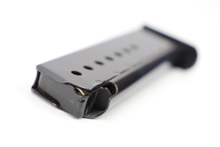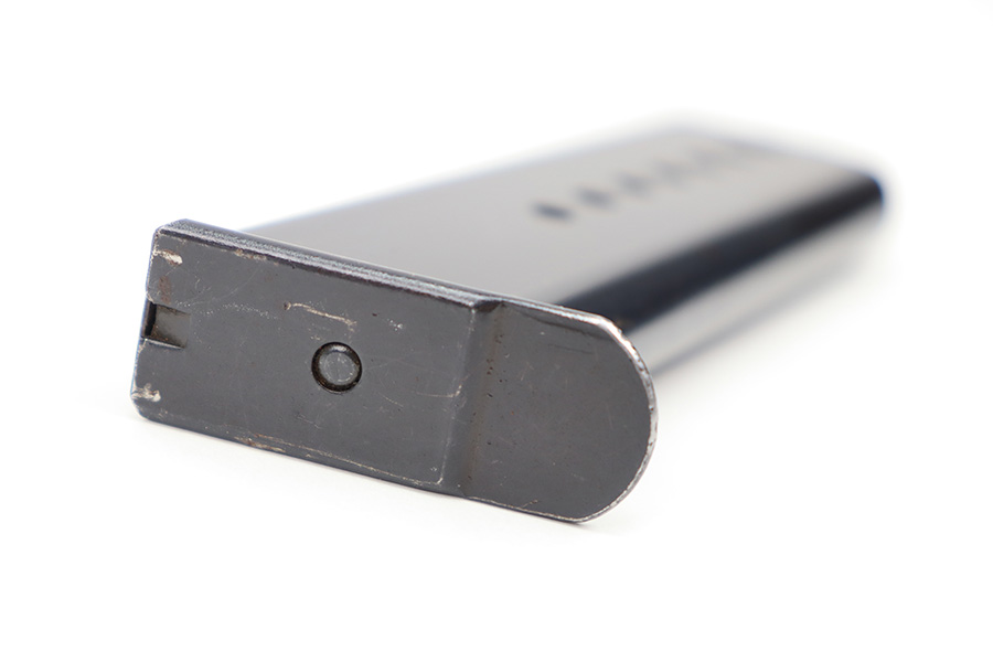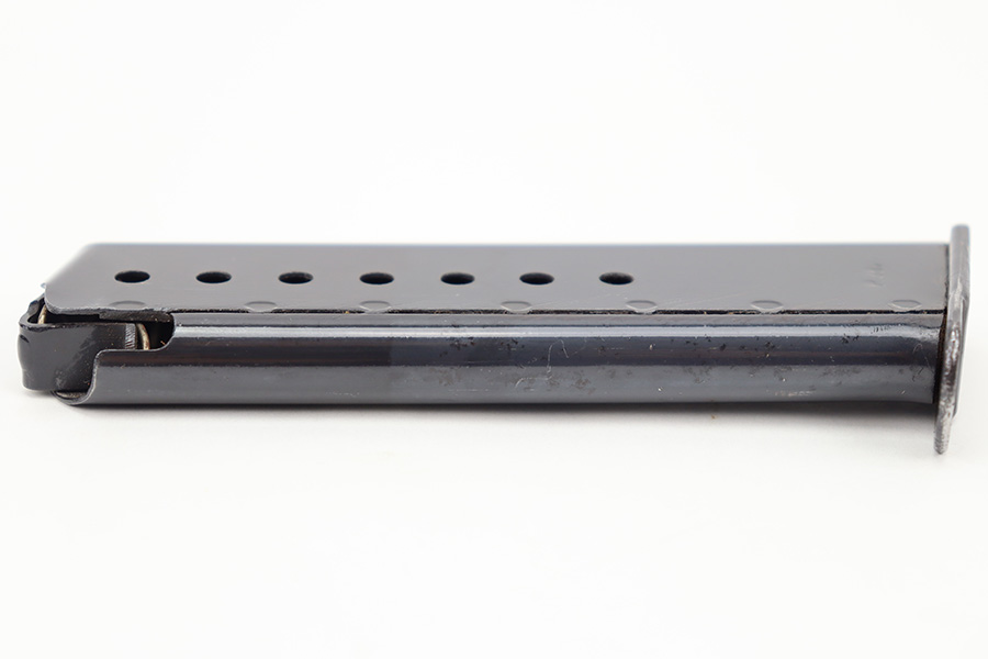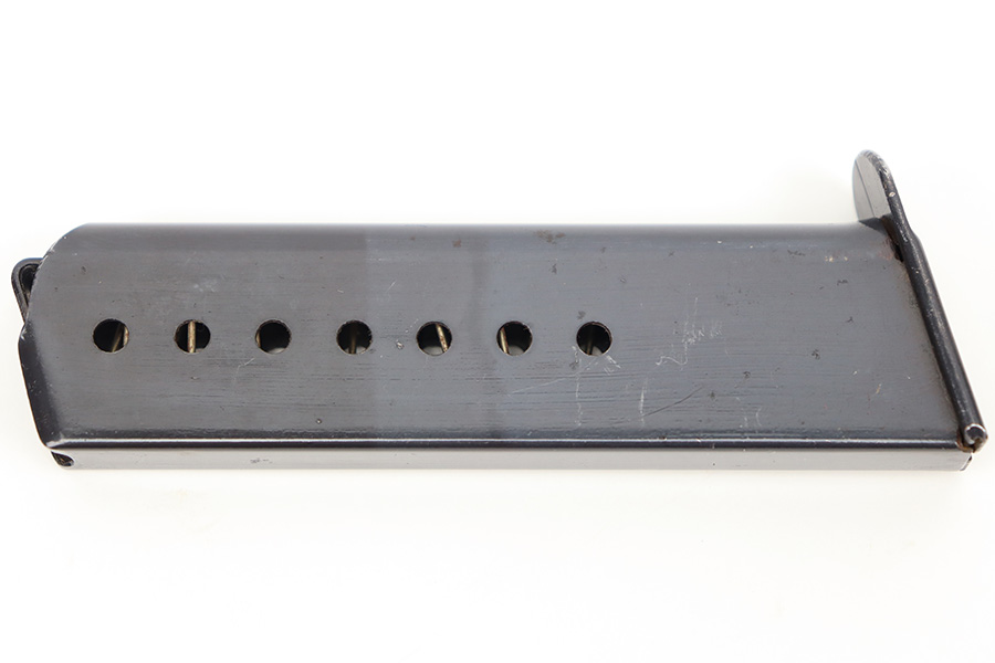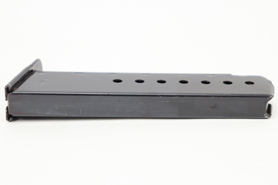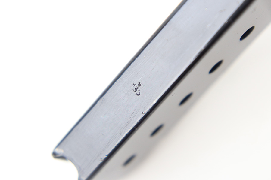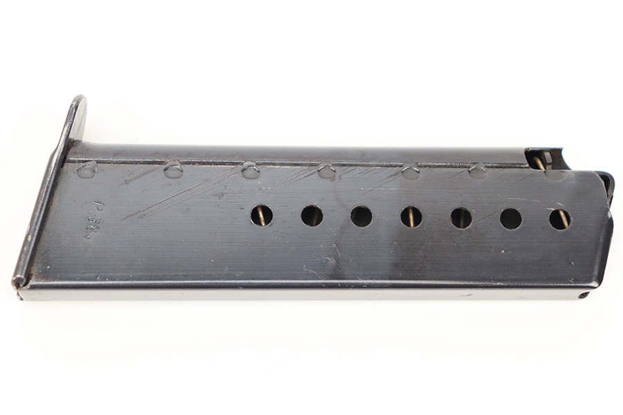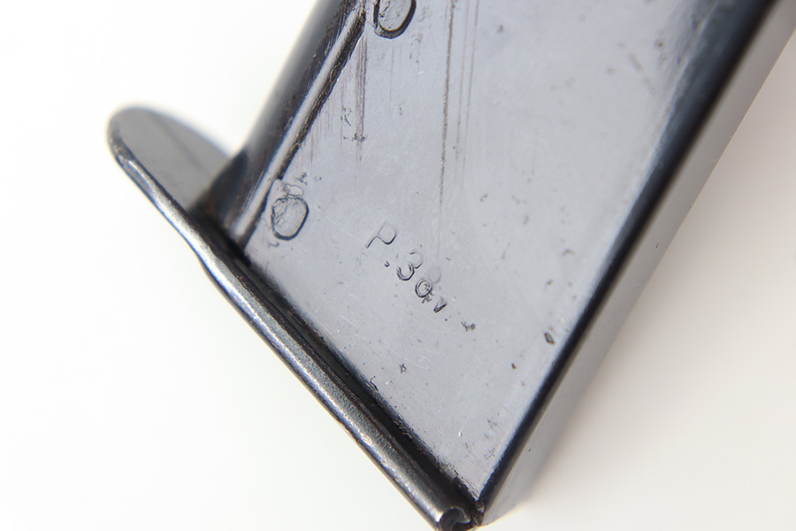 11/20/23 – This is a WW2 wartime production Mauser P.38 magazine. The magazine is in excellent condition with nice bluing throughout. Some light surface scratches and machine marks, but no major issues. No rust or pitting and a fully functional spring. Stamped P.38v on the left side of the tube, and the spine is eagle/135 military proof stamped.