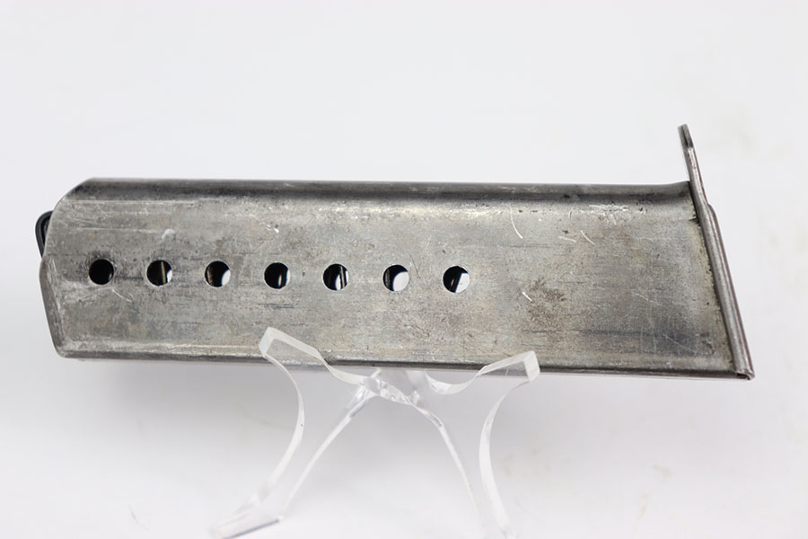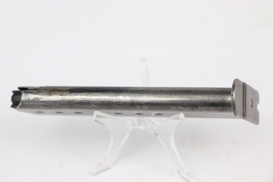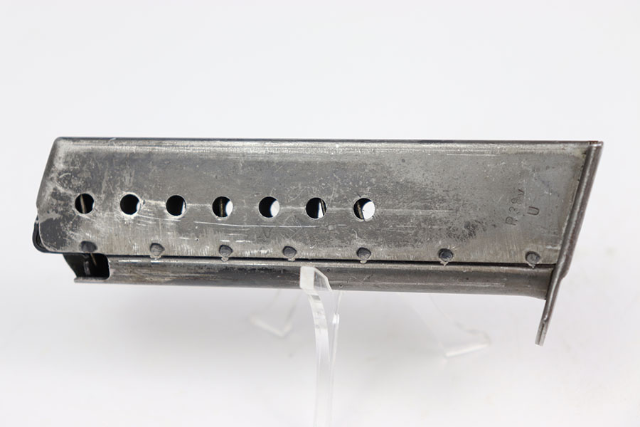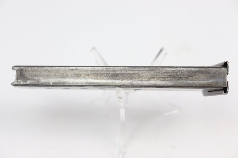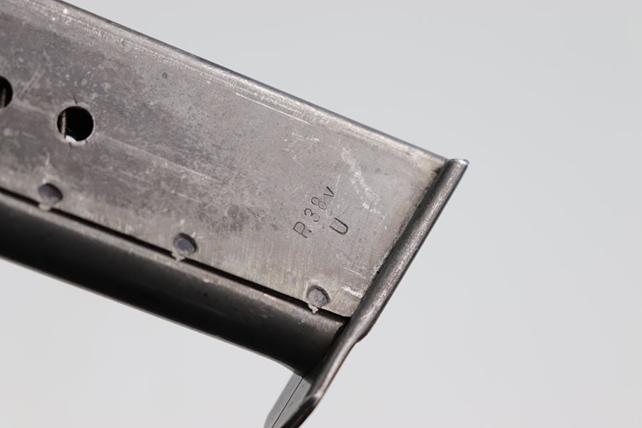 7/24/24 – This is a late WW2 production Mauser P.38 magazine with some rare late-war features. The left side of the tube is stamped P.38v with a “U” underneath, for unhardened metal. Third, the magazine follower is ribbed, which is only found with end-of-war examples. Not having military proofs could mean two things, the magazine was manufactured for the commercial market (police) or the inspection stamp was simply left off at the end of the war. Overall in near great condition with some discoloration and moderate amounts of wear. Has a fully functional spring.