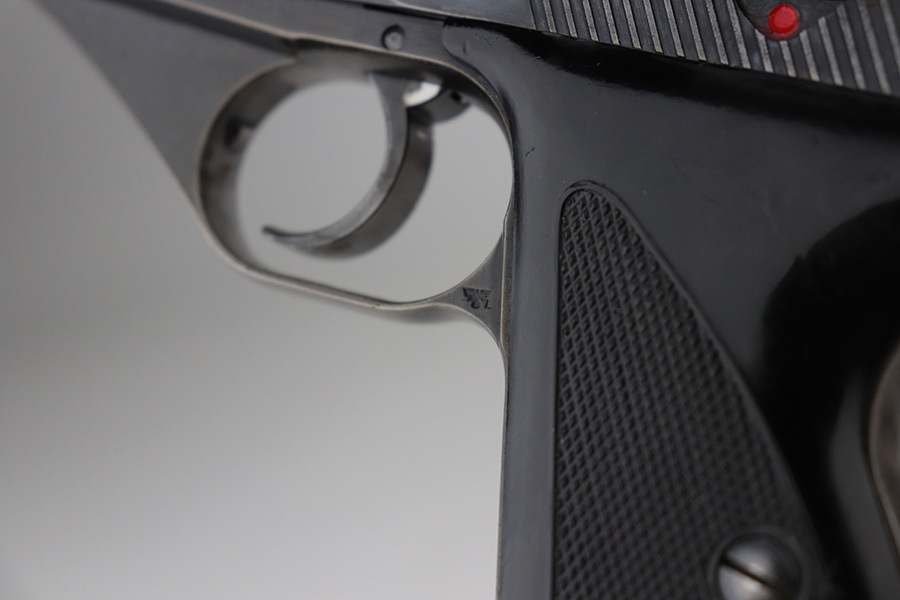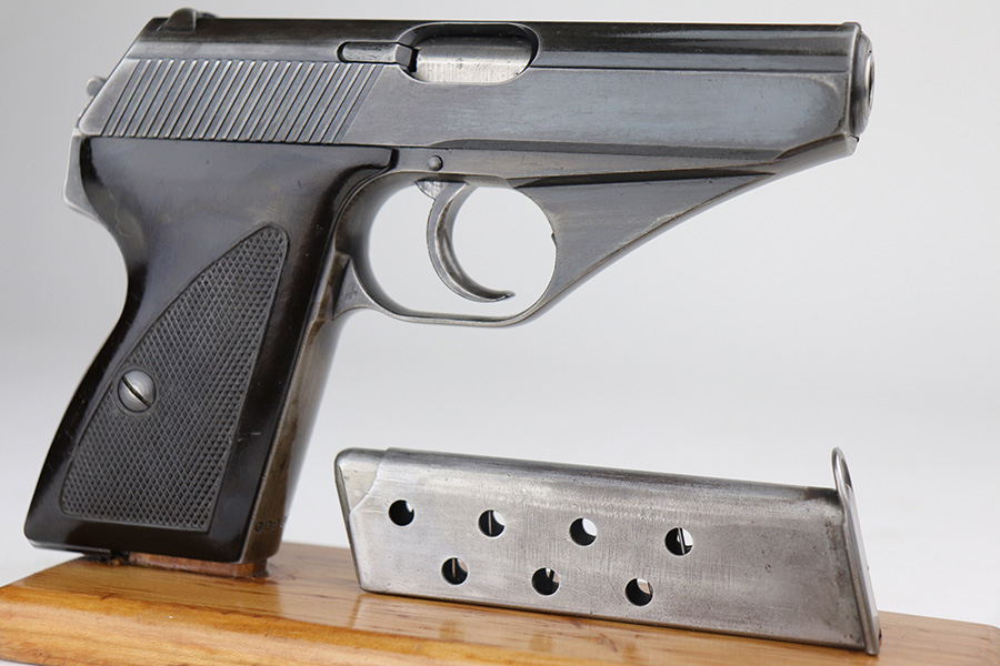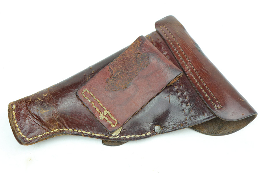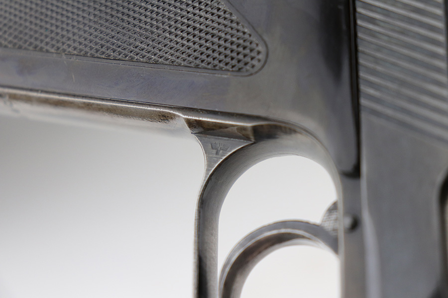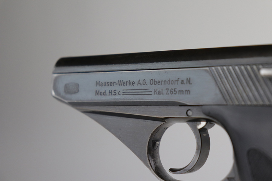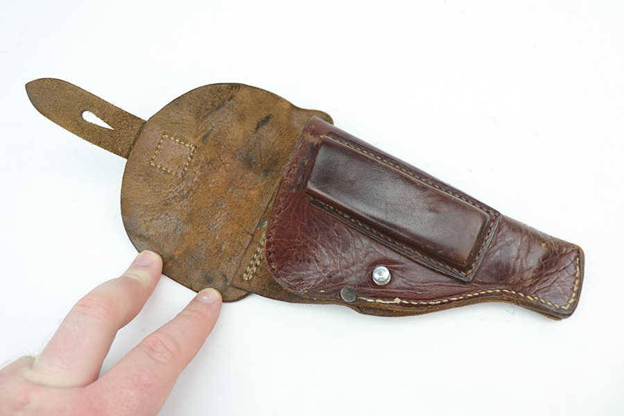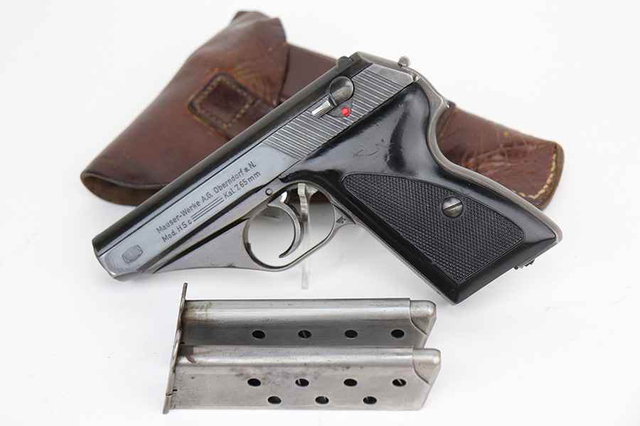 4/8/22 – This is a nice example of a Mauser HSC that was issued to the Nazi Police Force in 1944. It is all matching and has the proper Nazi police “Eagle L” proof on the left side of the trigger guard. Comes with two period-correct magazines and a period-correct un-marked brown leather holster (it looks like the belt loop was replaced and re-stitched). It also comes with a set of rare late-war bakelite grips, correct for 1944. The gun has retained roughly 75% of its blued finish. There is splotchy wear and discoloration and wear throughout, most noticeable on the straps and underside of the frame. There is noticeable scratchy wear along the the round edges of the slide. There is also wear on the high edges of the slide and around the muzzle. The bore is mint – shiny with strong rifling.