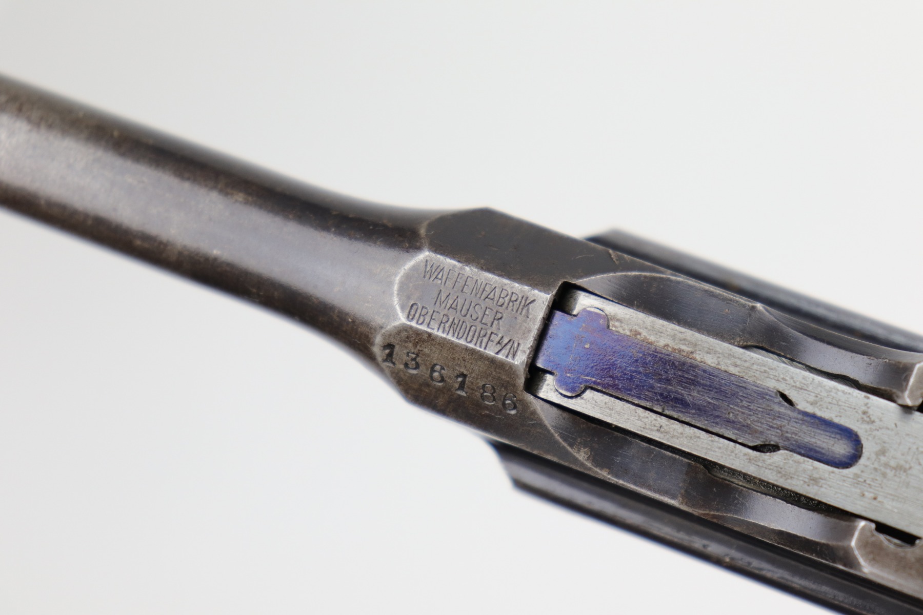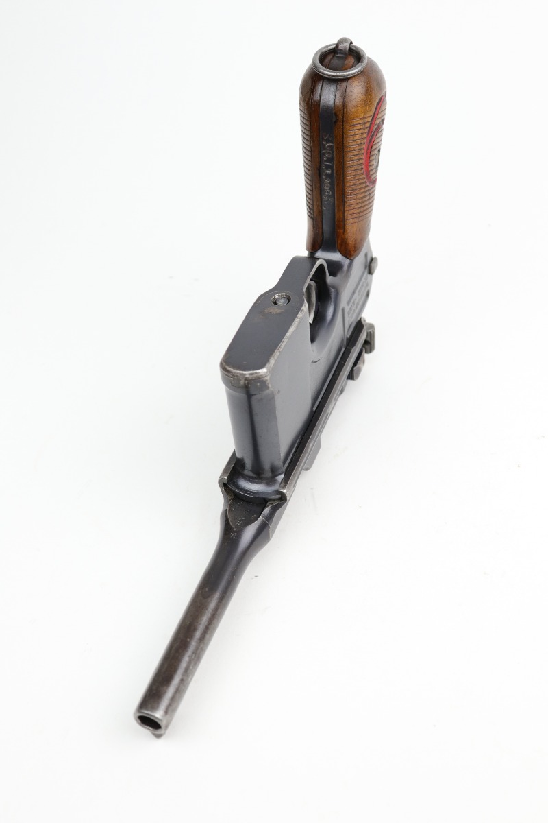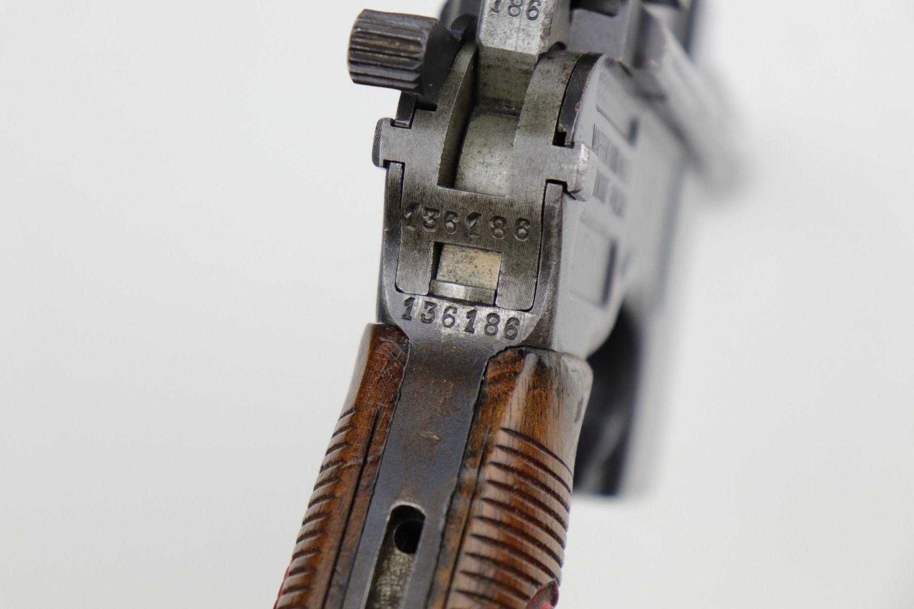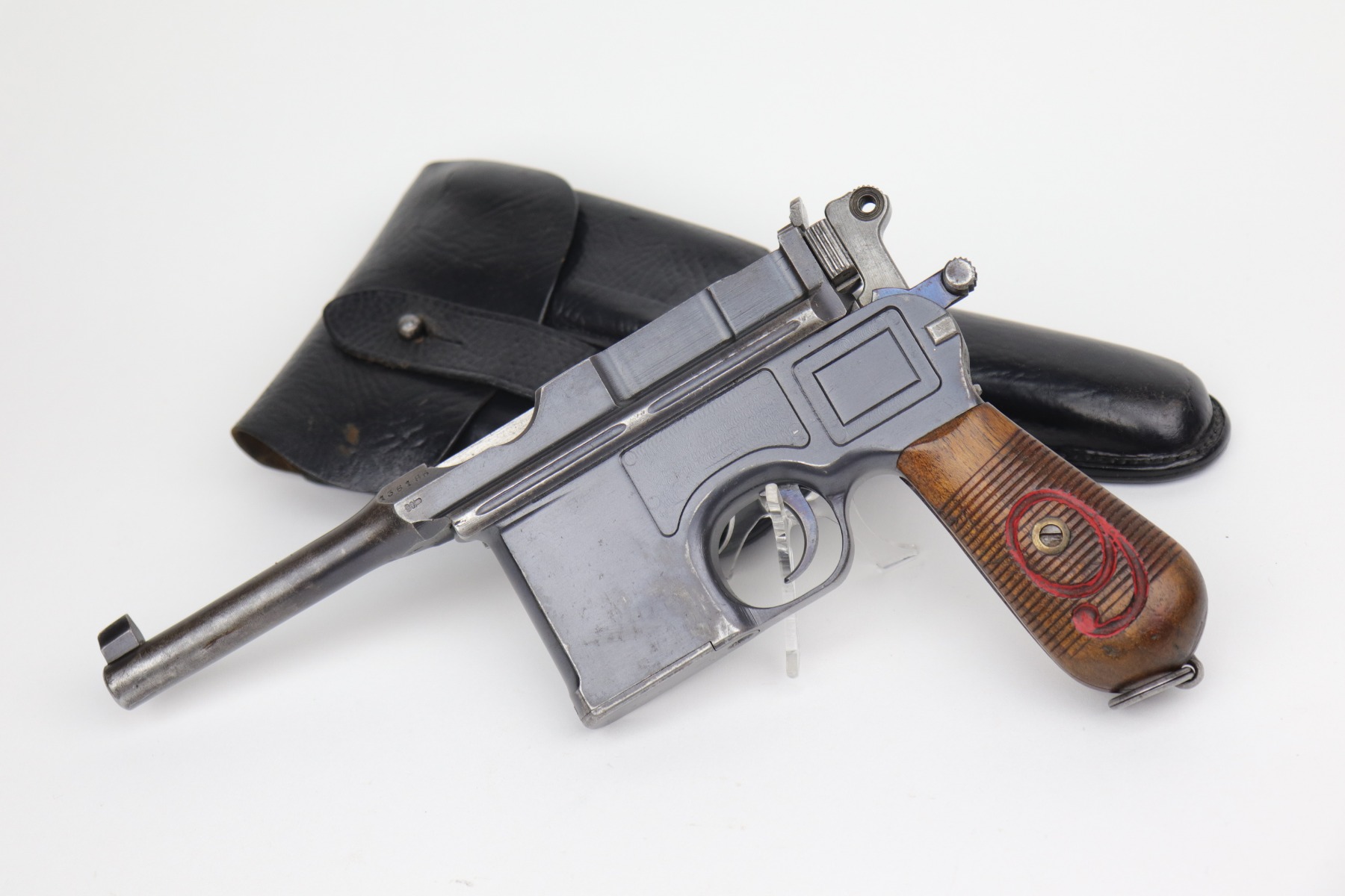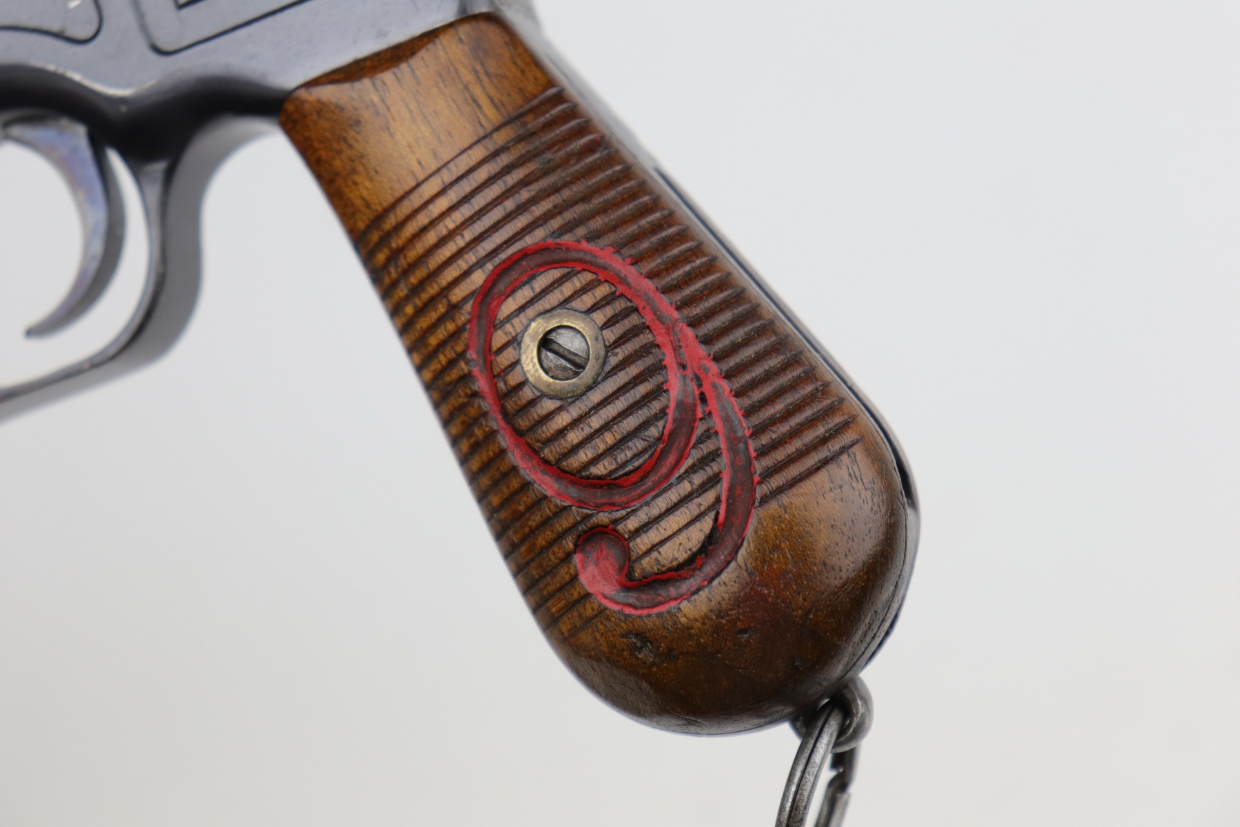 8/23/24 – This is a very nice example of an original Mauser C96 “Red 9” Broomhandle rig that was sent to a German Police department after the war. In accordance with stipulations of the Versailles Treaty, these pistols were modified to have their barrels shortened and tangent sight removed, then many were issued to German Police arsenals. They are far less commonly seen in this configuration than in original design. The gun is all matching except the grips. The pistol is chambered for 9mm. It has retained about 85% of its original finish. There is spotty wear on the barrel and on some of the high edges. There is a unit marking on the front strap, and also on the holster. It comes with the original holster, which is also difficult to find. The bore is very nice – shiny with strong rifling.