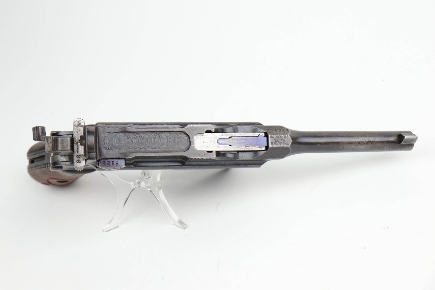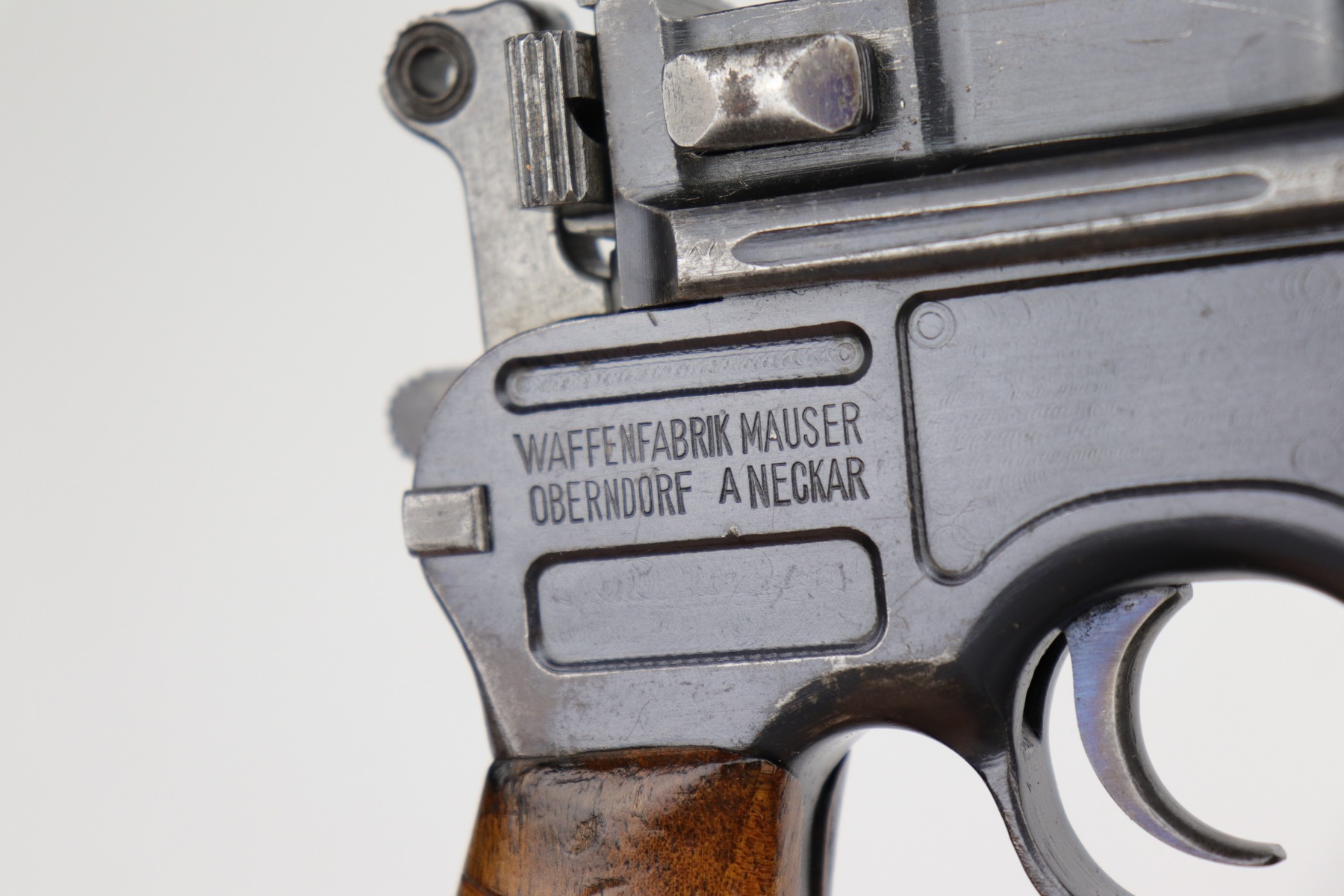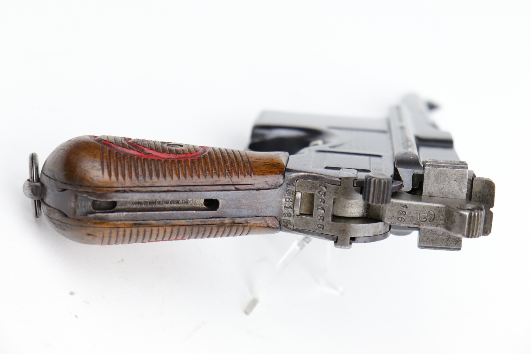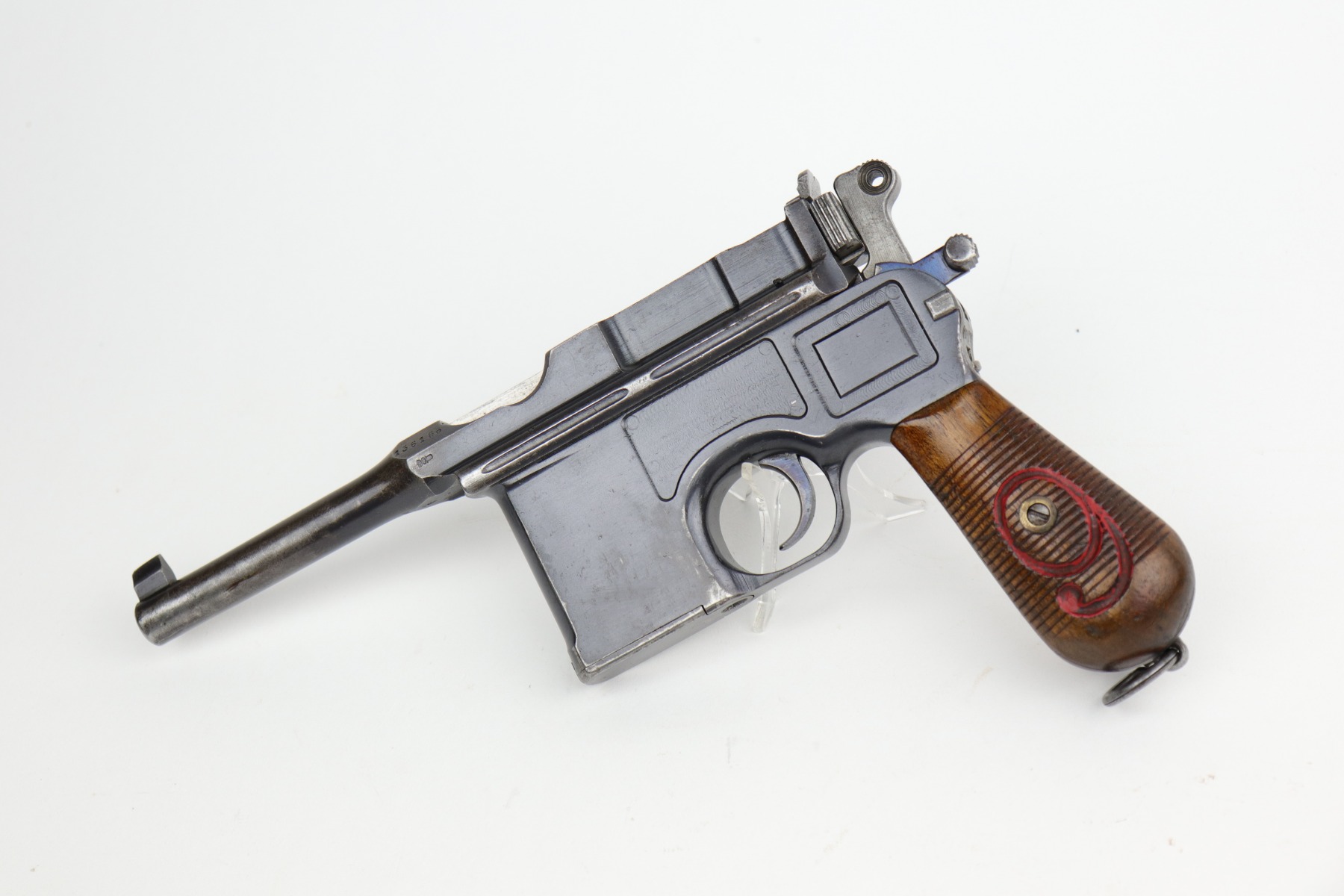 8/23/24 – This is a very nice example of an original Mauser C96 “Red 9” Broomhandle rig that was sent to a German Police department after the war. In accordance with stipulations of the Versailles Treaty, these pistols were modified to have their barrels shortened and tangent sight removed, then many were issued to German Police arsenals. They are far less commonly seen in this configuration than in original design. The gun is all matching except the grips. The pistol is chambered for 9mm. It has retained about 85% of its original finish. There is spotty wear on the barrel and on some of the high edges. There is a unit marking on the front strap, and also on the holster. It comes with the original holster, which is also difficult to find. The bore is very nice – shiny with strong rifling.