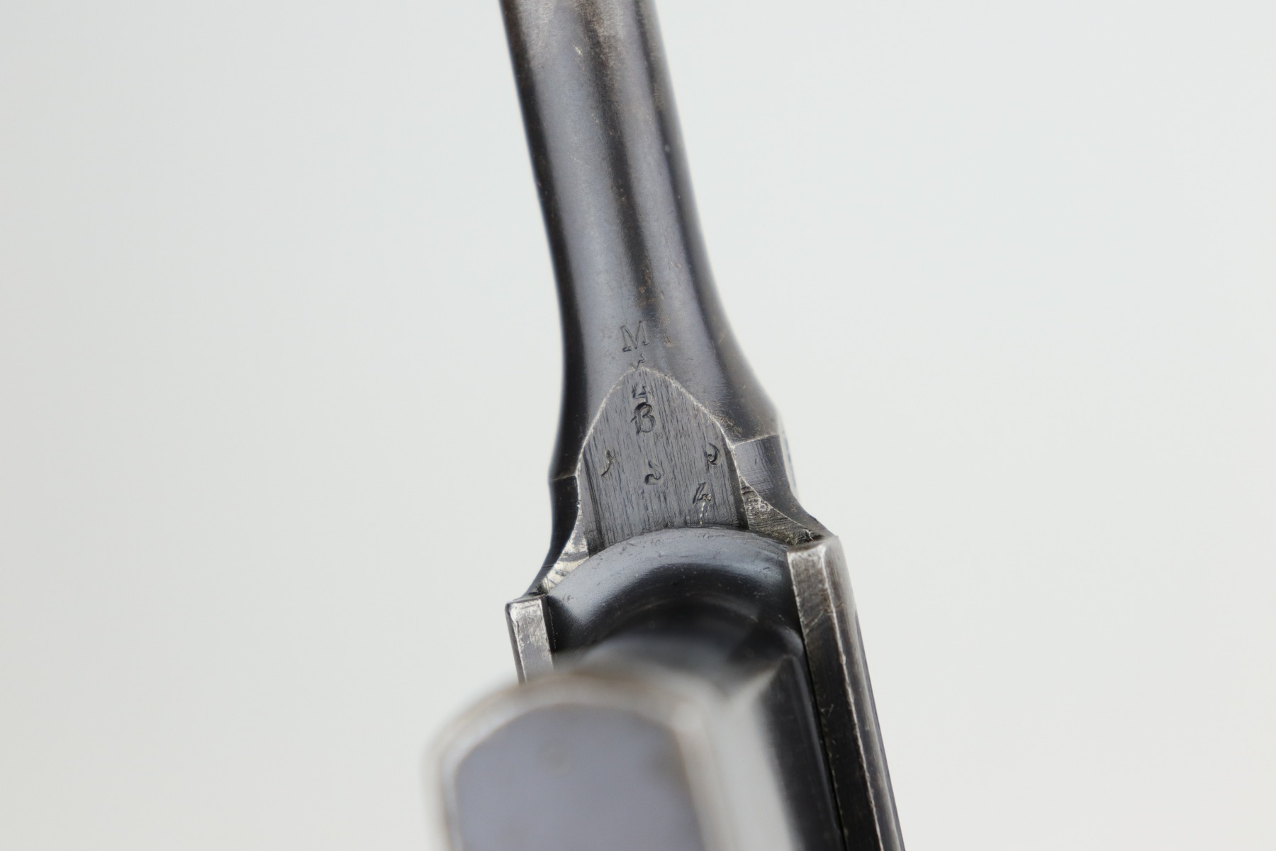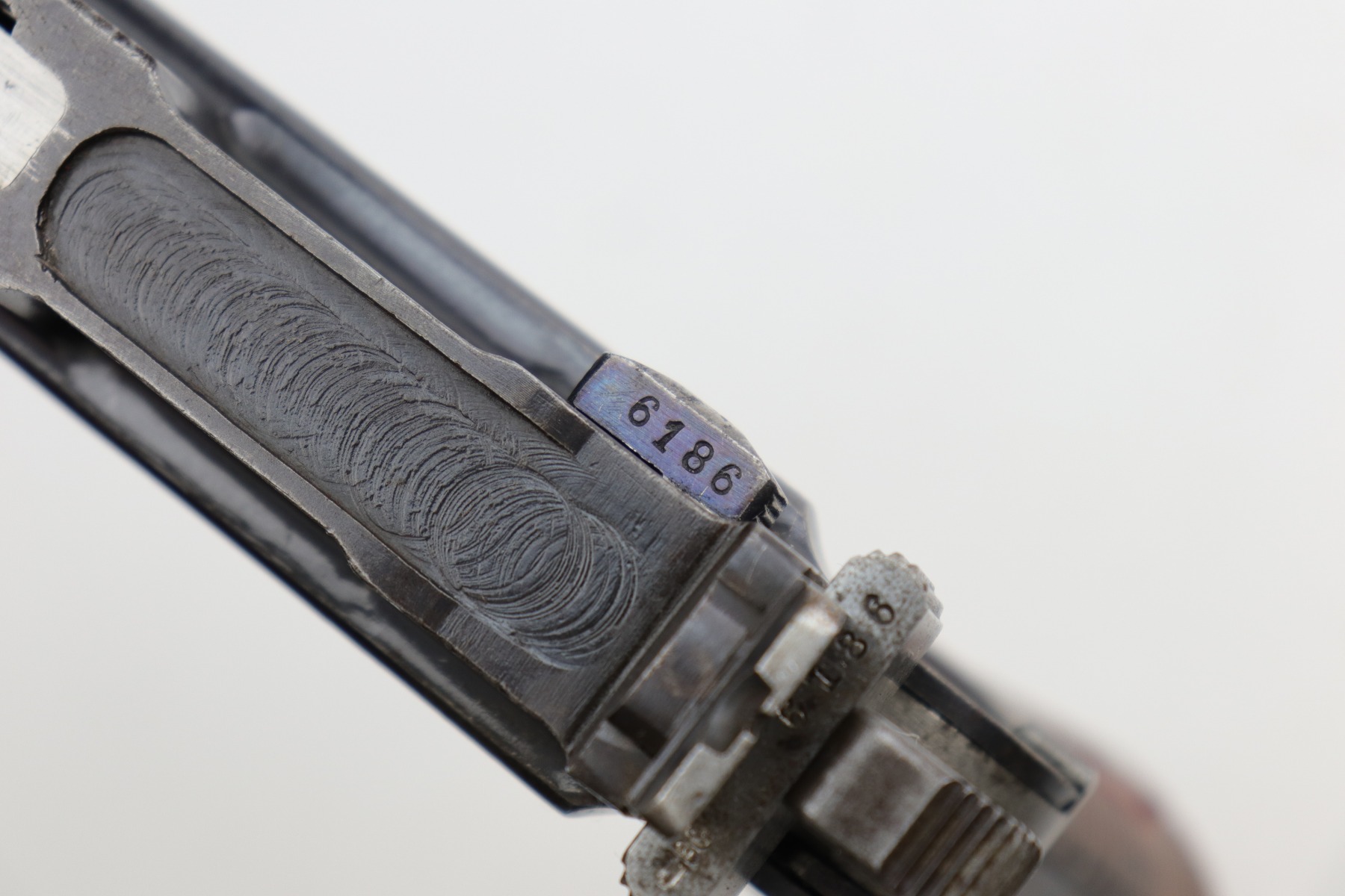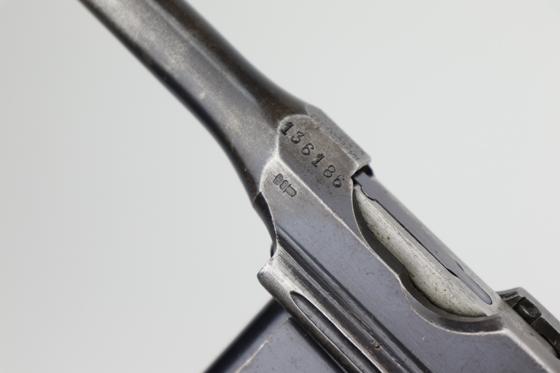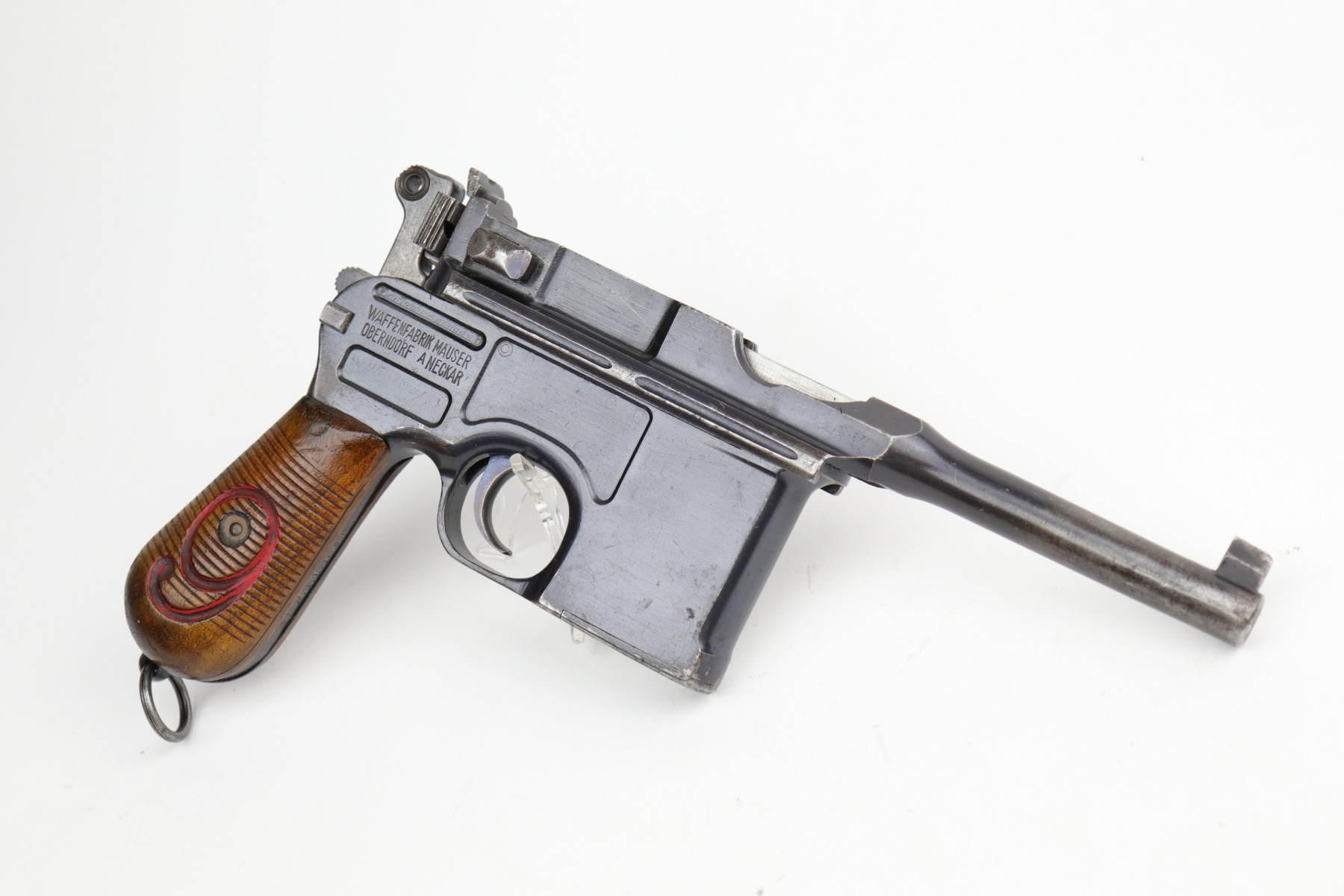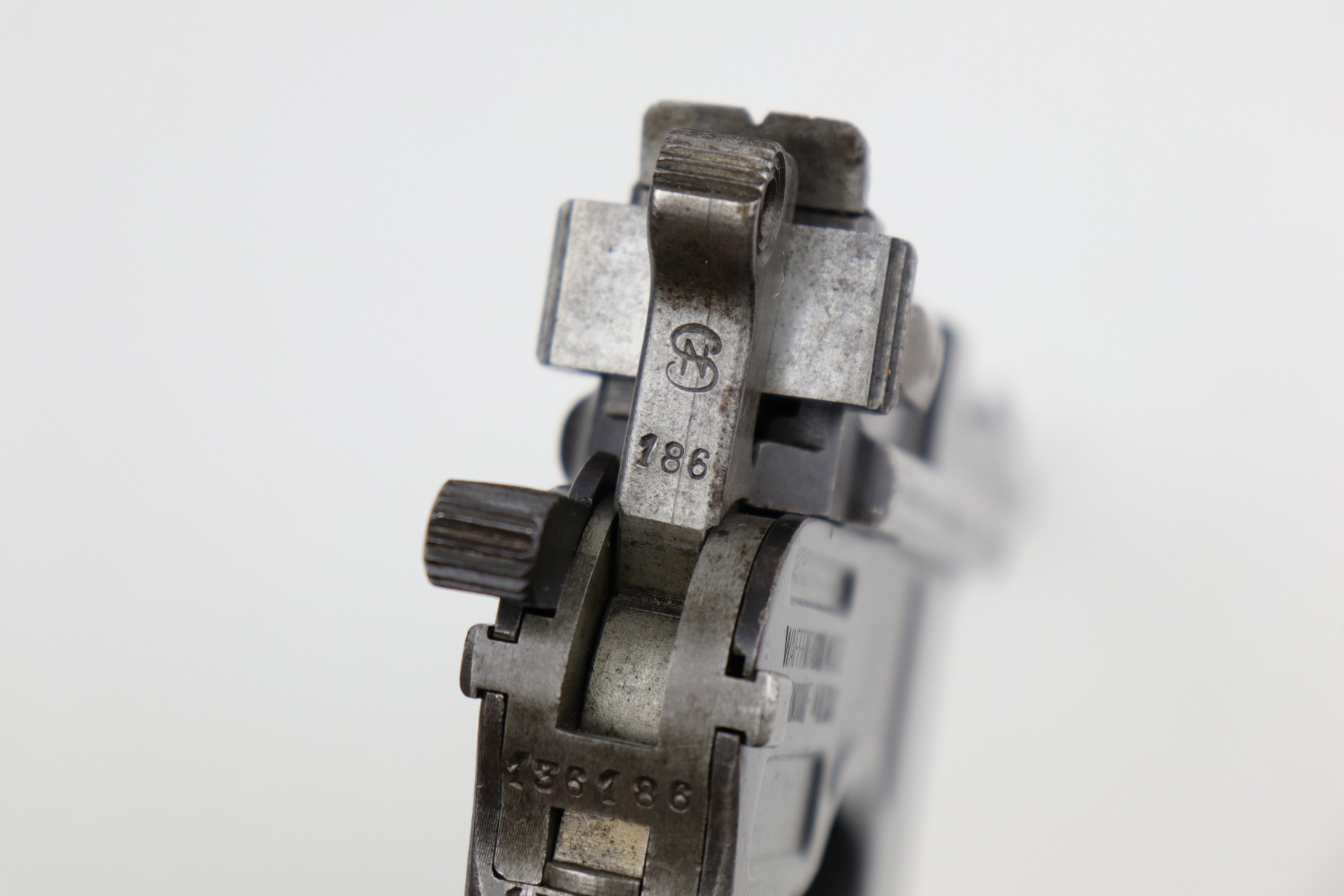 8/23/24 – This is a very nice example of an original Mauser C96 “Red 9” Broomhandle rig that was sent to a German Police department after the war. In accordance with stipulations of the Versailles Treaty, these pistols were modified to have their barrels shortened and tangent sight removed, then many were issued to German Police arsenals. They are far less commonly seen in this configuration than in original design. The gun is all matching except the grips. The pistol is chambered for 9mm. It has retained about 85% of its original finish. There is spotty wear on the barrel and on some of the high edges. There is a unit marking on the front strap, and also on the holster. It comes with the original holster, which is also difficult to find. The bore is very nice – shiny with strong rifling.