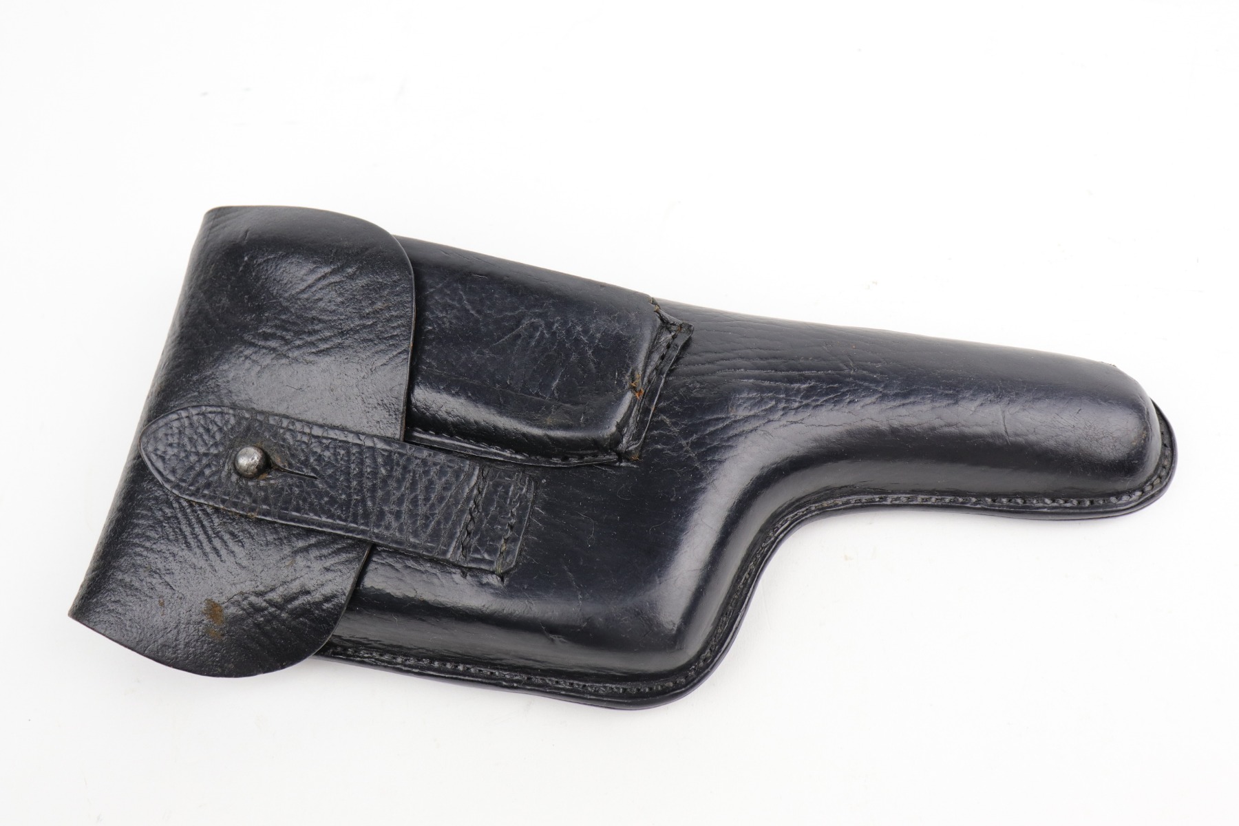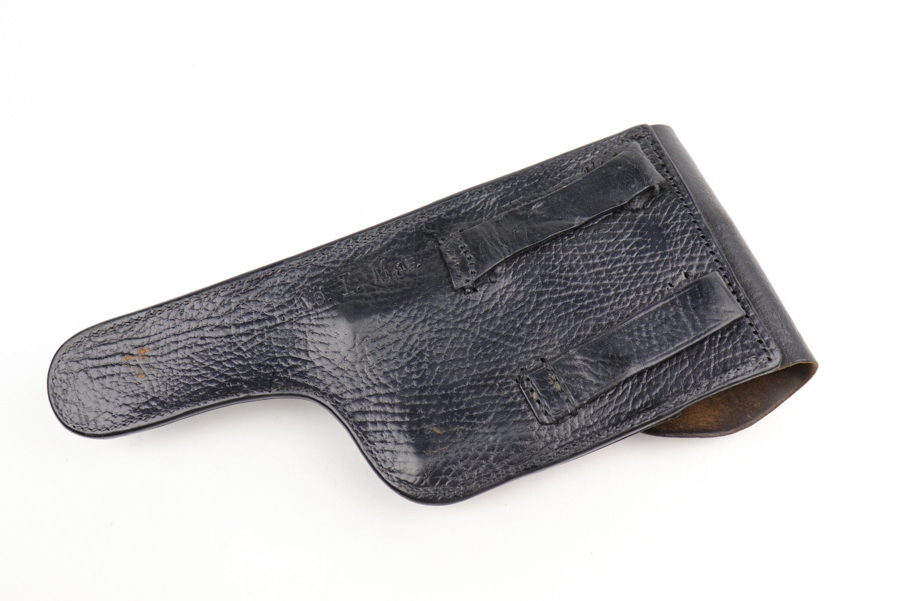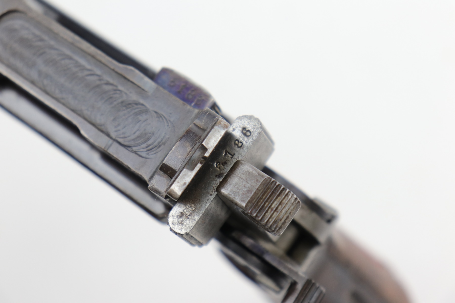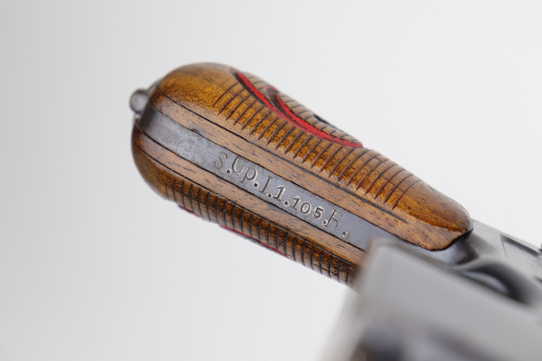 8/23/24 – This is a very nice example of an original Mauser C96 “Red 9” Broomhandle rig that was sent to a German Police department after the war. In accordance with stipulations of the Versailles Treaty, these pistols were modified to have their barrels shortened and tangent sight removed, then many were issued to German Police arsenals. They are far less commonly seen in this configuration than in original design. The gun is all matching except the grips. The pistol is chambered for 9mm. It has retained about 85% of its original finish. There is spotty wear on the barrel and on some of the high edges. There is a unit marking on the front strap, and also on the holster. It comes with the original holster, which is also difficult to find. The bore is very nice – shiny with strong rifling.