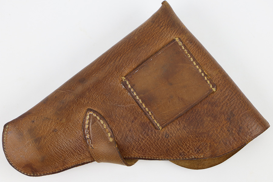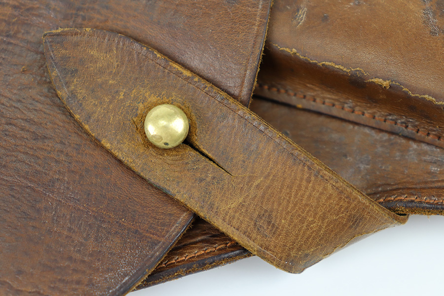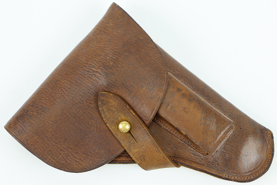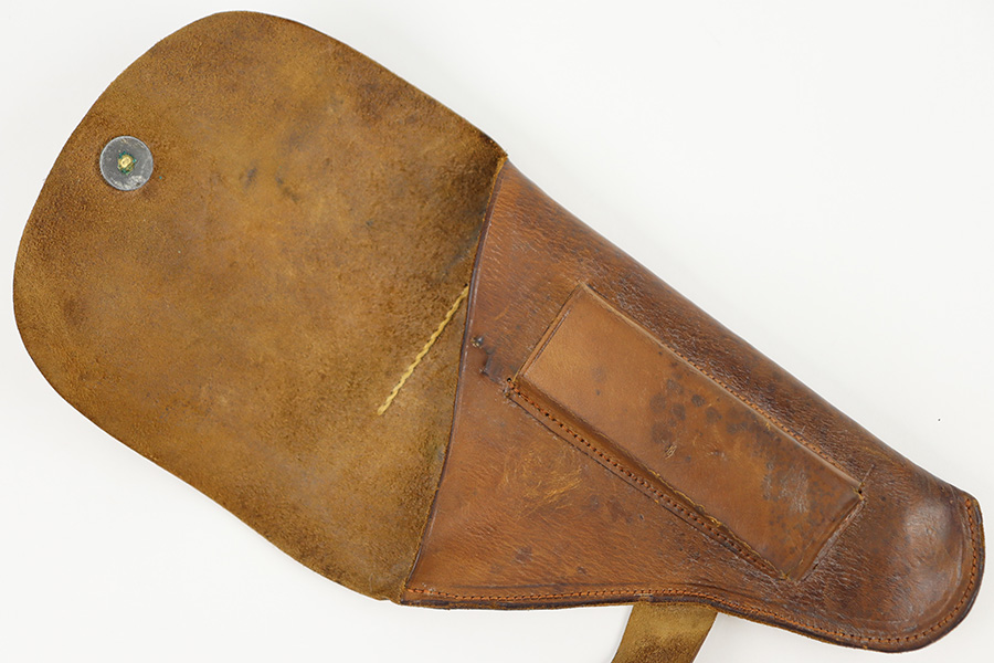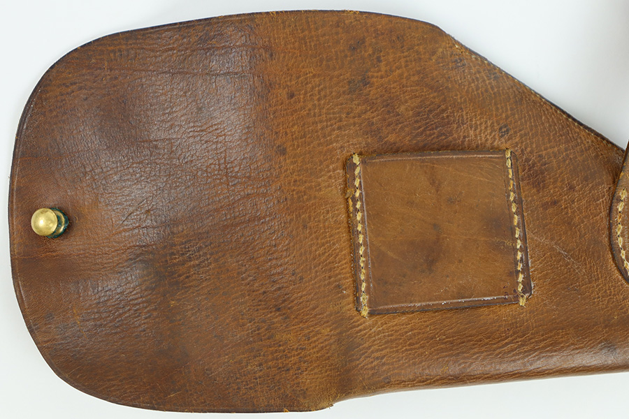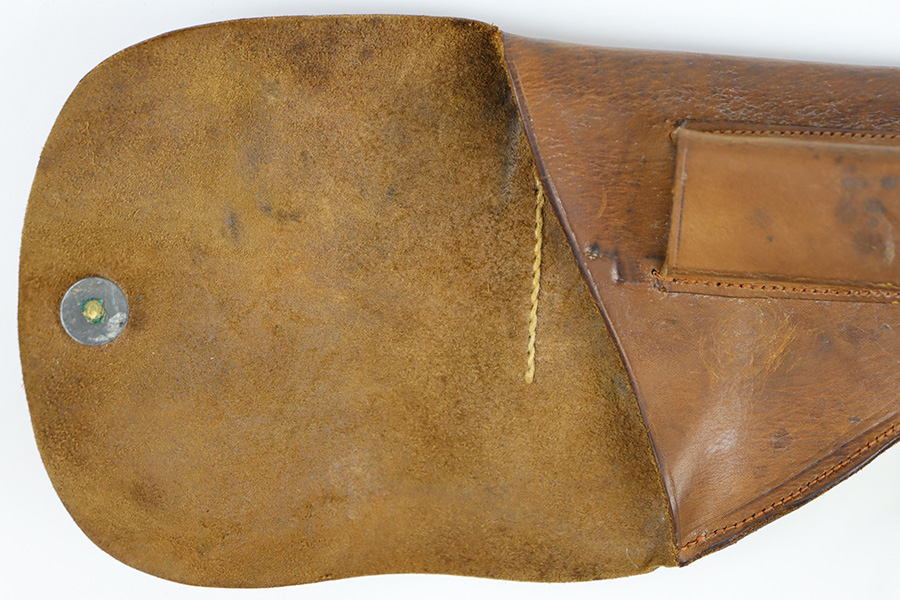 10/23/23 – This is an unmarked, fairly uncommon holster for a .25 caliber (6.35mm) pocket pistol. The holster is likely WW2 era production, due to the style of leather and stitching, along with a brass closure knob. The leather is soft and pliable with some light surface wear on the magazine pouch and closure strap. Clean interior leather and no notable stitching issues. Great for a Mauser M1910 or a Walther Model 8.