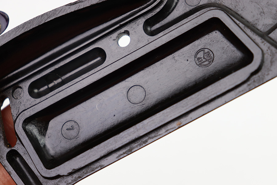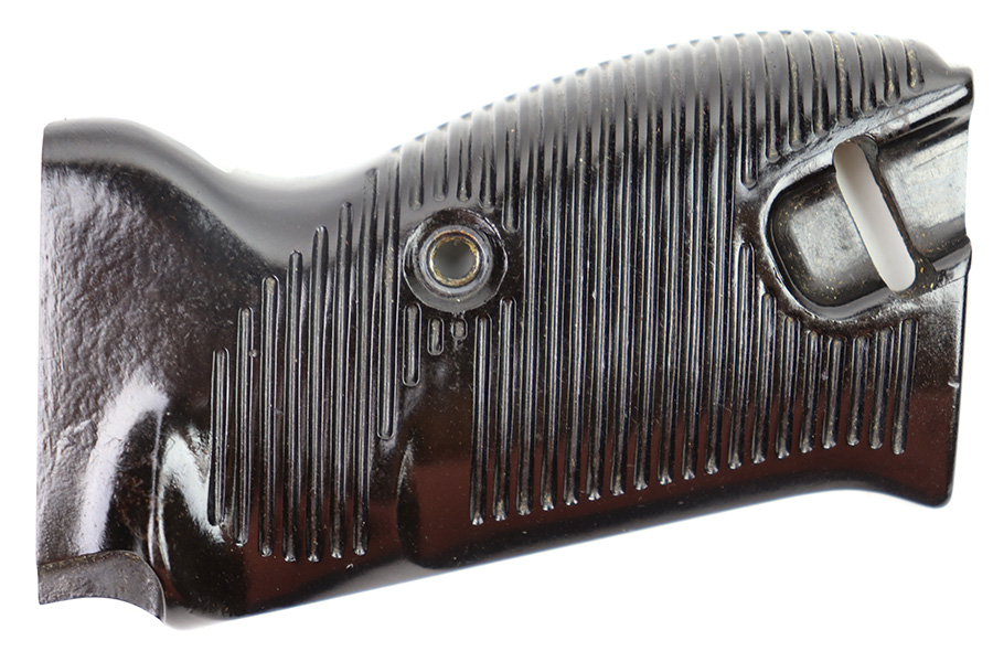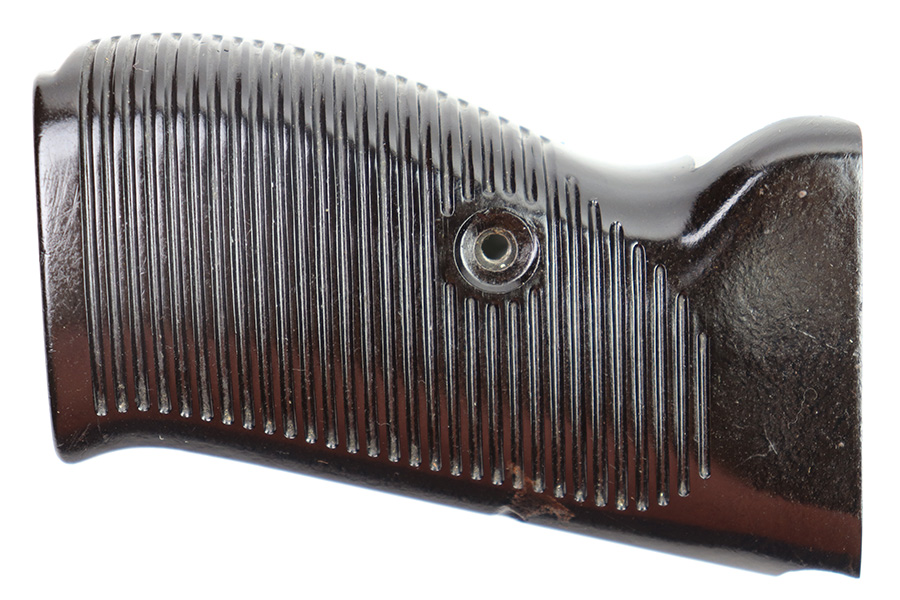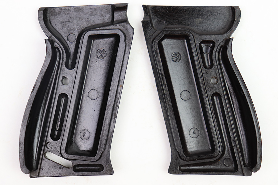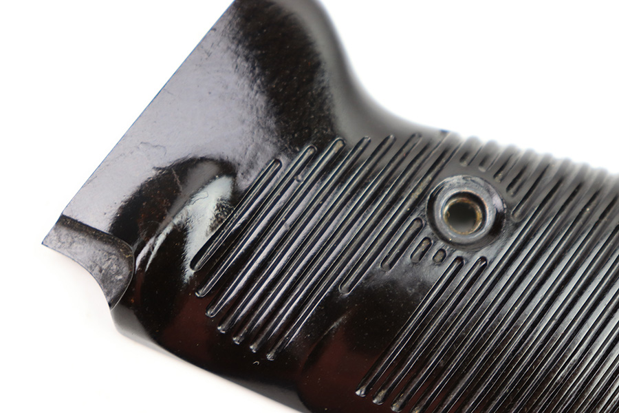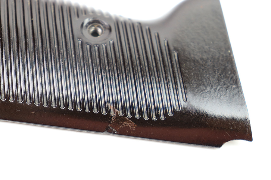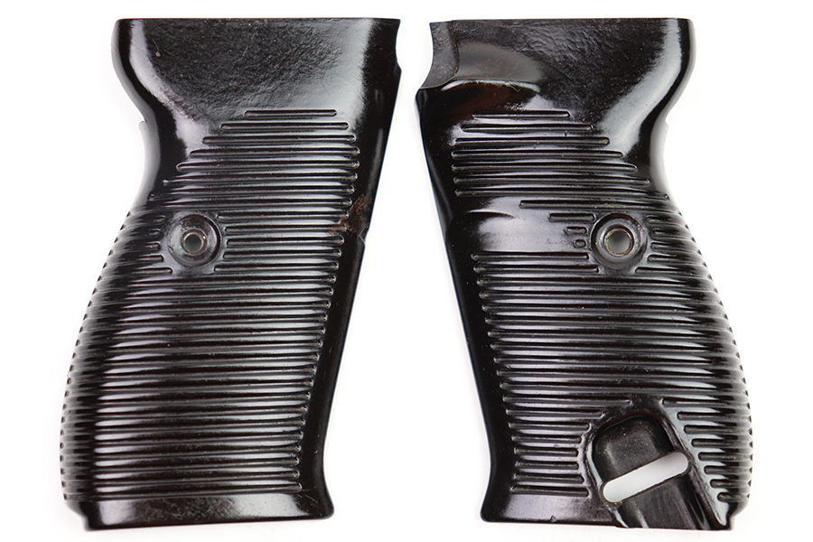 11/10/22 – This is an original pair of WW2 production P.38 grips. The bakelite grips are in great overall condition despite the right panel having a very small chip and area of discoloration. No other cracks or chips, as shown in photos. No screw included.