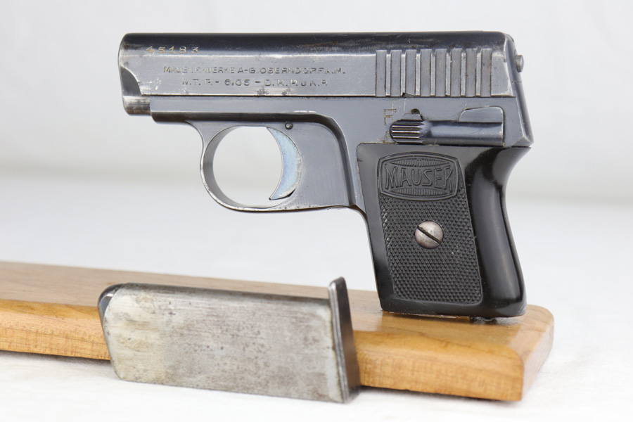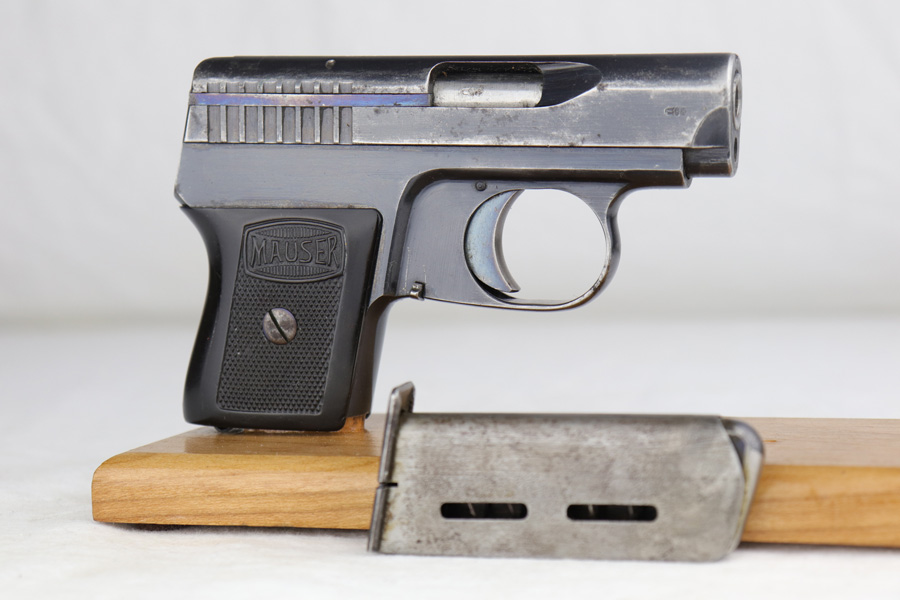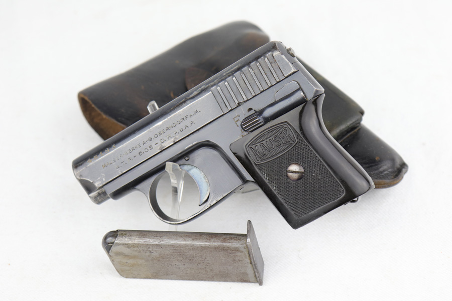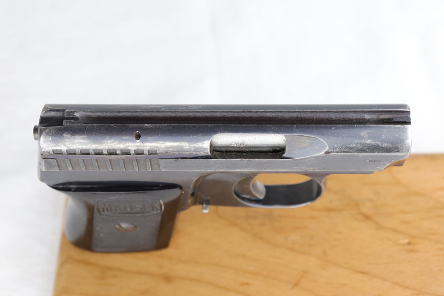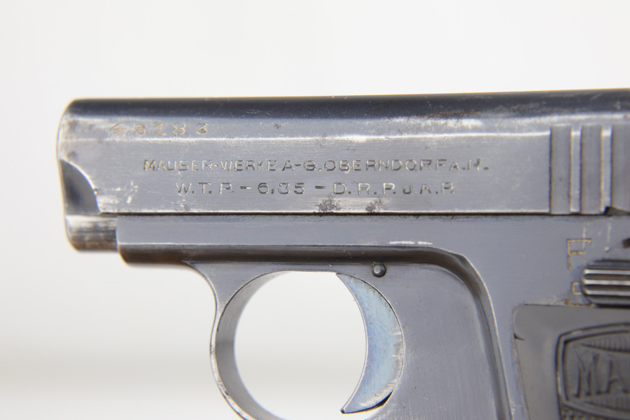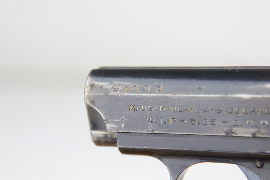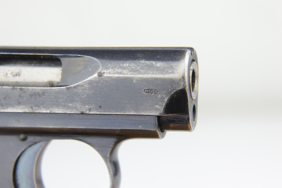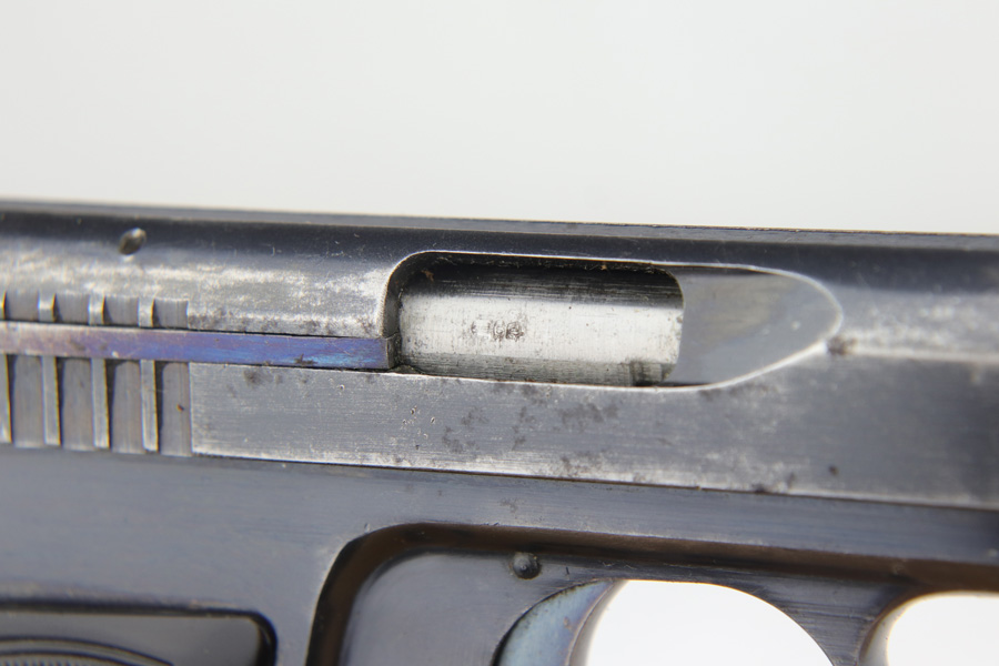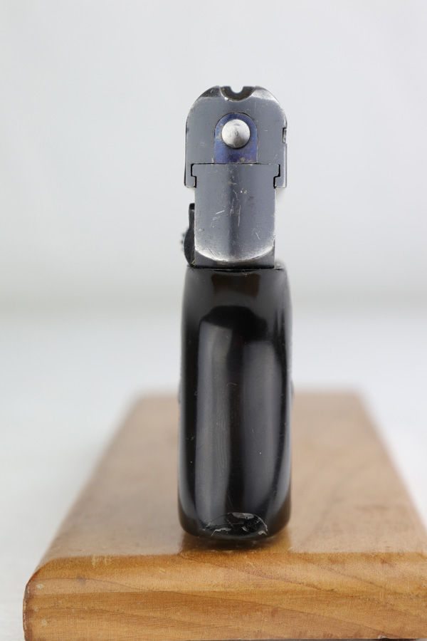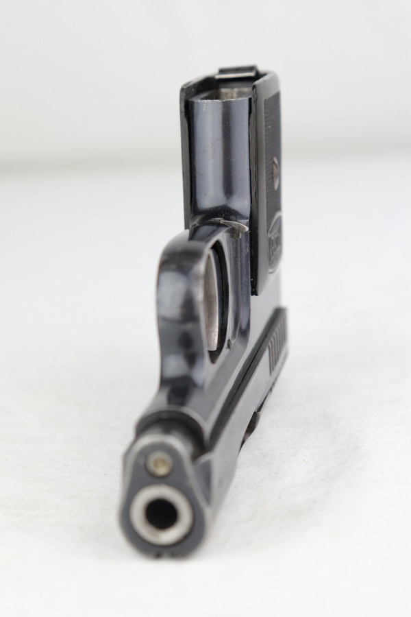 1/23/19 – This is an original Mauser WTP-1 pistol with about 85% original blue. Standard thinning of the slide from use and holster rub on both sides. Terrific bore. Nice original grip, though it has a small crack in the bottom of the spine. ONE original magazine is present. Comes with an unmarked but seemingly period original holster that fits it nicely.