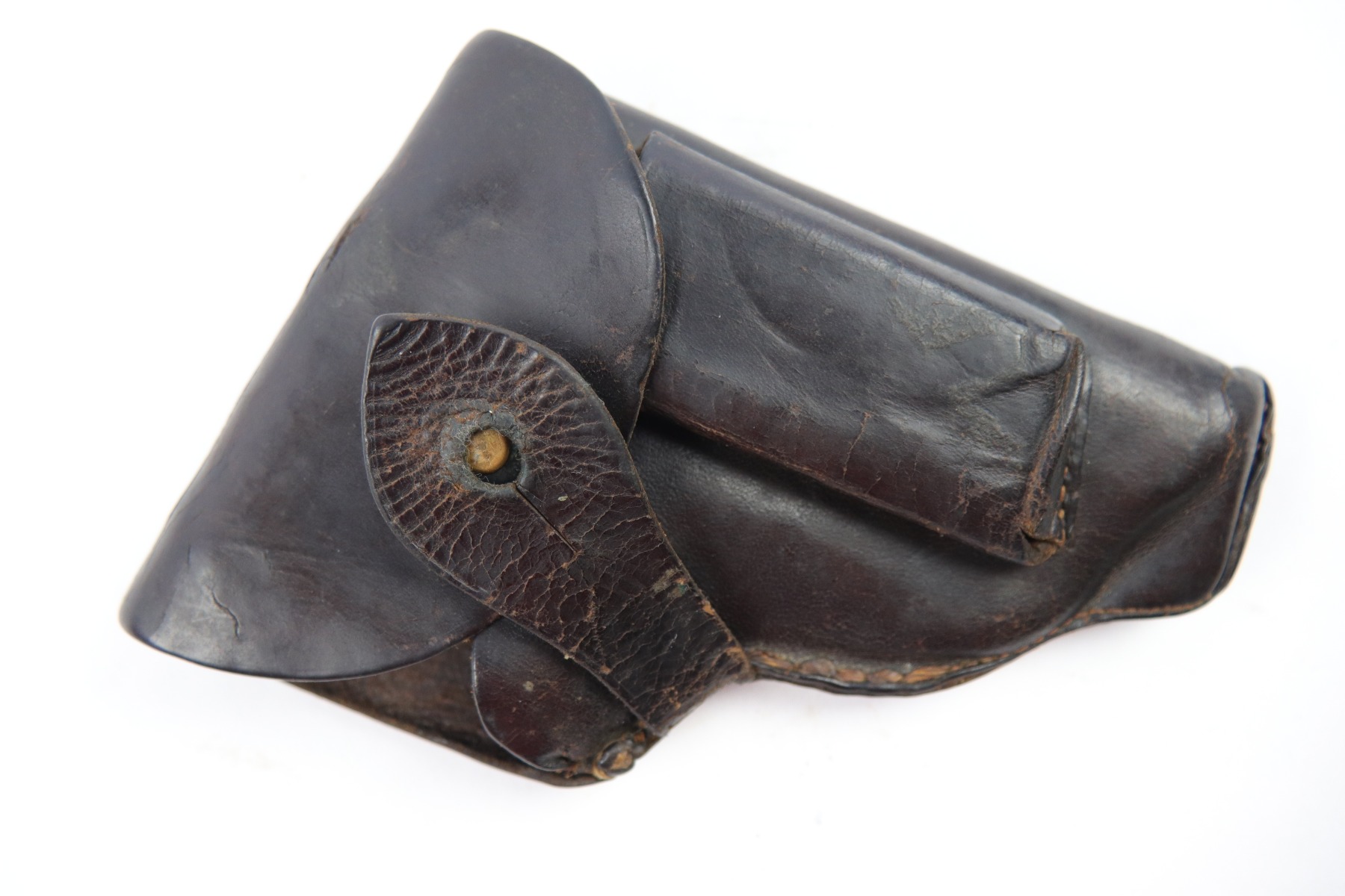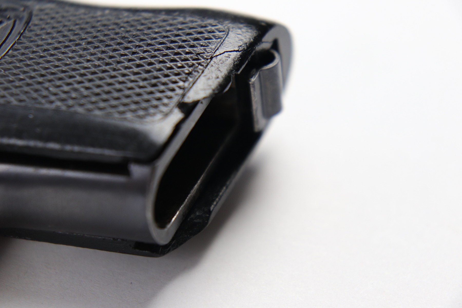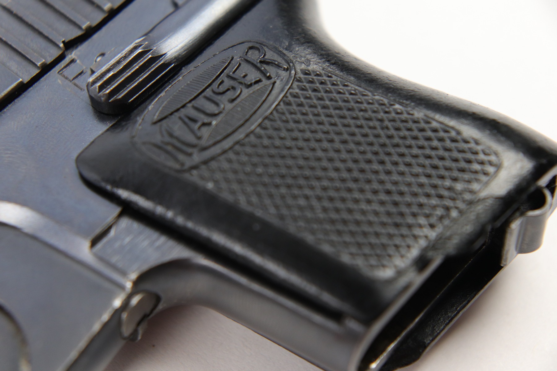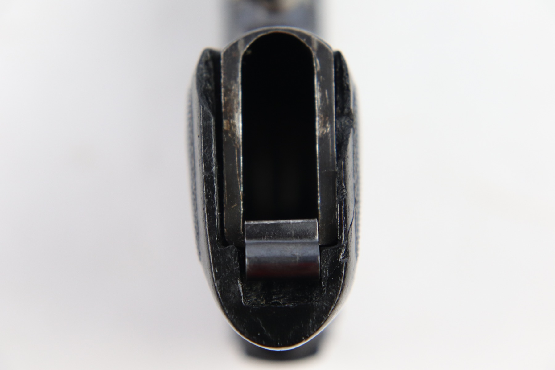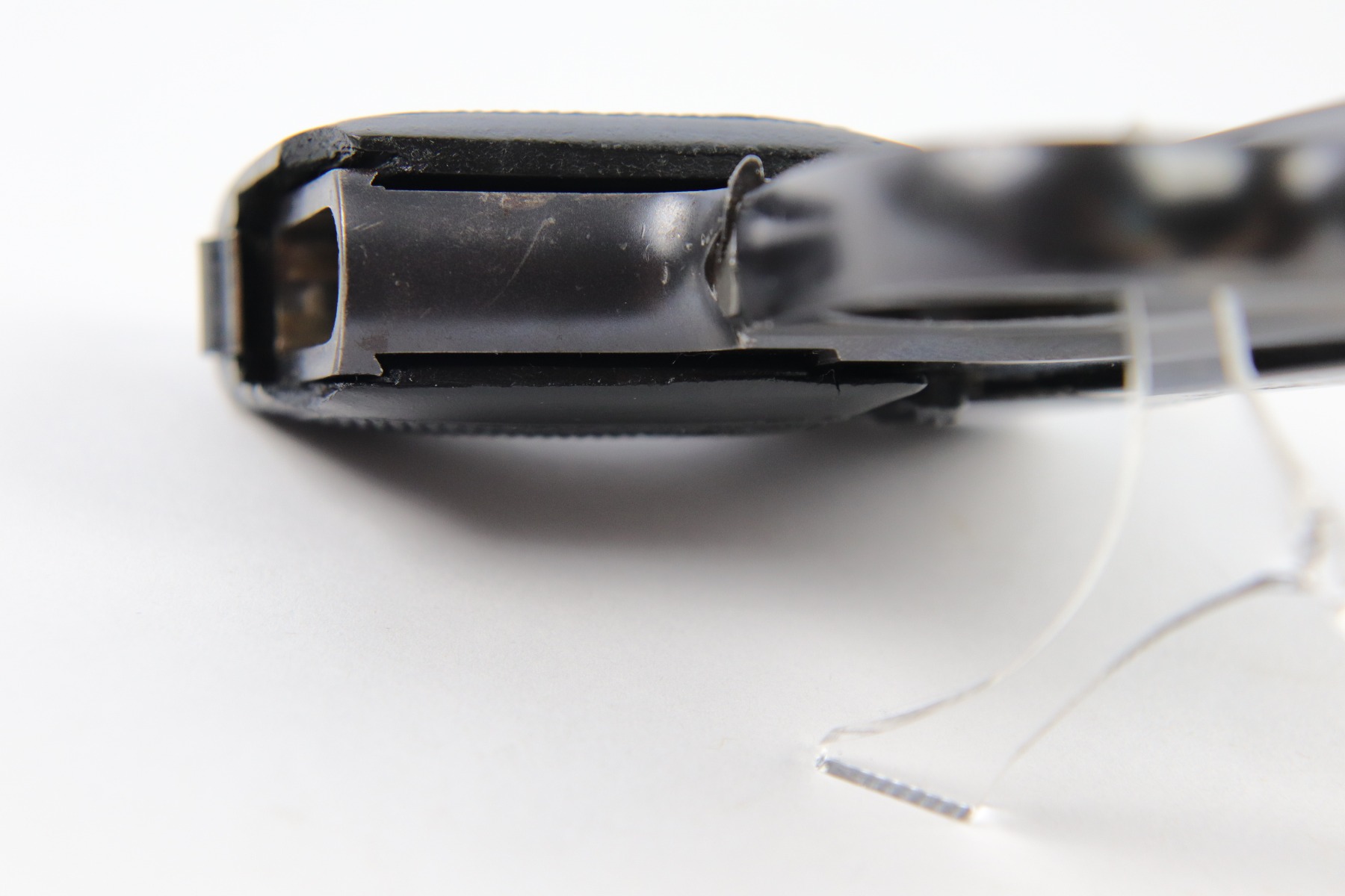 5/3/18 – This is an original 2nd variation Mauser WTP I pistol, complete with the original holster and spare magazine. The pistol is in about 96% original condition with some light muzzle wear and a few small blemishes on the front strap, but overall in very good collectible condition. The biggest issue on the pistol is the grip, which is cracked on the spine by the grip screw, and chipped on the base (see photos). The bore is nice with strong rifling but there is minor patina showing signs of use. The holster is in good condition with no markings. Both magazines are original.