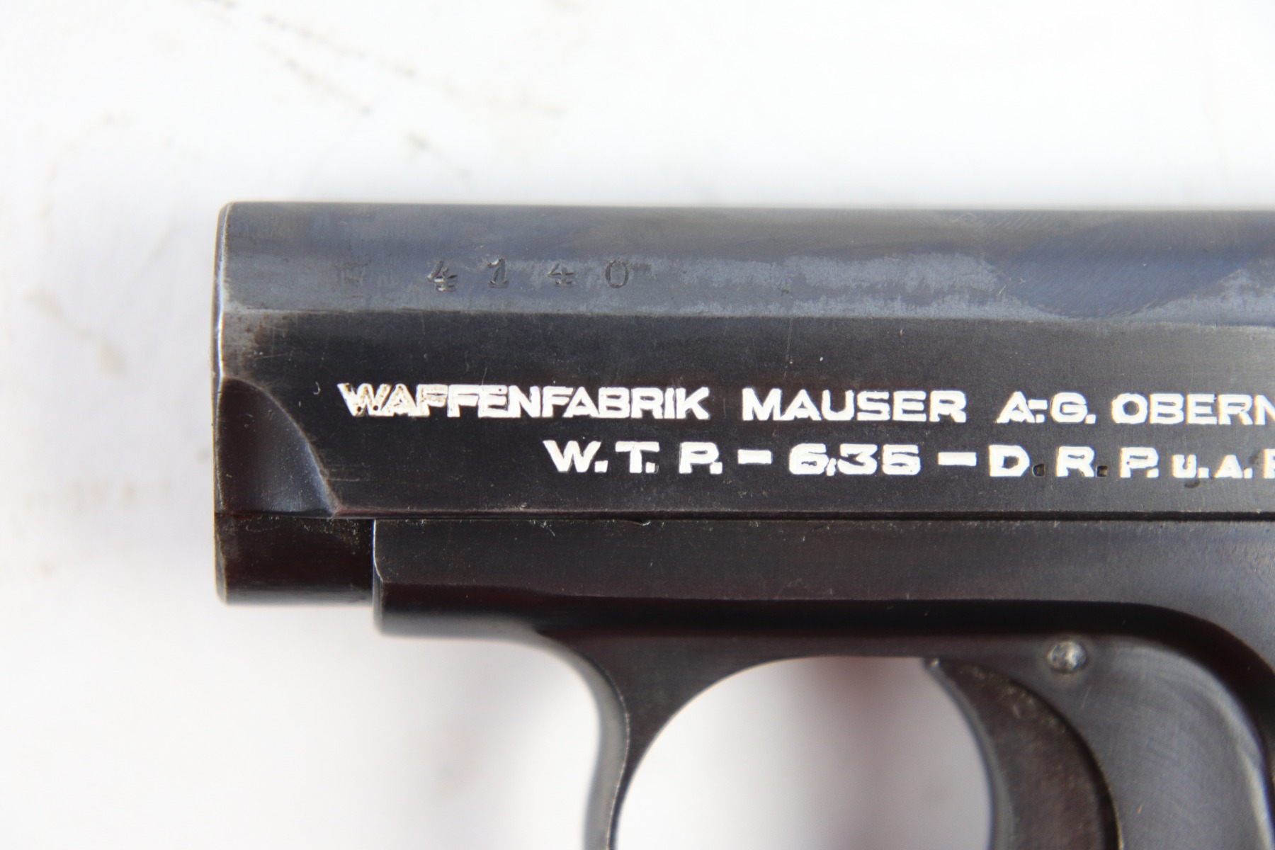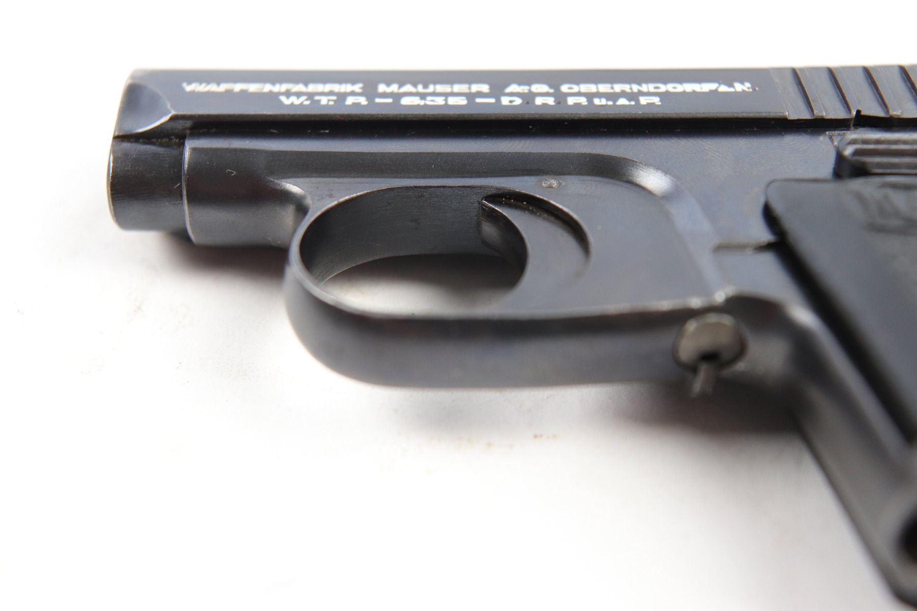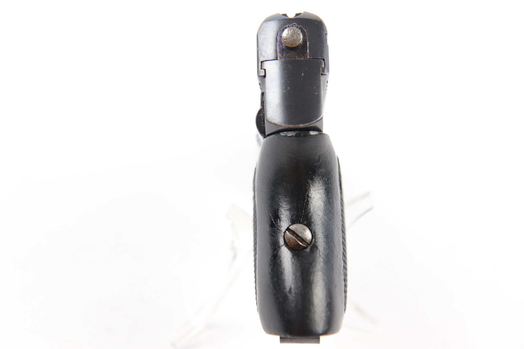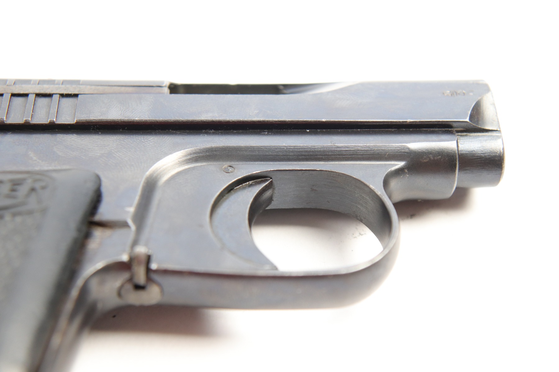 5/3/18 – This is an original 2nd variation Mauser WTP I pistol, complete with the original holster and spare magazine. The pistol is in about 96% original condition with some light muzzle wear and a few small blemishes on the front strap, but overall in very good collectible condition. The biggest issue on the pistol is the grip, which is cracked on the spine by the grip screw, and chipped on the base (see photos). The bore is nice with strong rifling but there is minor patina showing signs of use. The holster is in good condition with no markings. Both magazines are original.