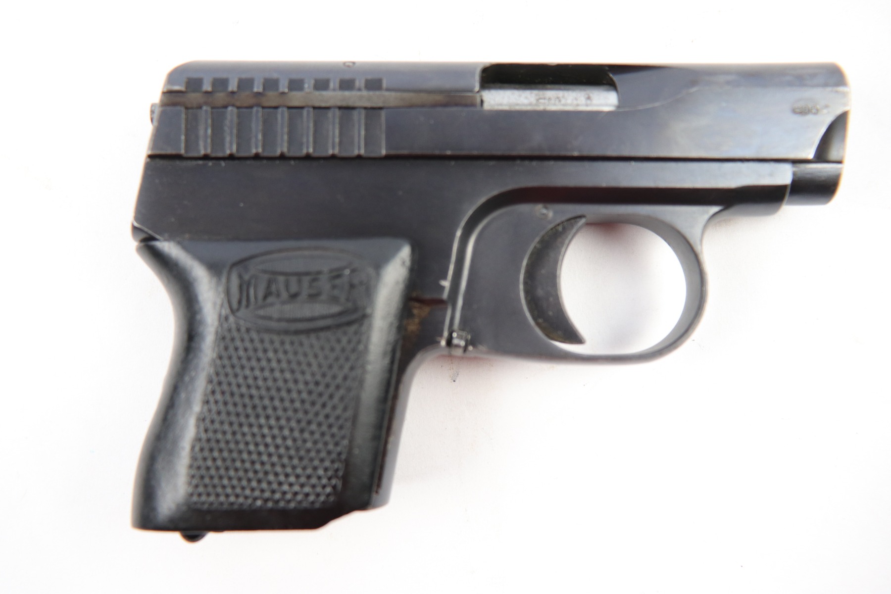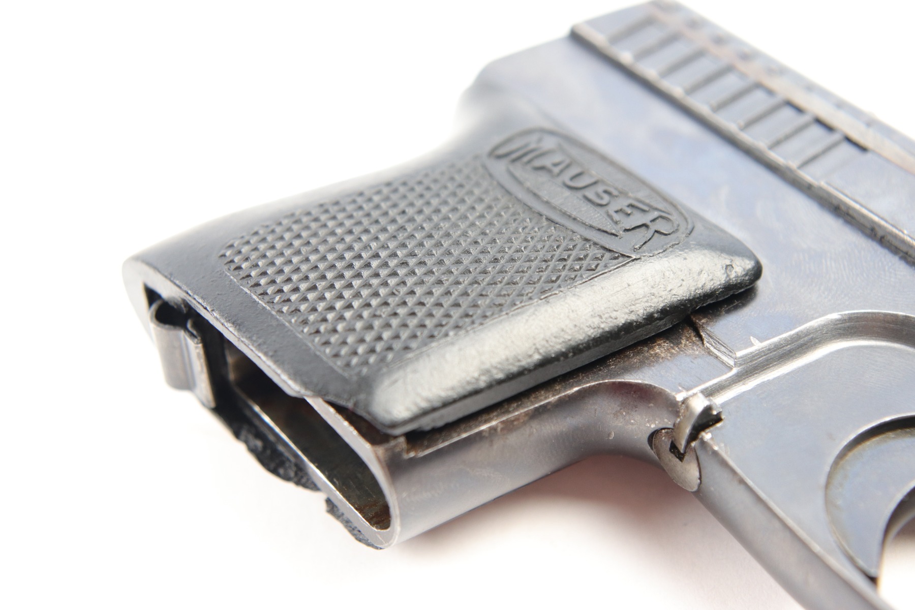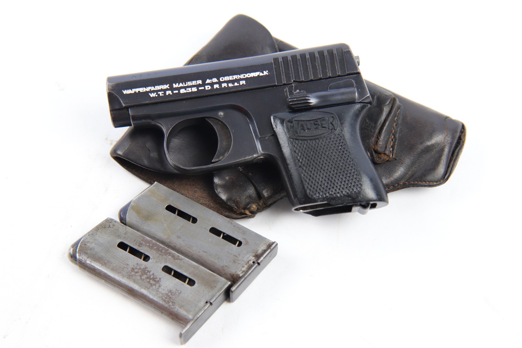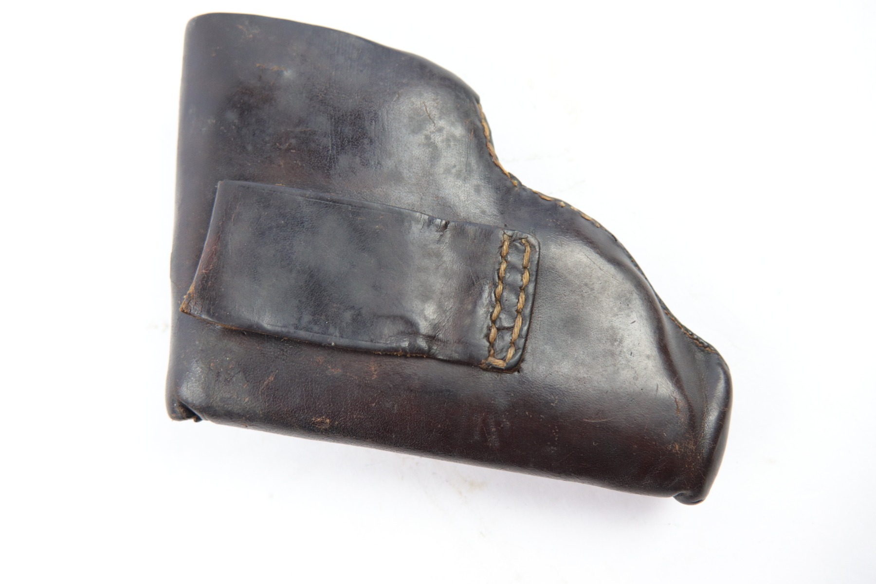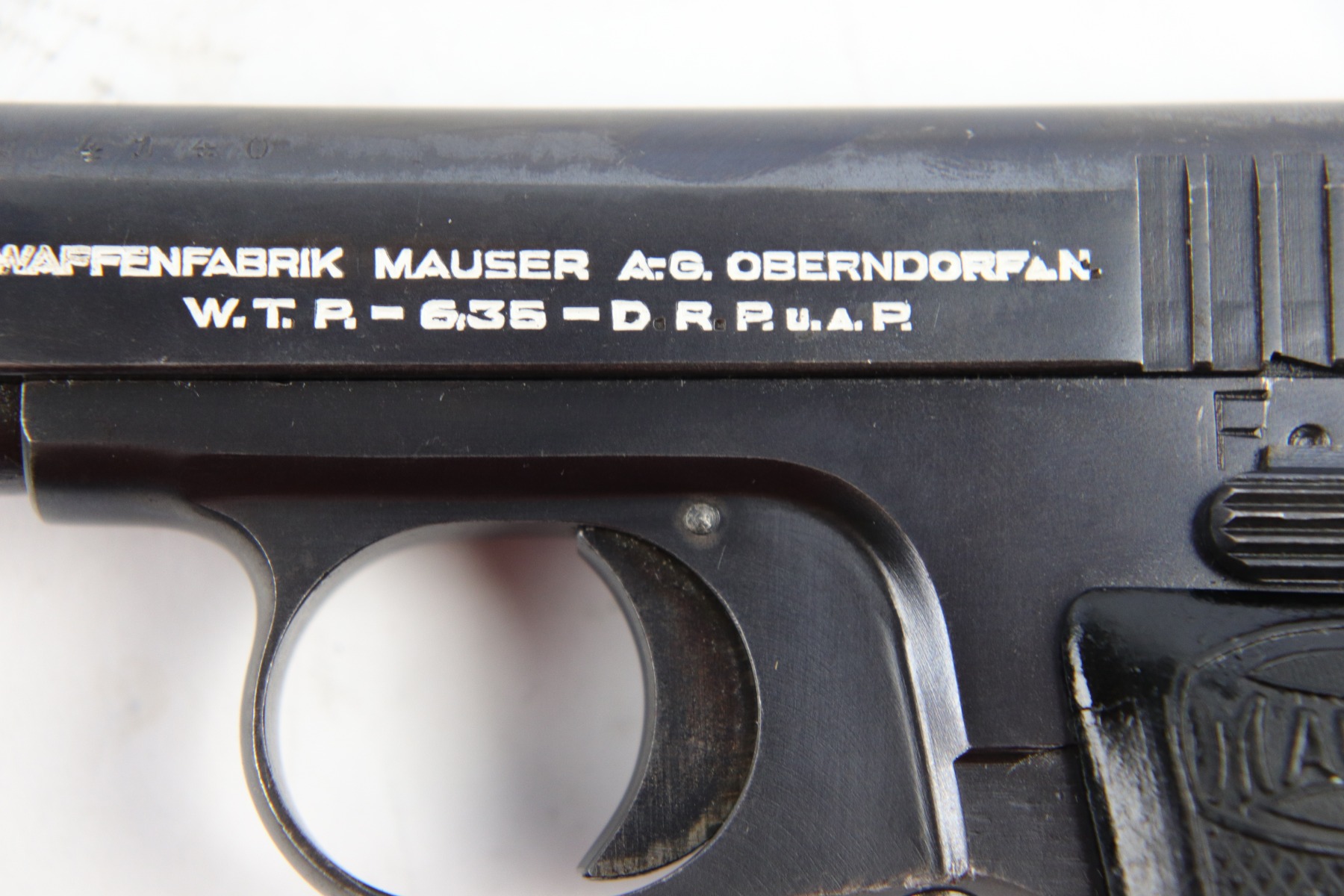 5/3/18 – This is an original 2nd variation Mauser WTP I pistol, complete with the original holster and spare magazine. The pistol is in about 96% original condition with some light muzzle wear and a few small blemishes on the front strap, but overall in very good collectible condition. The biggest issue on the pistol is the grip, which is cracked on the spine by the grip screw, and chipped on the base (see photos). The bore is nice with strong rifling but there is minor patina showing signs of use. The holster is in good condition with no markings. Both magazines are original.