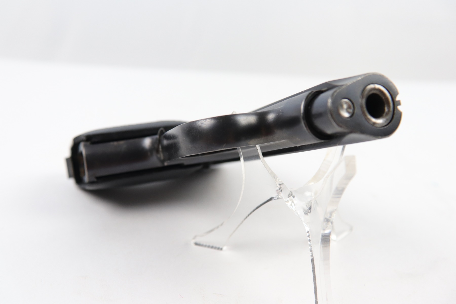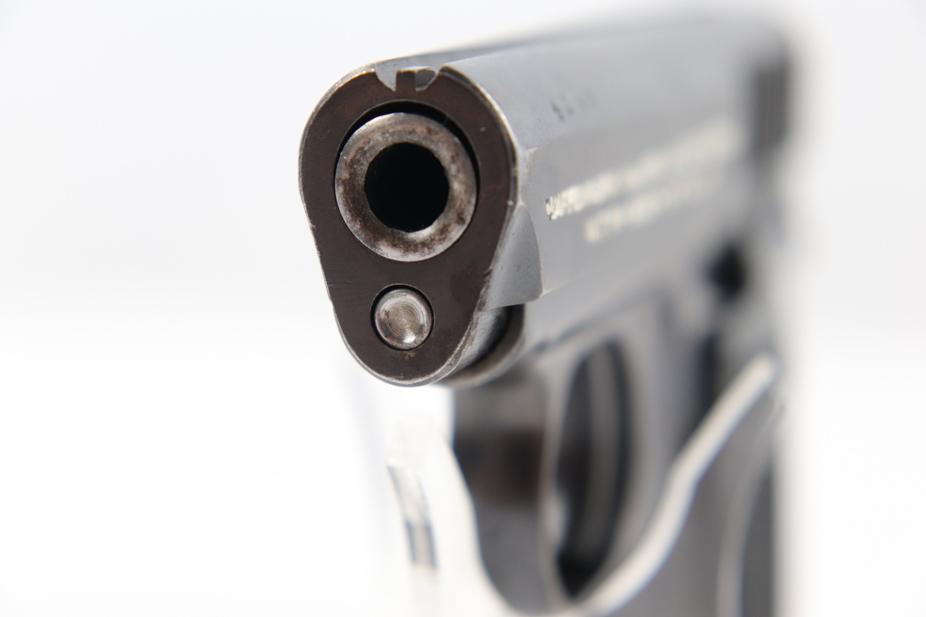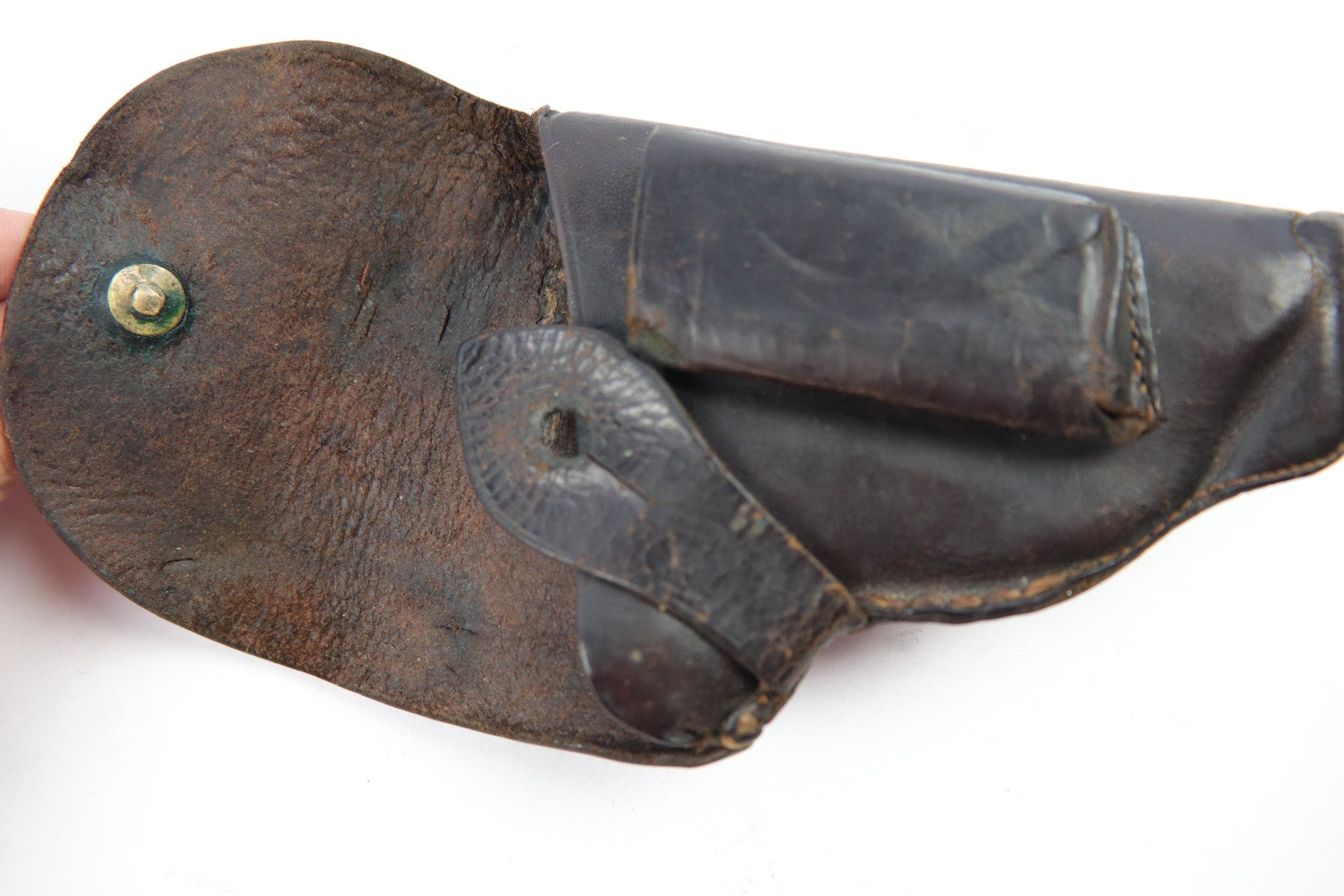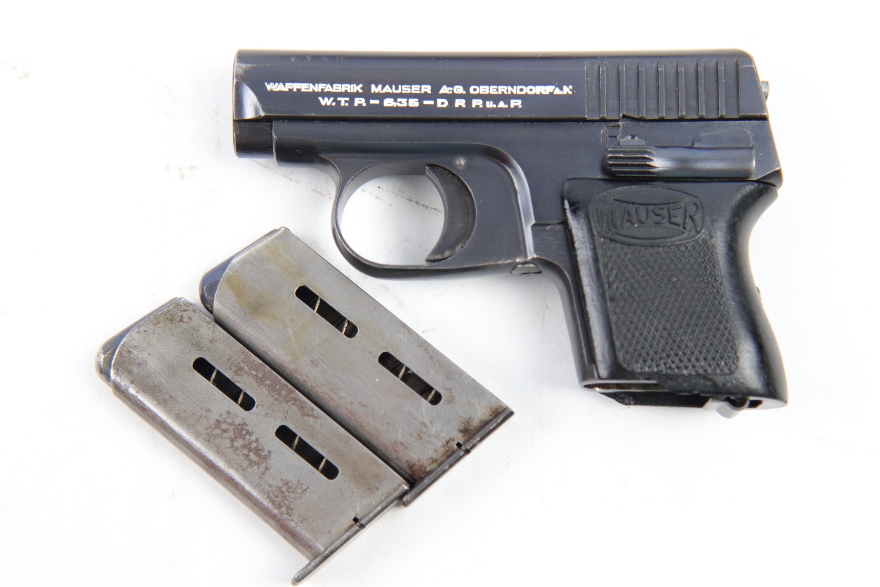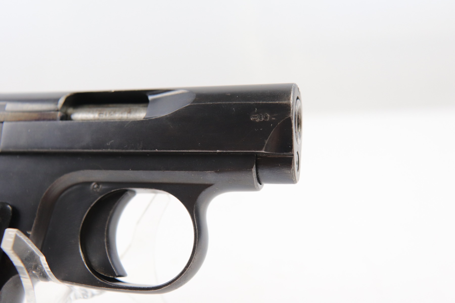 5/3/18 – This is an original 2nd variation Mauser WTP I pistol, complete with the original holster and spare magazine. The pistol is in about 96% original condition with some light muzzle wear and a few small blemishes on the front strap, but overall in very good collectible condition. The biggest issue on the pistol is the grip, which is cracked on the spine by the grip screw, and chipped on the base (see photos). The bore is nice with strong rifling but there is minor patina showing signs of use. The holster is in good condition with no markings. Both magazines are original.