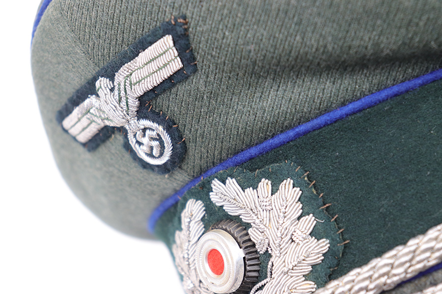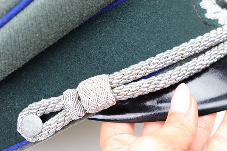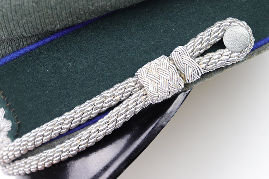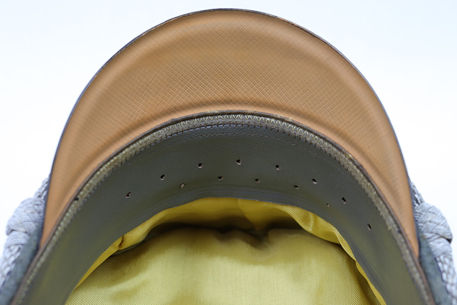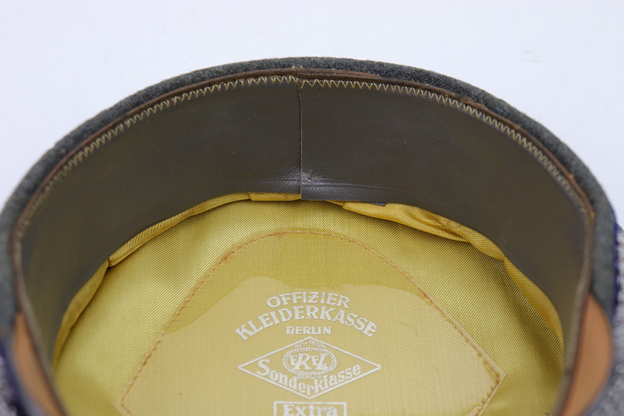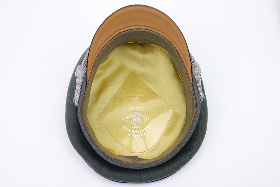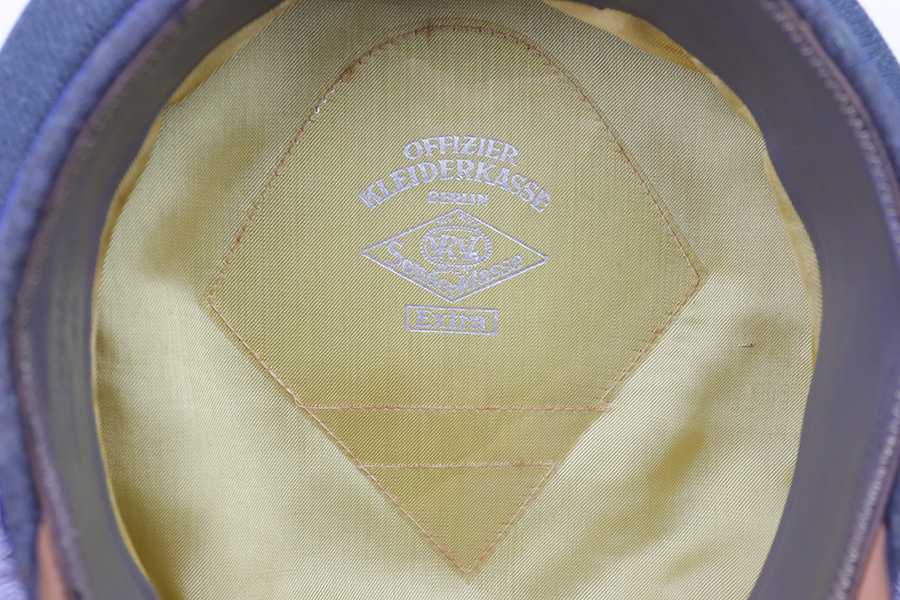 1/25/23 – This is an excellent, near mint example of a WW2 German Medical Officer’s High Peak Visor Cap. The visor features excellent wool construction with very clean dark blue piping. The front emblems are stitched silver bullion, which is a custom tailored feature for private purchase. Another customized private purchase feature is the “high peak” design, giving the cap a taller look with a reinforced interior. The visor also has a silver bullion chinstrap that’s also in excellent condition. The interior of this visor is equally as excellent as the exterior. The interior crown has a maker label, and the leather headband is also maker stamped as shown. The marking is crisp and clean. The interior has very minimal wear and almost no signs of previous use. A near-perfect example!
