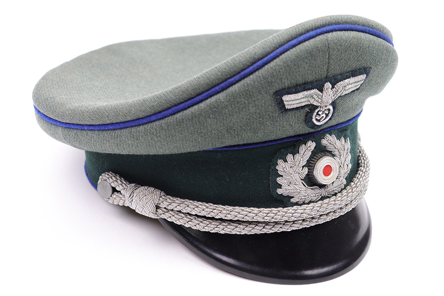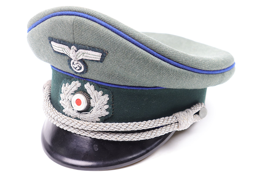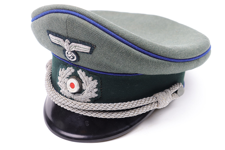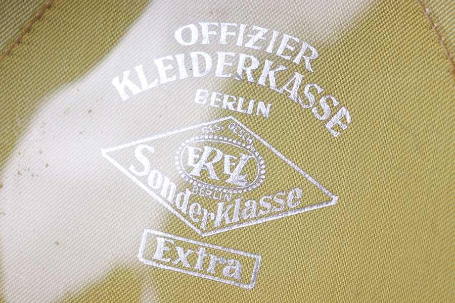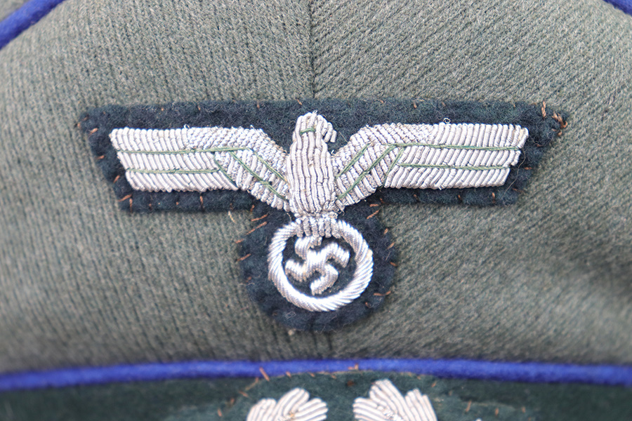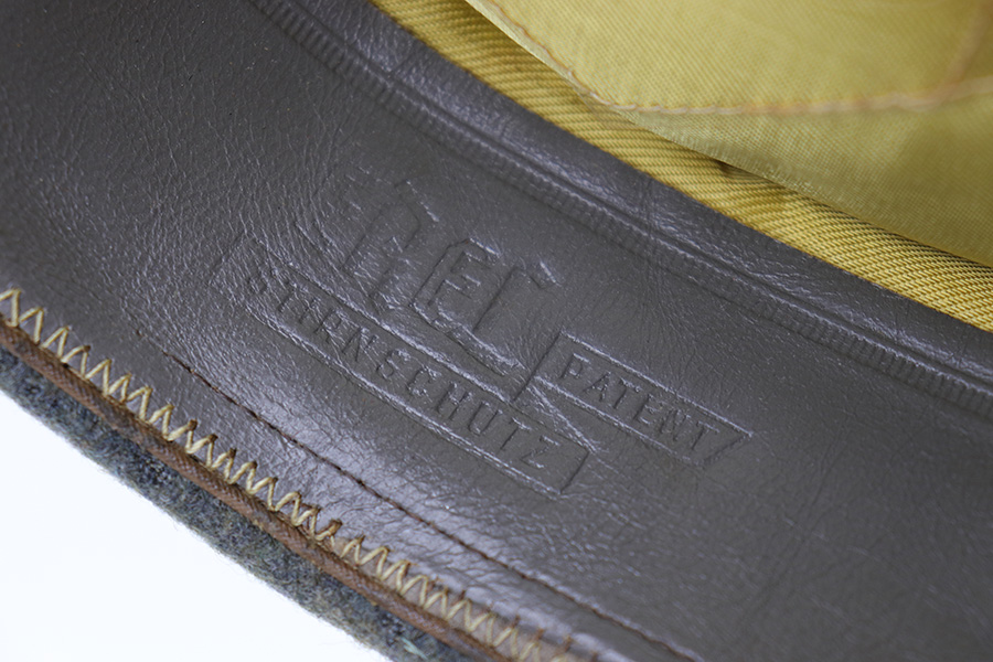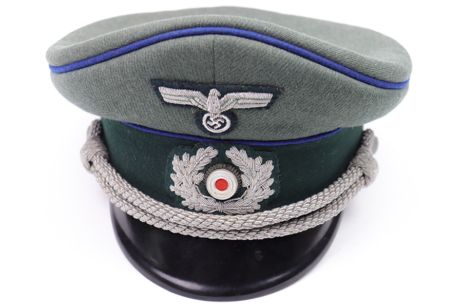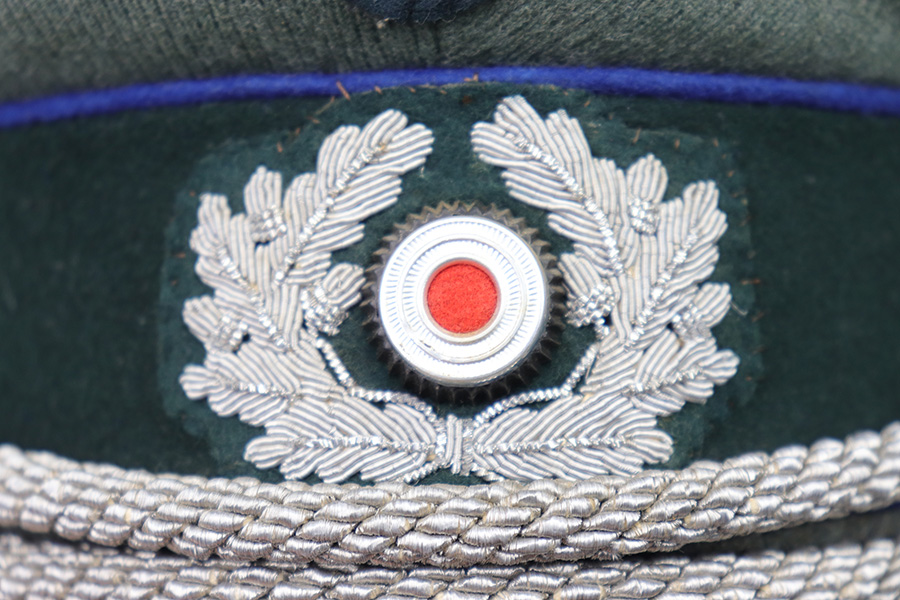 1/25/23 – This is an excellent, near mint example of a WW2 German Medical Officer’s High Peak Visor Cap. The visor features excellent wool construction with very clean dark blue piping. The front emblems are stitched silver bullion, which is a custom tailored feature for private purchase. Another customized private purchase feature is the “high peak” design, giving the cap a taller look with a reinforced interior. The visor also has a silver bullion chinstrap that’s also in excellent condition. The interior of this visor is equally as excellent as the exterior. The interior crown has a maker label, and the leather headband is also maker stamped as shown. The marking is crisp and clean. The interior has very minimal wear and almost no signs of previous use. A near-perfect example!