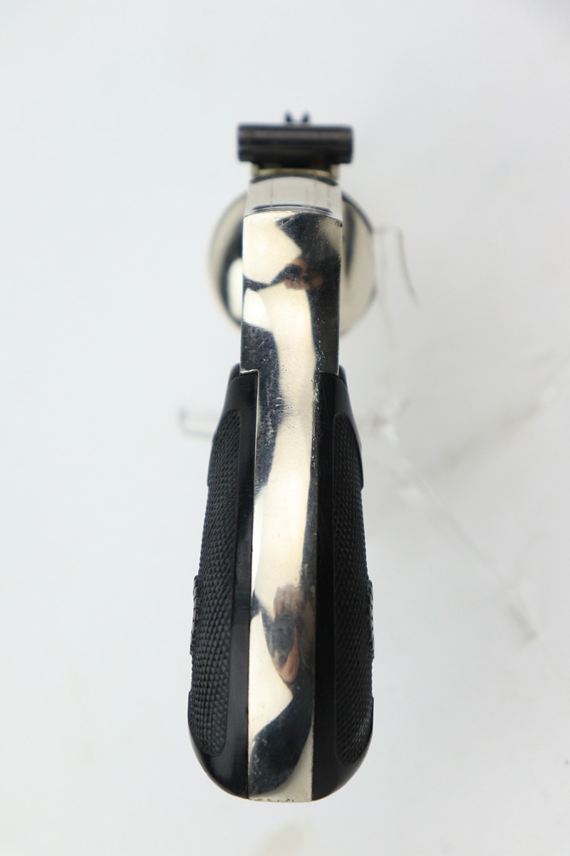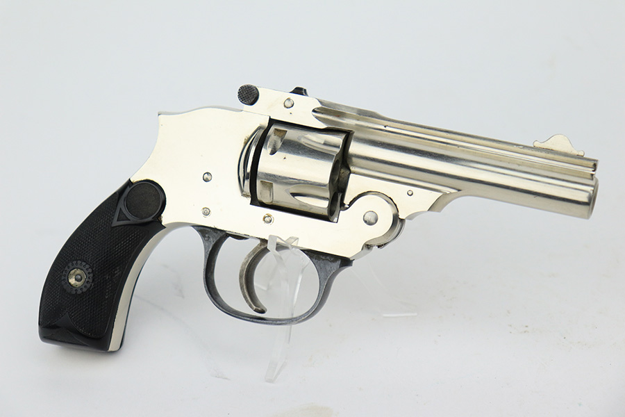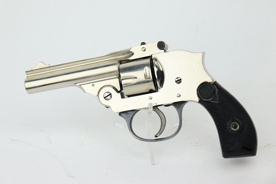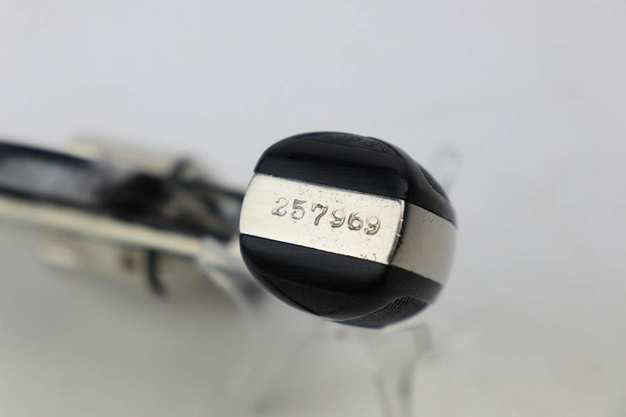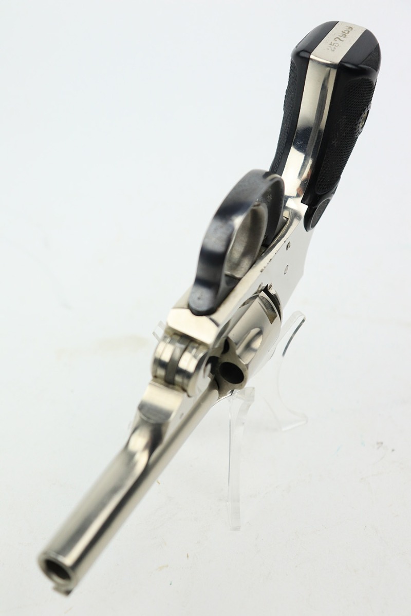 5/19/23 – This is a minty example of a Meriden Firearms Top Break revolver, manufactured in the early 1900’s and chambered in .32 ACP. The gun is mostly nickel-plated, but some of the small parts are blued. There is very little finish loss, just some minor wear and freckling on the trigger guard. Fitted with excellent black bakelite grips. Mint bore.