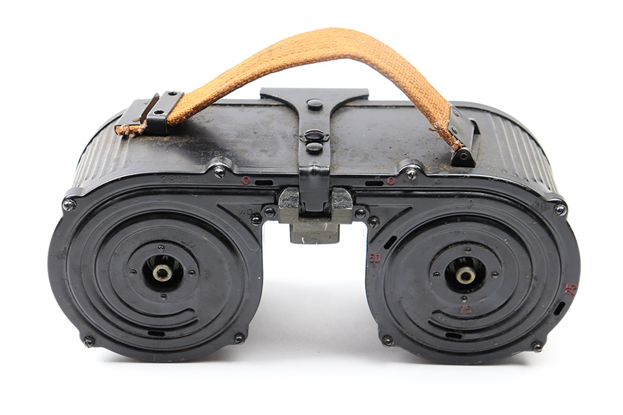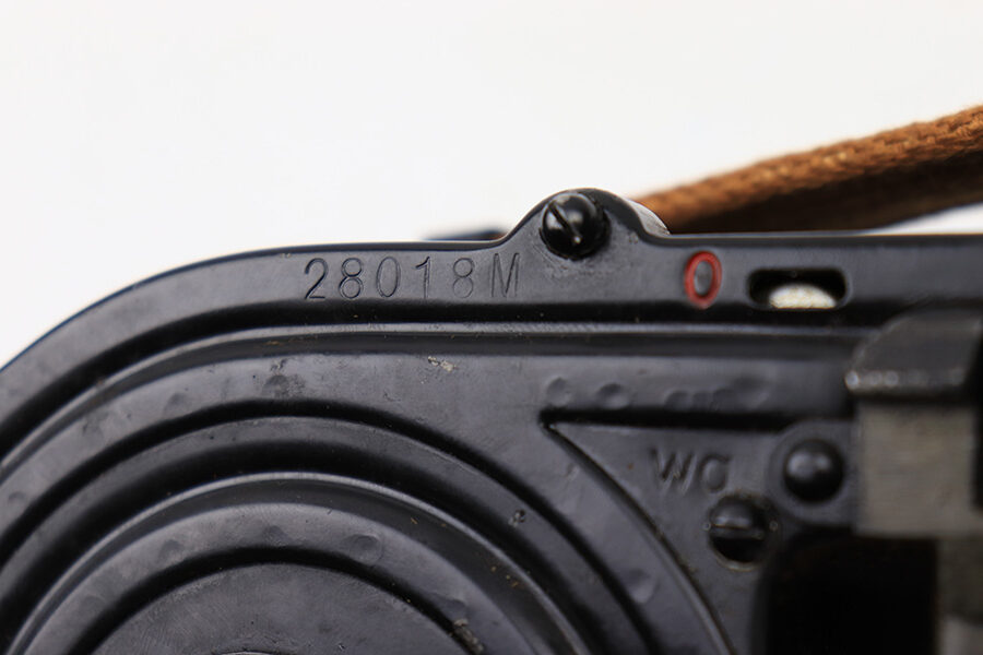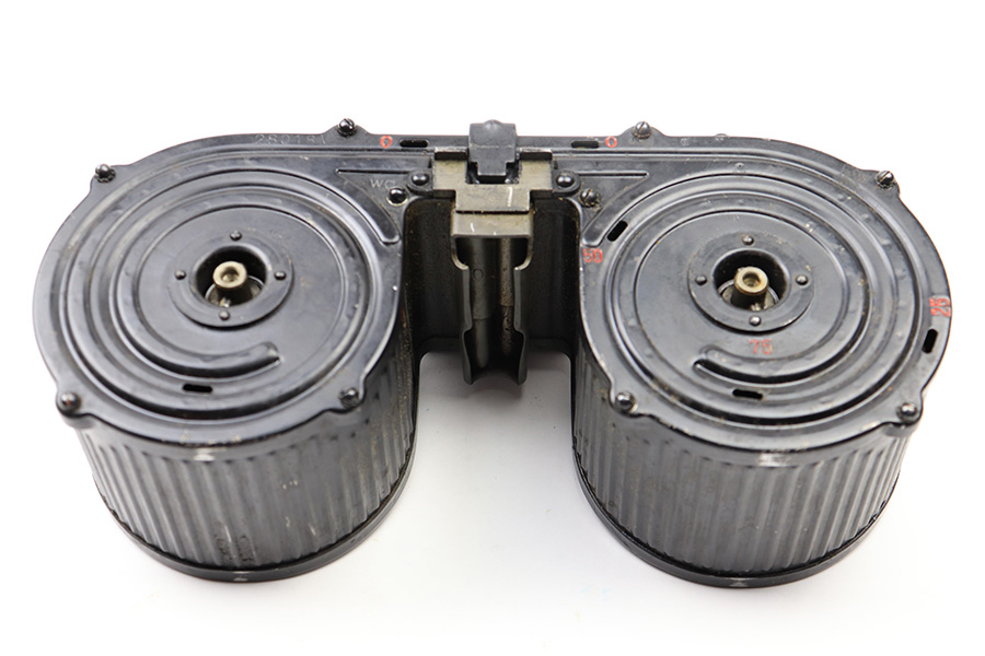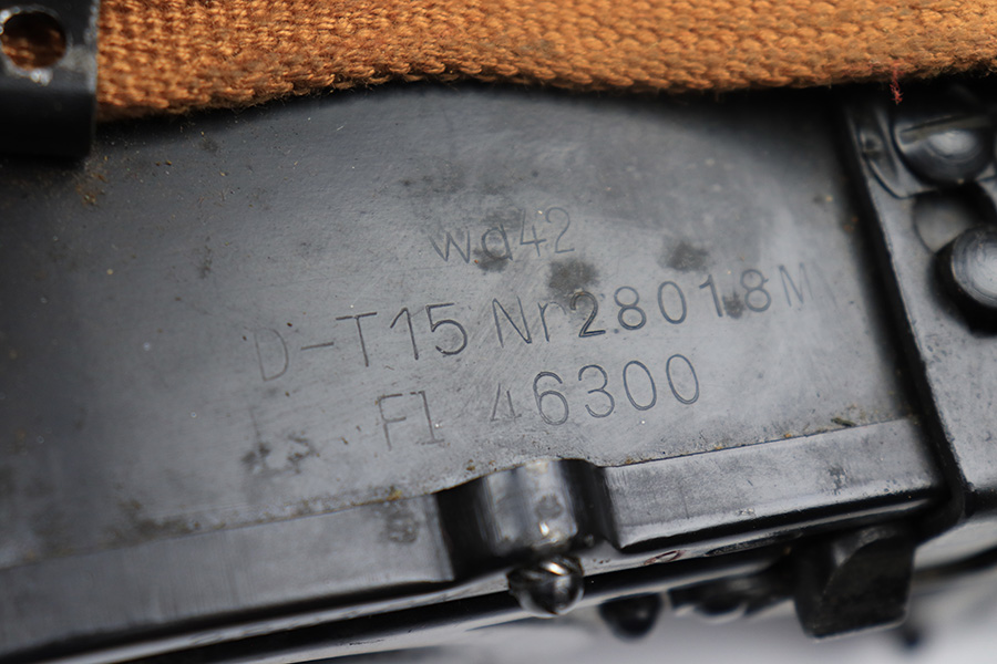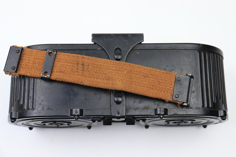 6/23/22 – This is an original 1942 dated double-drum magazine for the MG15 machinegun. The magazine holds 75 rounds of 8mm Mauser ammunition. The top of the magazine is stamped “wd42” with “D-T15 Nr.28018M, Fl 46300” underneath. The blued finish is in great condition throughout the magazine. There is some mild surface patina along the swirled grooves of the drum and some finish loss along the edges. No rust or pitting. The original red paint is still visible within the numerical indicators. The ‘slab side’ of the magazine shows a crisp Luftwaffe eagle/64 proof stamp. The original canvas carry strap is still in excellent condition. Strong, functional spring.