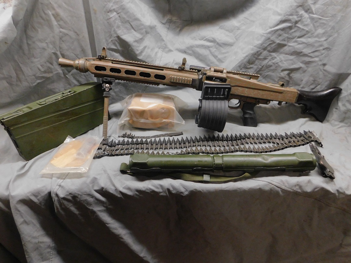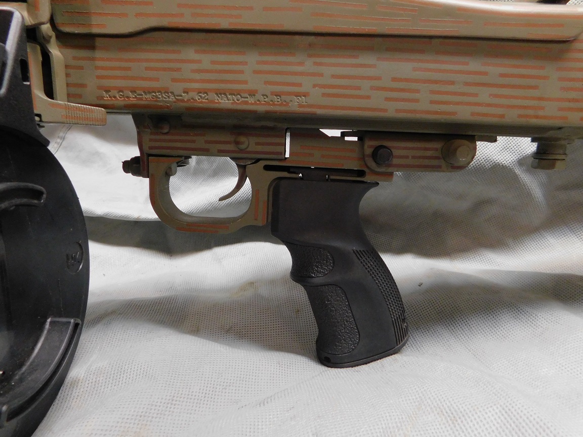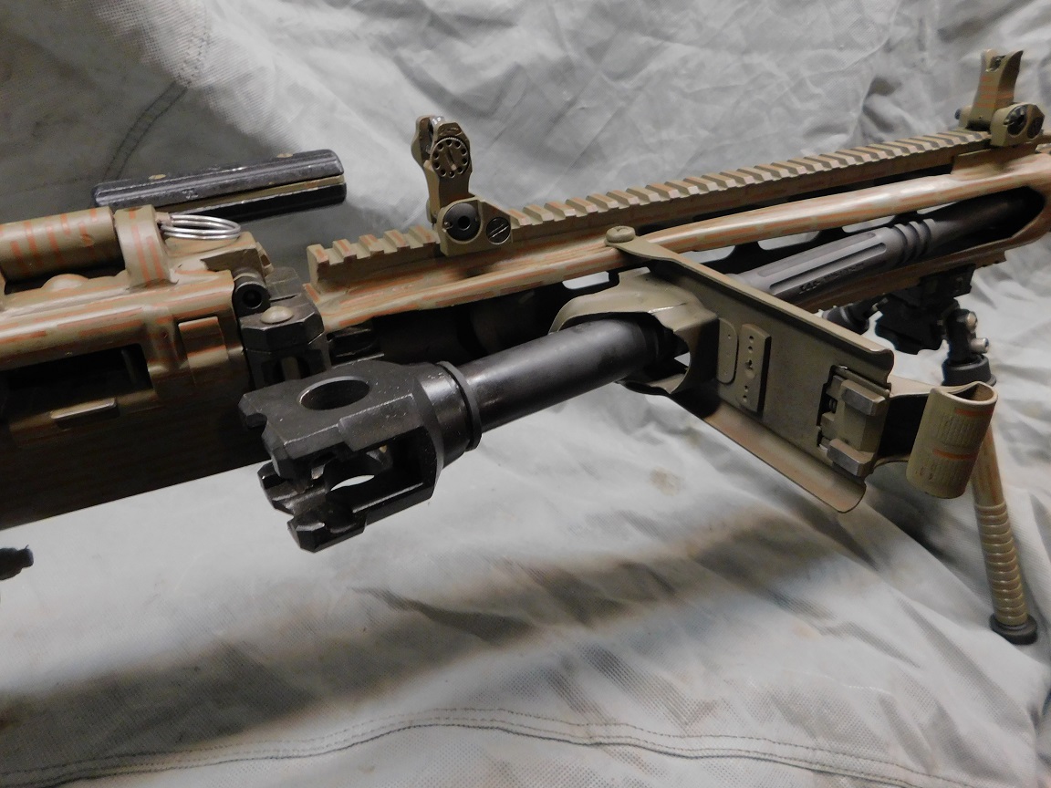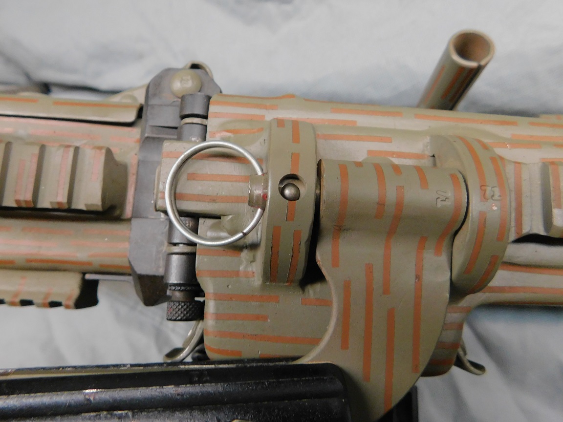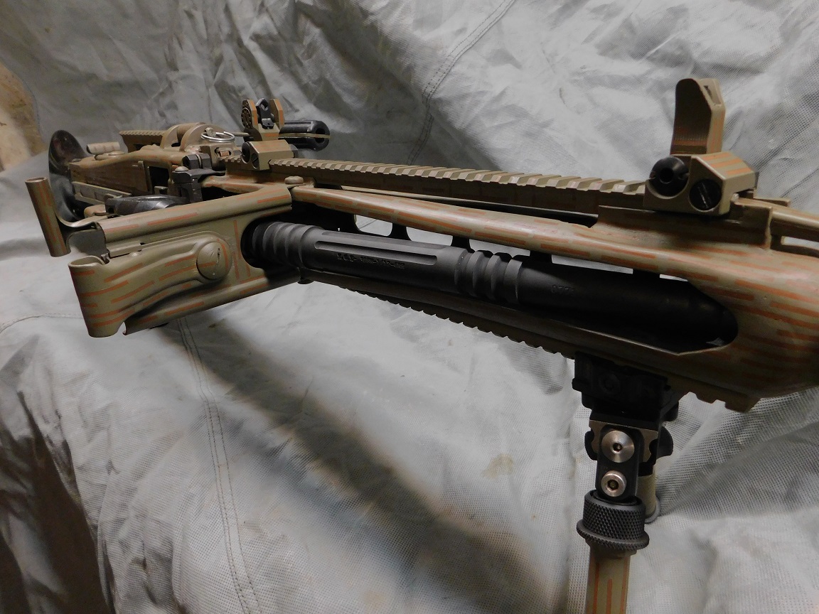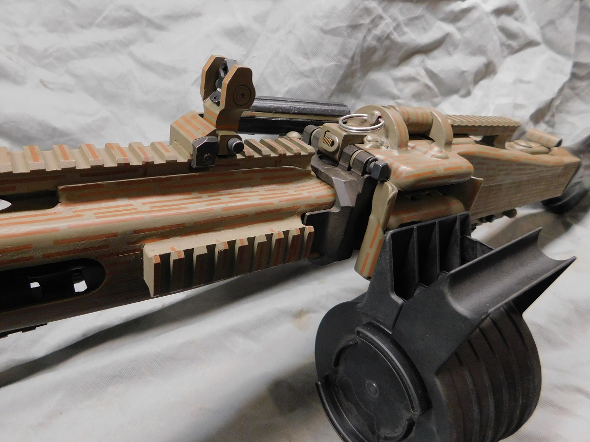 9/18/17 – One of a kind, hand-built modernized semi automatic MG3. This MG3 will stop any busy range on a crowded day. This rifle is constructed from an original de milled German army MG3 kit. It is a hand built and assembled, one of a kind prototype rifle. It is highly custom in every regard, and is the only rifle to exist in this specific configuration. The barrel and shroud have been shortened to 16 inches, and the sight and optics system have been upgraded to modern standards. The vast space of rails offered on the top and bottom and side of the shroud, in additon to the top cover ensure room to mount any optical configuration available. The receiver and rails are custom milled in the USA. The barrel is USA made and 100 percent custom. The charging handle has been improved for ease of operation and durability. A carry handle has been added. The original German army MG3 parts used include the repaired demilled shroud, barrel gate, barrel bushing, top cover, feed tray, flash suppressor, flash suppressor lock, charging handle (modified), recuperator (modified), rear locking cams, stock, drum magazine and links, original barrel carrier and ammunition box. The barrel is a custom in house turned Green Mountain Barrel Co blank in .308w, cut to 16 inches and permanently affixed to an original MG3 trunnion. The blank was a 1:12 twist 4 right hand grooved chrome moly steel. After turning the barrel was stress relieved and duracoated with high heat barrel paint. The OAL barrel length and shroud are 6.6 inches shorter than the original MG3 design. Troy folding steel tritium day night iron sights are included. Please note slight cosmetic wear on rifle from transport and multiple test firings. The rifle is finished in Duracoat camoflauge series, specifically East German Camo.