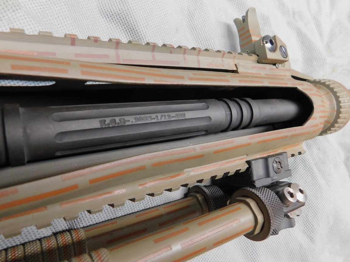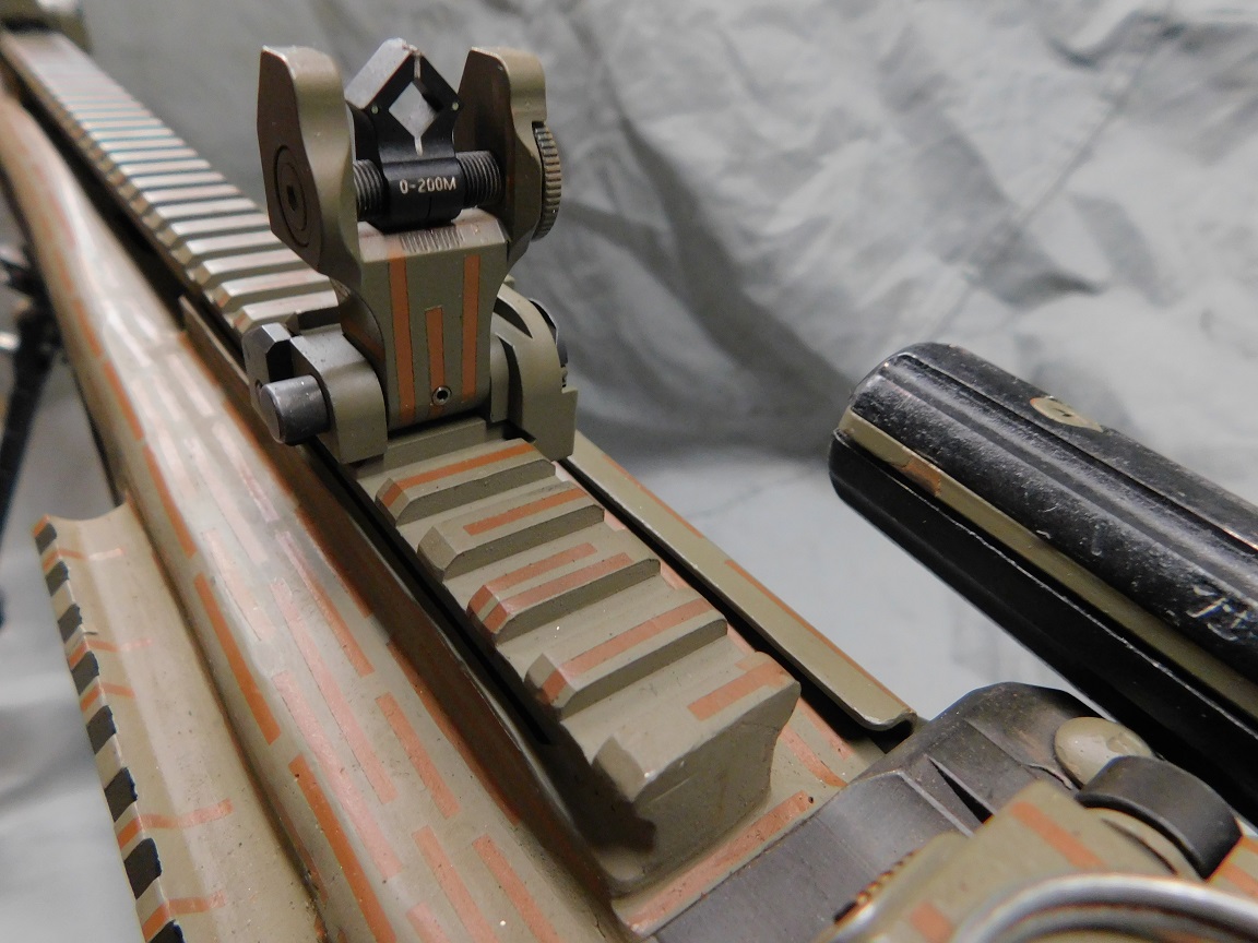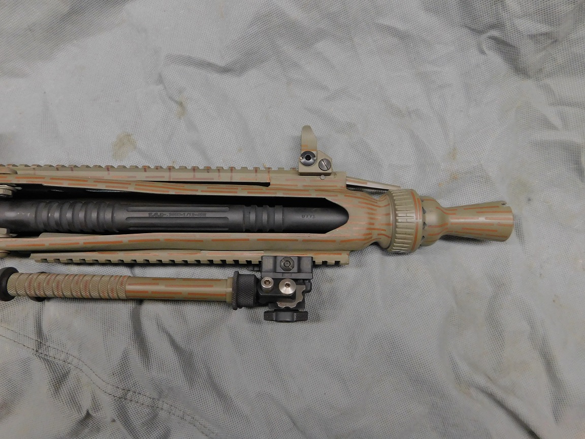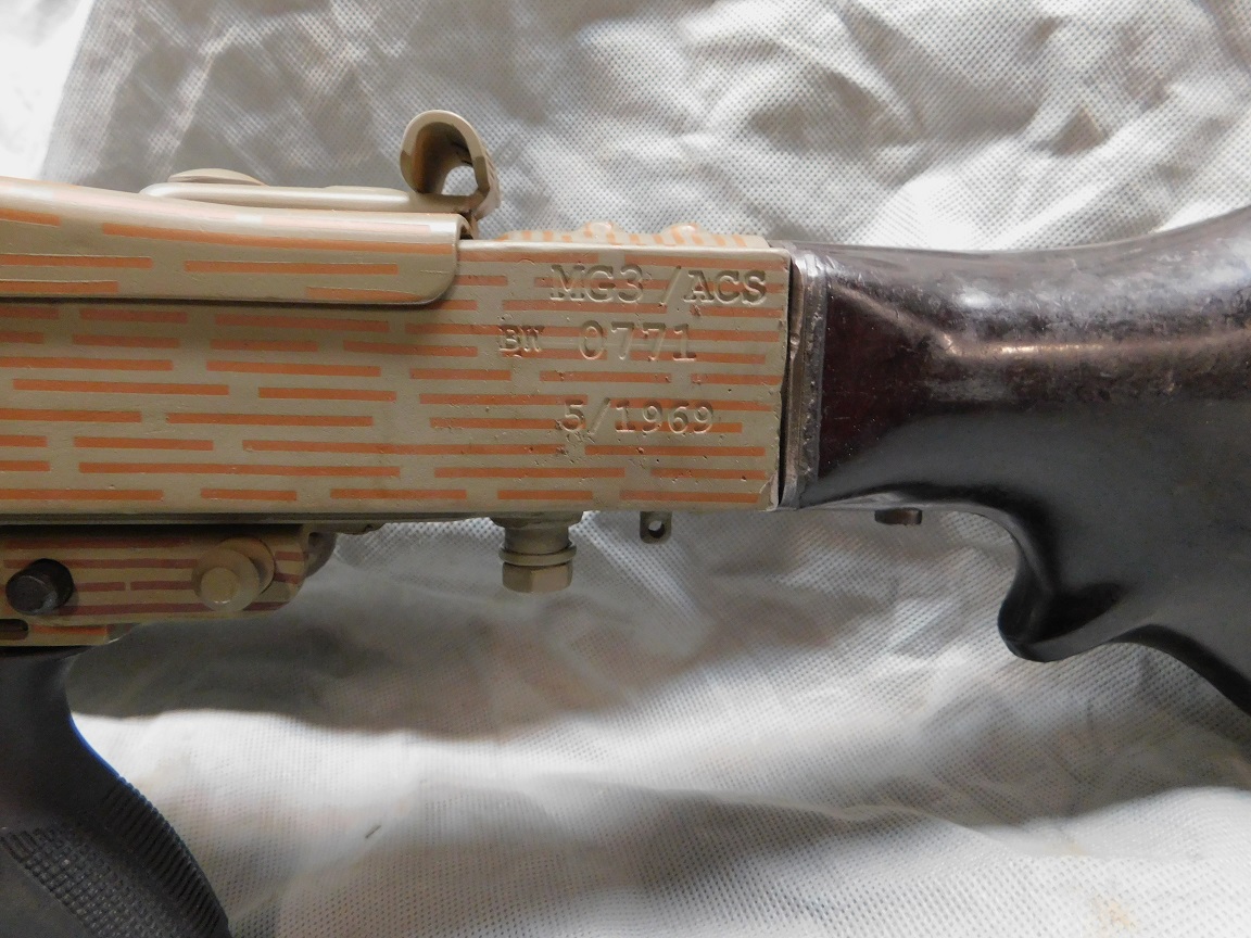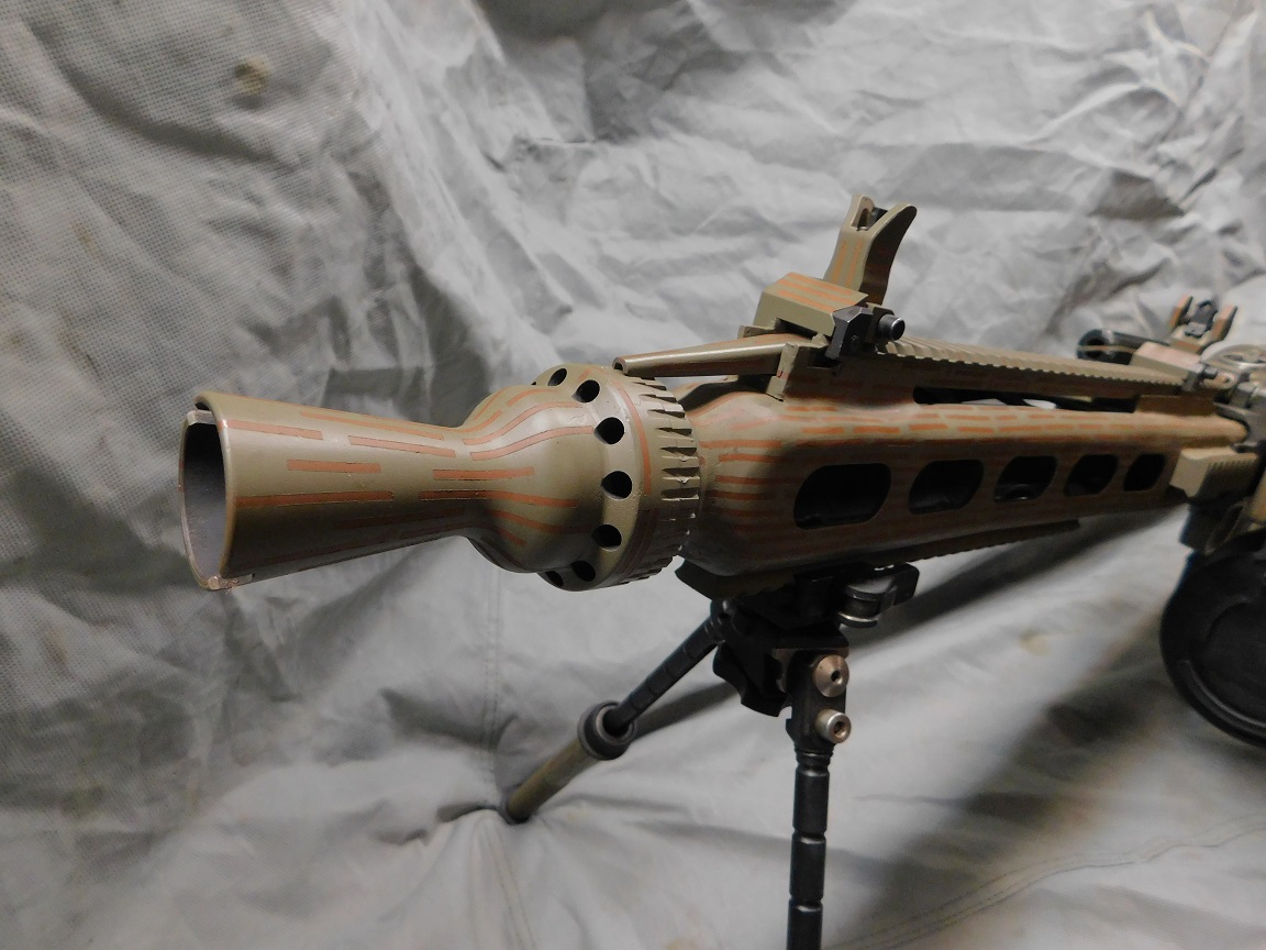 9/18/17 – One of a kind, hand-built modernized semi automatic MG3. This MG3 will stop any busy range on a crowded day. This rifle is constructed from an original de milled German army MG3 kit. It is a hand built and assembled, one of a kind prototype rifle. It is highly custom in every regard, and is the only rifle to exist in this specific configuration. The barrel and shroud have been shortened to 16 inches, and the sight and optics system have been upgraded to modern standards. The vast space of rails offered on the top and bottom and side of the shroud, in additon to the top cover ensure room to mount any optical configuration available. The receiver and rails are custom milled in the USA. The barrel is USA made and 100 percent custom. The charging handle has been improved for ease of operation and durability. A carry handle has been added. The original German army MG3 parts used include the repaired demilled shroud, barrel gate, barrel bushing, top cover, feed tray, flash suppressor, flash suppressor lock, charging handle (modified), recuperator (modified), rear locking cams, stock, drum magazine and links, original barrel carrier and ammunition box. The barrel is a custom in house turned Green Mountain Barrel Co blank in .308w, cut to 16 inches and permanently affixed to an original MG3 trunnion. The blank was a 1:12 twist 4 right hand grooved chrome moly steel. After turning the barrel was stress relieved and duracoated with high heat barrel paint. The OAL barrel length and shroud are 6.6 inches shorter than the original MG3 design. Troy folding steel tritium day night iron sights are included. Please note slight cosmetic wear on rifle from transport and multiple test firings. The rifle is finished in Duracoat camoflauge series, specifically East German Camo.