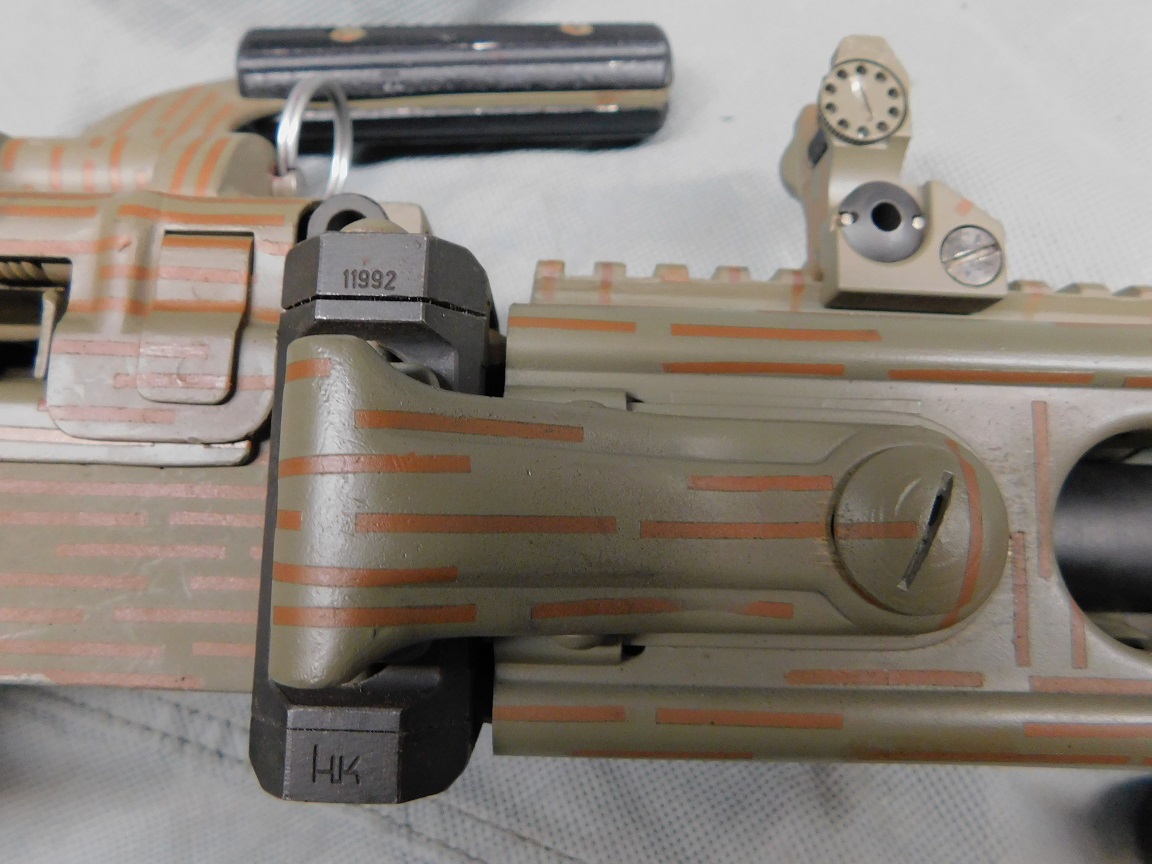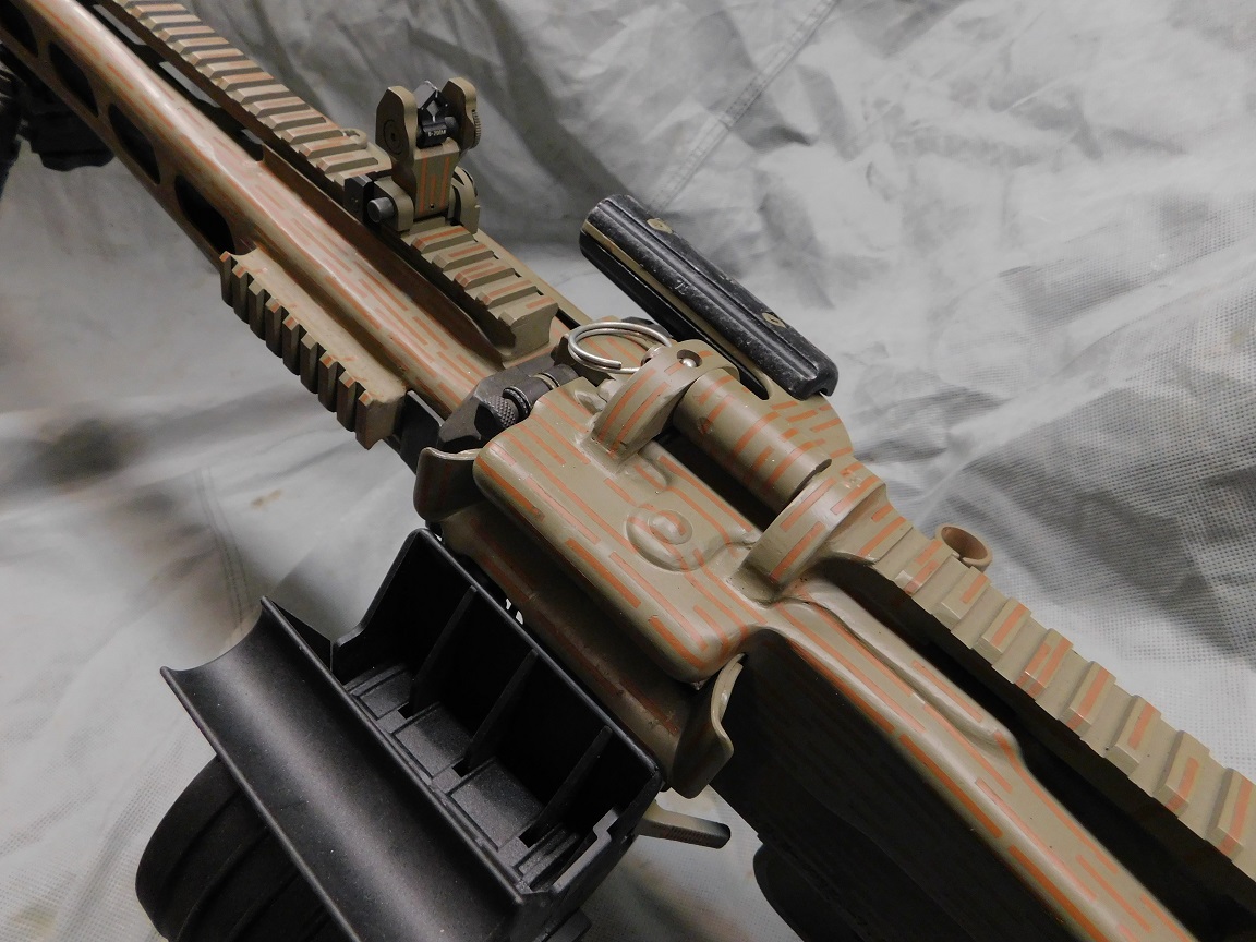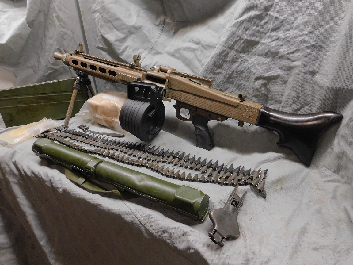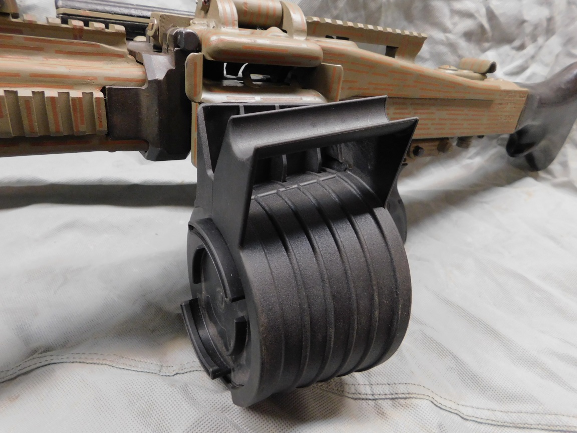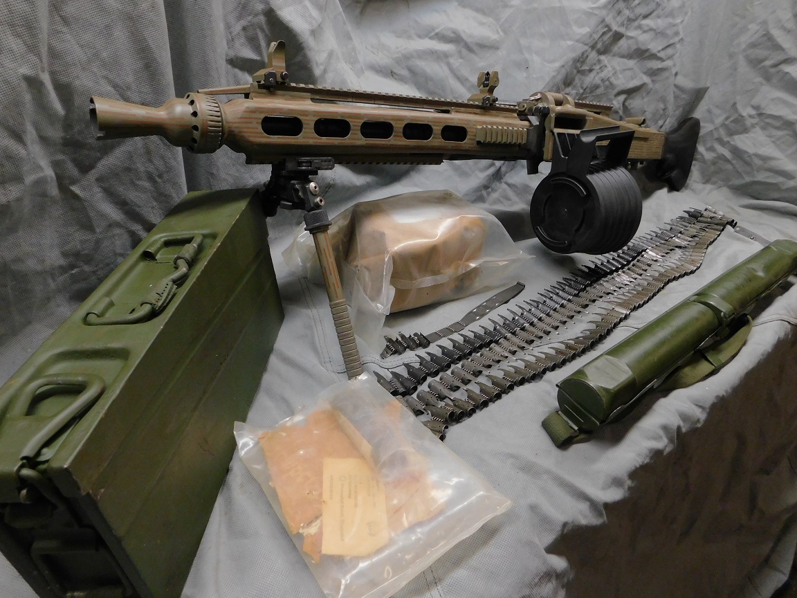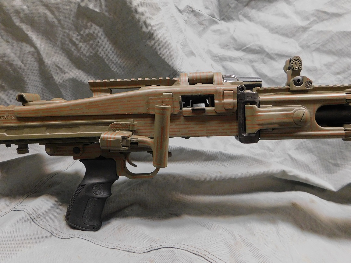 9/18/17 – One of a kind, hand-built modernized semi automatic MG3. This MG3 will stop any busy range on a crowded day. This rifle is constructed from an original de milled German army MG3 kit. It is a hand built and assembled, one of a kind prototype rifle. It is highly custom in every regard, and is the only rifle to exist in this specific configuration. The barrel and shroud have been shortened to 16 inches, and the sight and optics system have been upgraded to modern standards. The vast space of rails offered on the top and bottom and side of the shroud, in additon to the top cover ensure room to mount any optical configuration available. The receiver and rails are custom milled in the USA. The barrel is USA made and 100 percent custom. The charging handle has been improved for ease of operation and durability. A carry handle has been added. The original German army MG3 parts used include the repaired demilled shroud, barrel gate, barrel bushing, top cover, feed tray, flash suppressor, flash suppressor lock, charging handle (modified), recuperator (modified), rear locking cams, stock, drum magazine and links, original barrel carrier and ammunition box. The barrel is a custom in house turned Green Mountain Barrel Co blank in .308w, cut to 16 inches and permanently affixed to an original MG3 trunnion. The blank was a 1:12 twist 4 right hand grooved chrome moly steel. After turning the barrel was stress relieved and duracoated with high heat barrel paint. The OAL barrel length and shroud are 6.6 inches shorter than the original MG3 design. Troy folding steel tritium day night iron sights are included. Please note slight cosmetic wear on rifle from transport and multiple test firings. The rifle is finished in Duracoat camoflauge series, specifically East German Camo.