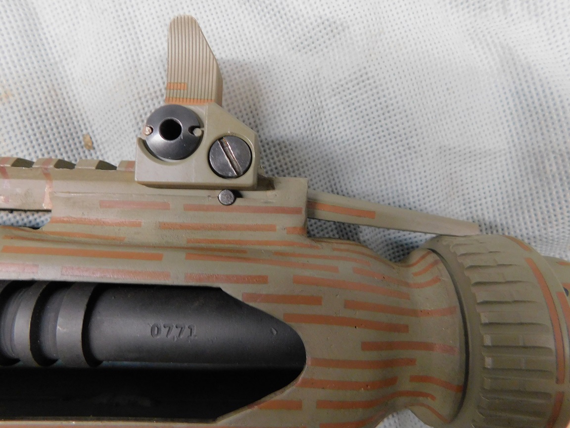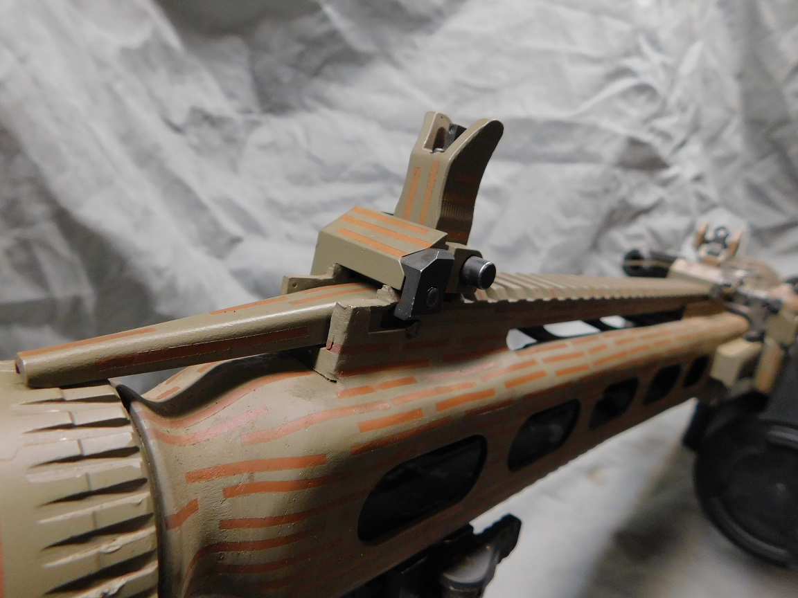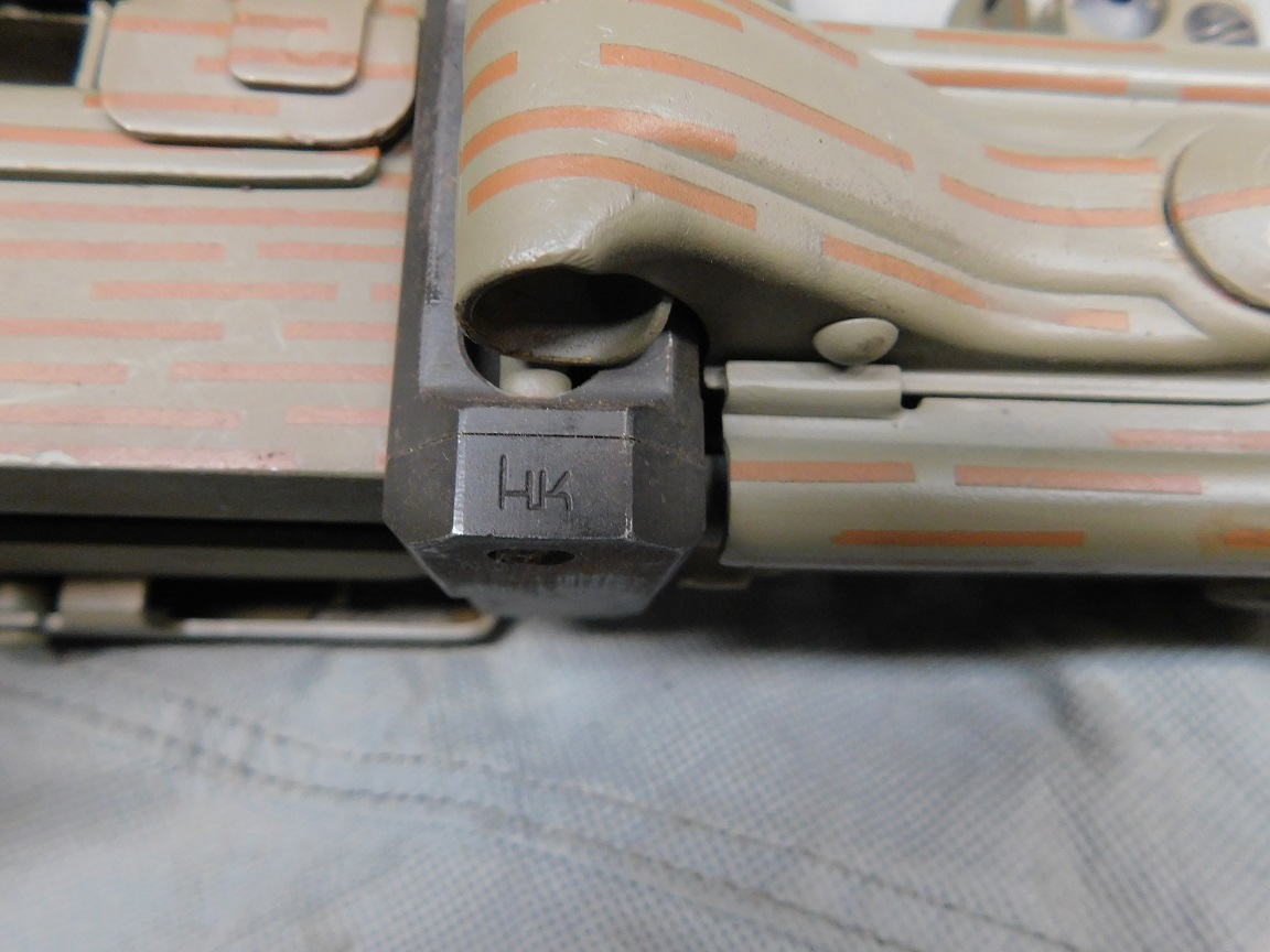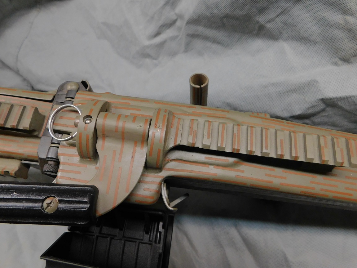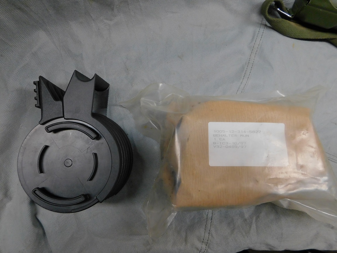 9/18/17 – One of a kind, hand-built modernized semi automatic MG3. This MG3 will stop any busy range on a crowded day. This rifle is constructed from an original de milled German army MG3 kit. It is a hand built and assembled, one of a kind prototype rifle. It is highly custom in every regard, and is the only rifle to exist in this specific configuration. The barrel and shroud have been shortened to 16 inches, and the sight and optics system have been upgraded to modern standards. The vast space of rails offered on the top and bottom and side of the shroud, in additon to the top cover ensure room to mount any optical configuration available. The receiver and rails are custom milled in the USA. The barrel is USA made and 100 percent custom. The charging handle has been improved for ease of operation and durability. A carry handle has been added. The original German army MG3 parts used include the repaired demilled shroud, barrel gate, barrel bushing, top cover, feed tray, flash suppressor, flash suppressor lock, charging handle (modified), recuperator (modified), rear locking cams, stock, drum magazine and links, original barrel carrier and ammunition box. The barrel is a custom in house turned Green Mountain Barrel Co blank in .308w, cut to 16 inches and permanently affixed to an original MG3 trunnion. The blank was a 1:12 twist 4 right hand grooved chrome moly steel. After turning the barrel was stress relieved and duracoated with high heat barrel paint. The OAL barrel length and shroud are 6.6 inches shorter than the original MG3 design. Troy folding steel tritium day night iron sights are included. Please note slight cosmetic wear on rifle from transport and multiple test firings. The rifle is finished in Duracoat camoflauge series, specifically East German Camo.