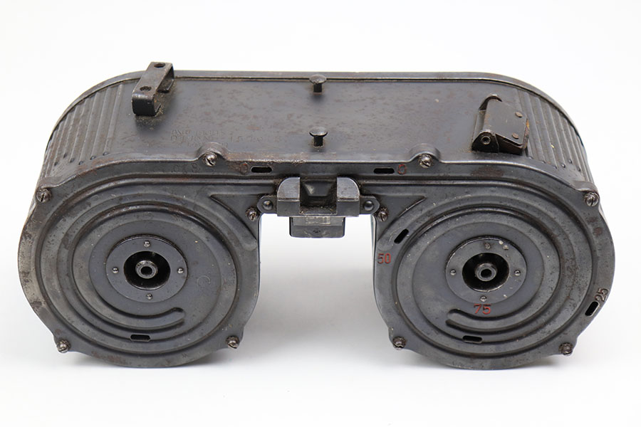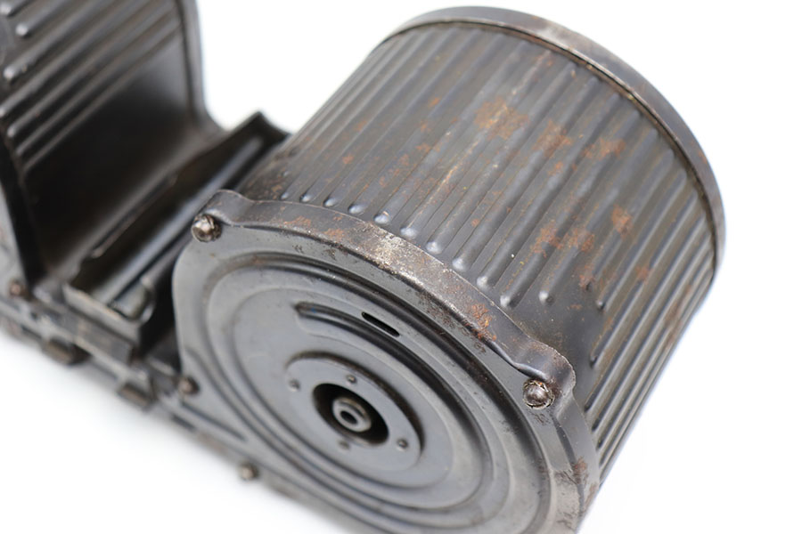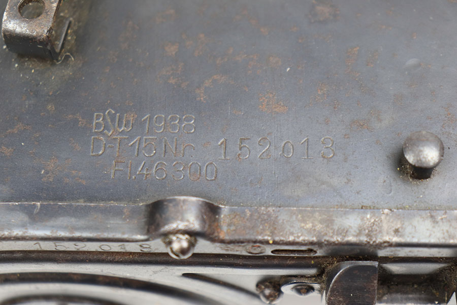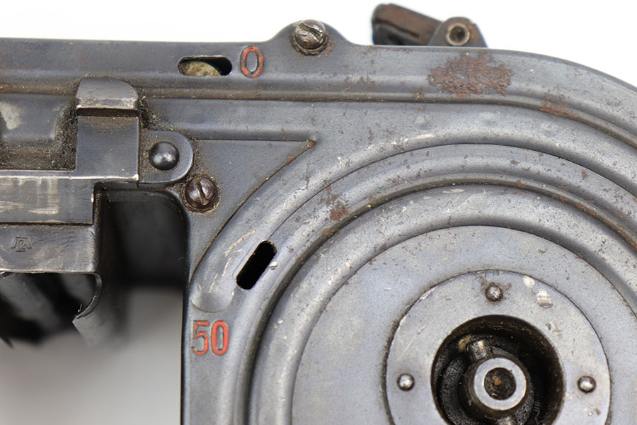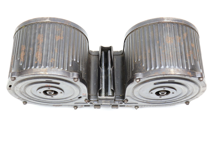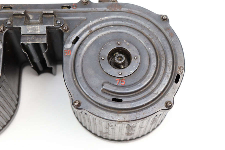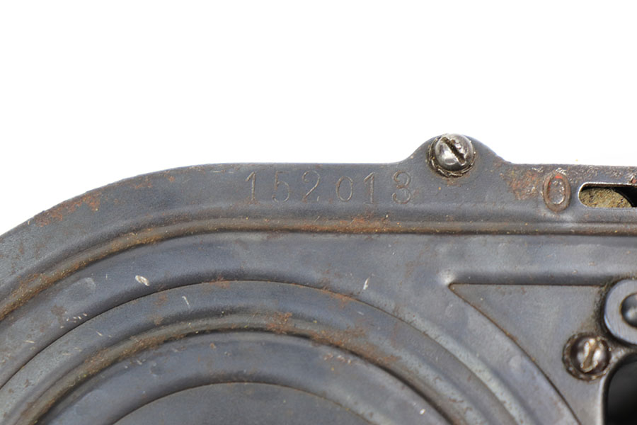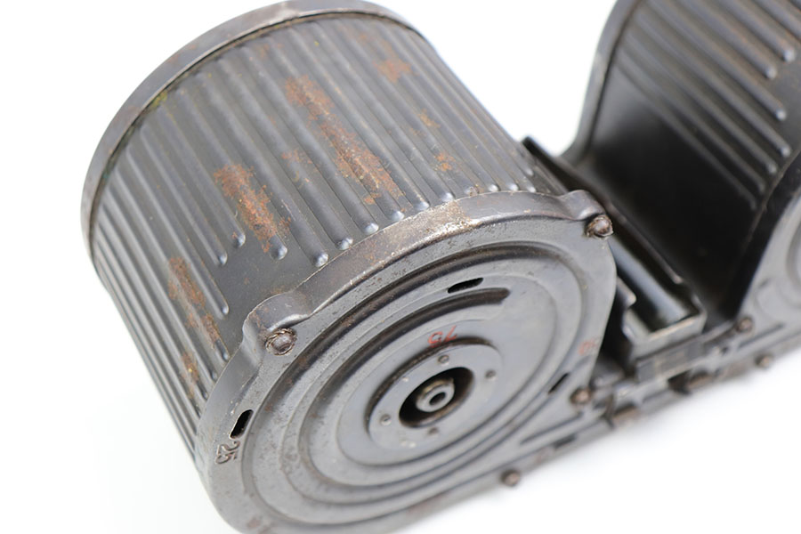 1/22/21 – This is a fairly uncommon double snail drum magazine for a MG34 machinegun. The snail drum is stamped on the top with a “BSW” maker stamp and 1938 date. Also stamped with a serial number. The blued finish is mostly in tact with some light spotty surface rust and mild patina throughout. Fully functional.