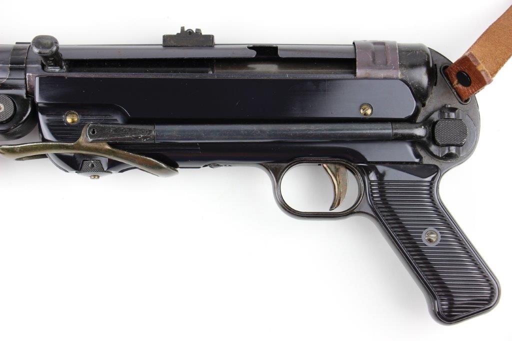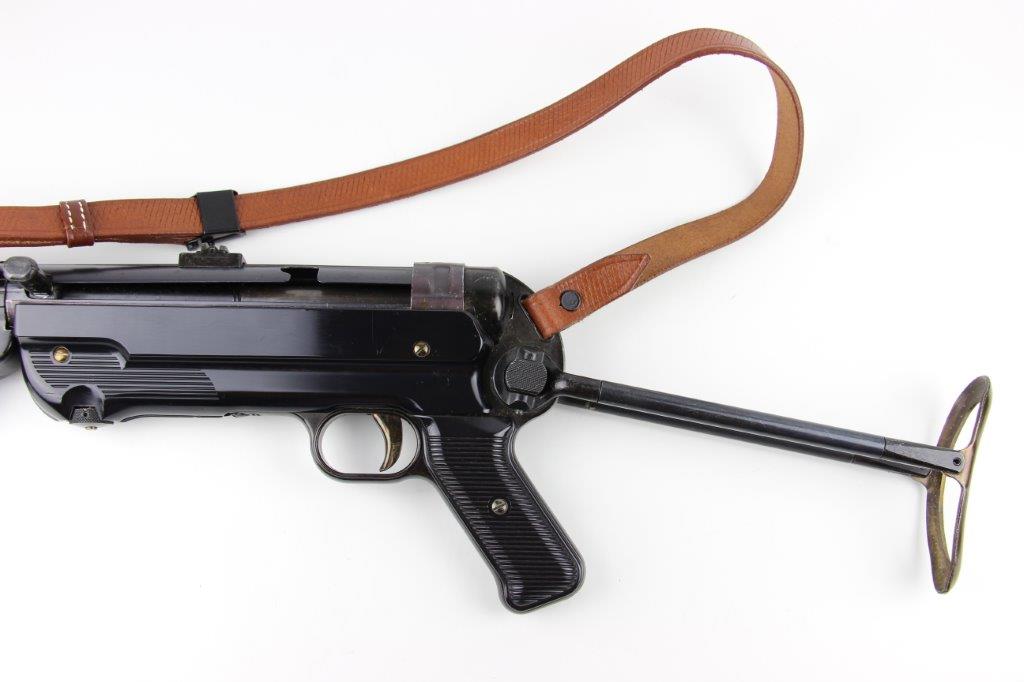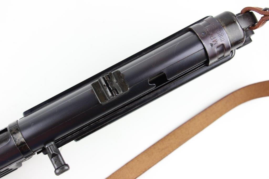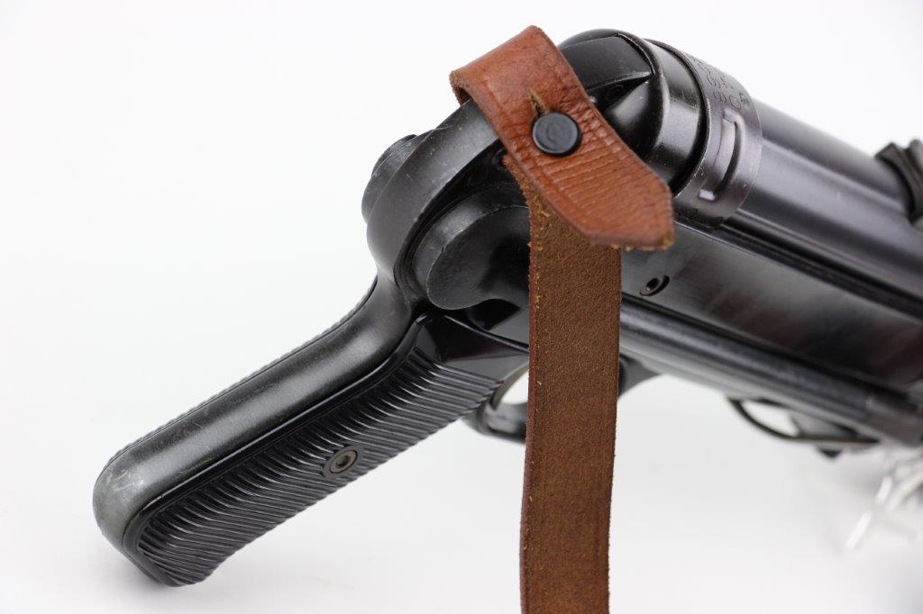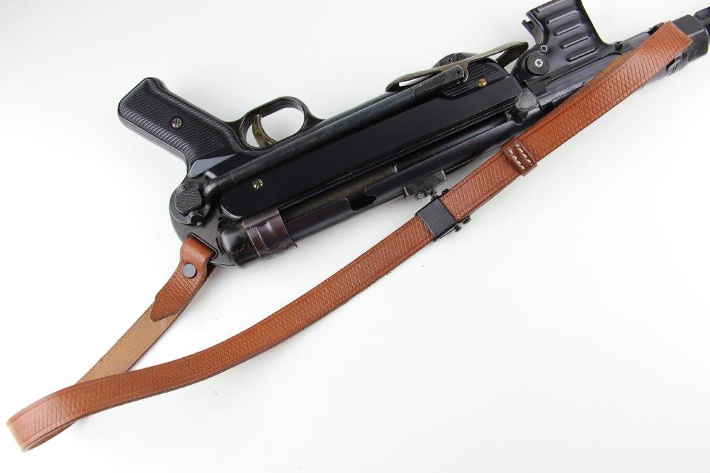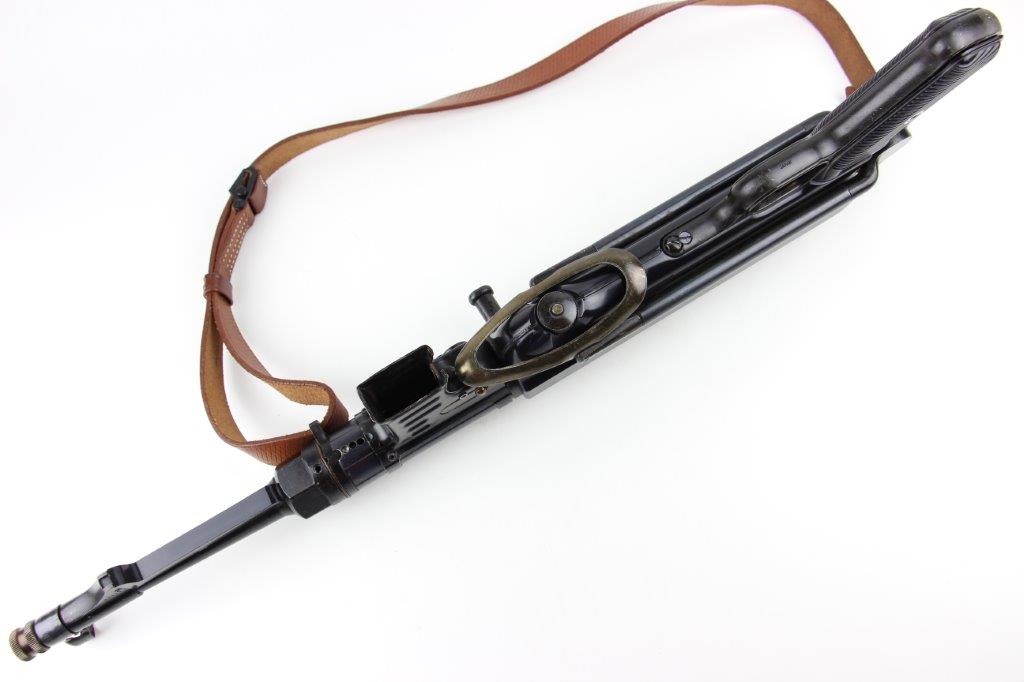 6/11/24 – This is a Japanese MGC 68 Replica / Model MP40 Submachine Gun. This is a non-firing model gun with functional folding stock, charging handle, push-button magazine release, and takedown knob. This replica functions very similarly to the authentic MP40’s without being able to fire. The stock and handle grips are plastic, and in great condition. The metal retains most of the original finish with some handling and high edge wear from age. The top of the receiver is marked, “MP40 / mgc68”. There is no magazine included, but a reproduction MP40 leather sling is attached and included, as shown. These make a great place holder and are collectible in their own right.