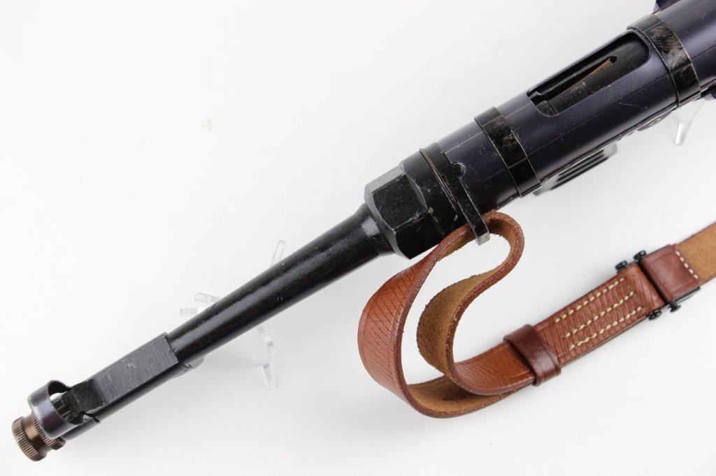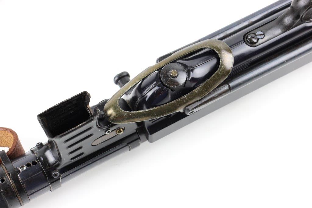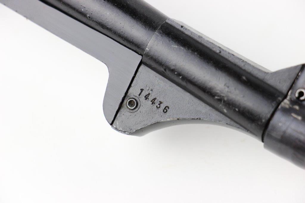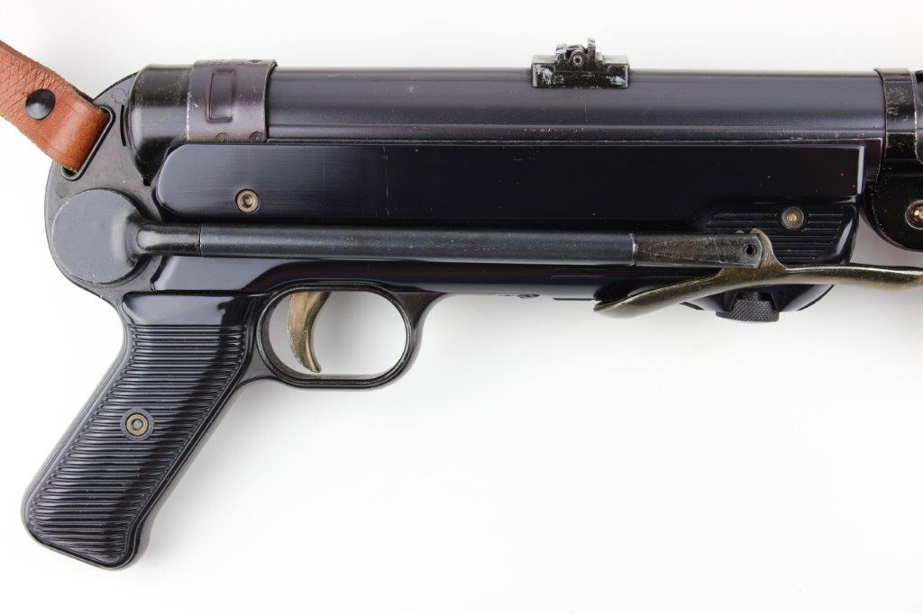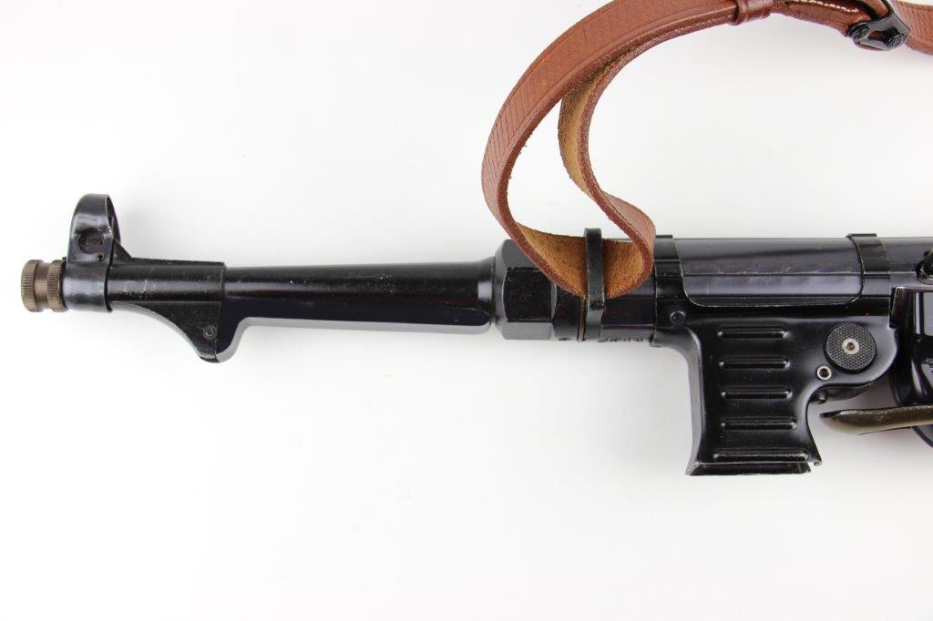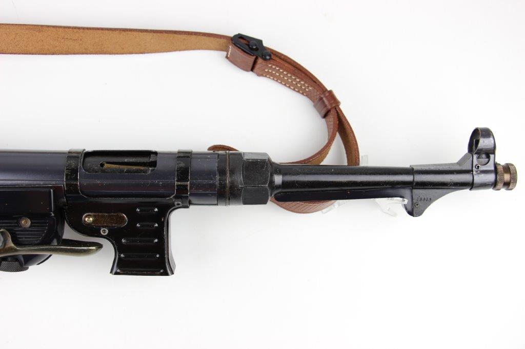 6/11/24 – This is a Japanese MGC 68 Replica / Model MP40 Submachine Gun. This is a non-firing model gun with functional folding stock, charging handle, push-button magazine release, and takedown knob. This replica functions very similarly to the authentic MP40’s without being able to fire. The stock and handle grips are plastic, and in great condition. The metal retains most of the original finish with some handling and high edge wear from age. The top of the receiver is marked, “MP40 / mgc68”. There is no magazine included, but a reproduction MP40 leather sling is attached and included, as shown. These make a great place holder and are collectible in their own right.
