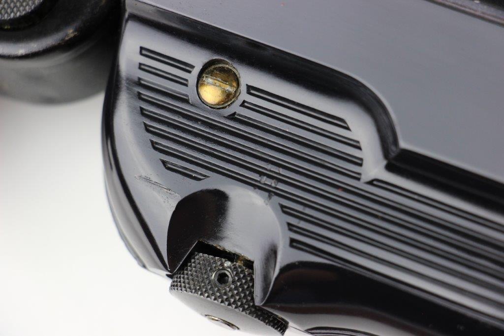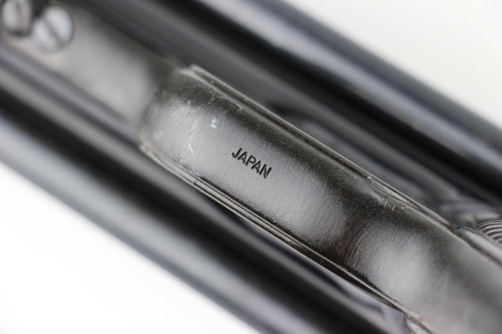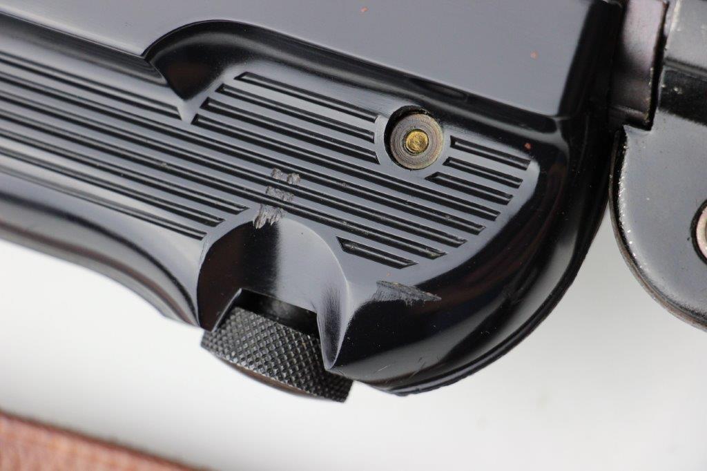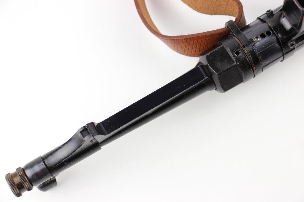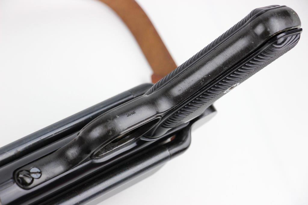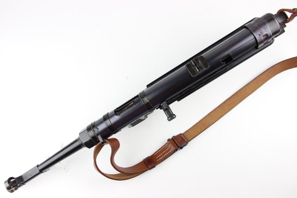 6/11/24 – This is a Japanese MGC 68 Replica / Model MP40 Submachine Gun. This is a non-firing model gun with functional folding stock, charging handle, push-button magazine release, and takedown knob. This replica functions very similarly to the authentic MP40’s without being able to fire. The stock and handle grips are plastic, and in great condition. The metal retains most of the original finish with some handling and high edge wear from age. The top of the receiver is marked, “MP40 / mgc68”. There is no magazine included, but a reproduction MP40 leather sling is attached and included, as shown. These make a great place holder and are collectible in their own right.