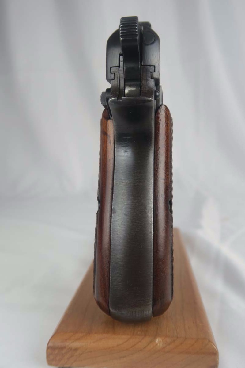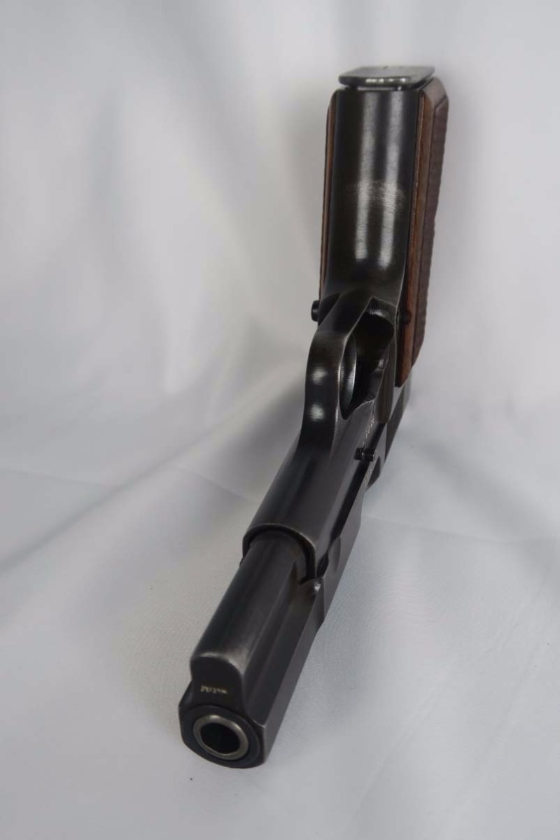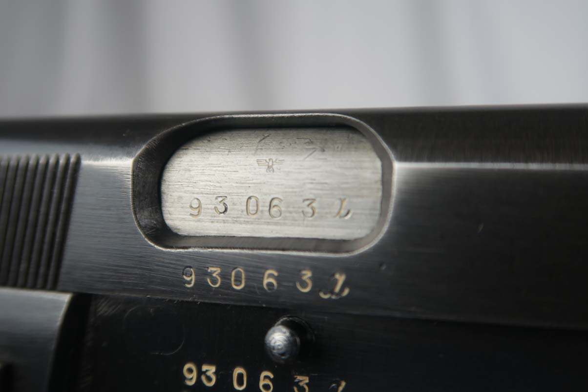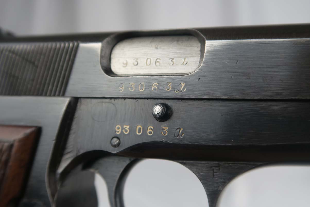 3/20/17 – This is a mid-war (1943) Browning High Power that went to the Nazi army as evidenced by the waffen 140 proofs on the gun.   The original finish is a nice blue color and covers about 96% of the gun.   There is typical muzzle wear but no rust or pitting.   Front strap has the typical holster “swipe” on it.   All matching frame, slide and barrel, with the mid-war A suffix.    The grips are excellent and match the condition of the gun.   The magazine is a wartime magazine but I see no waffen proof on the spine.   The bore has strong rifling but frosting in the grooves.   I would rate the bore a 6 out of 10.