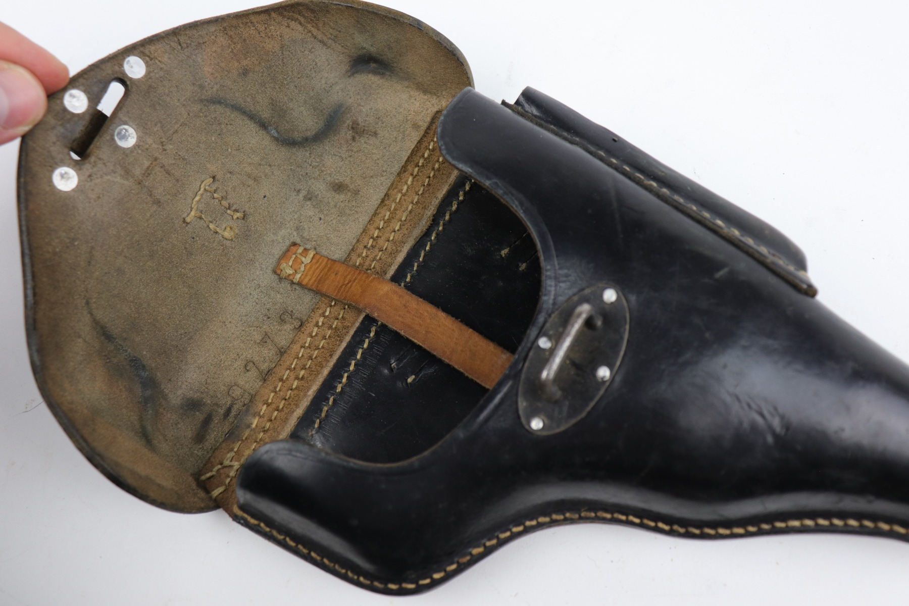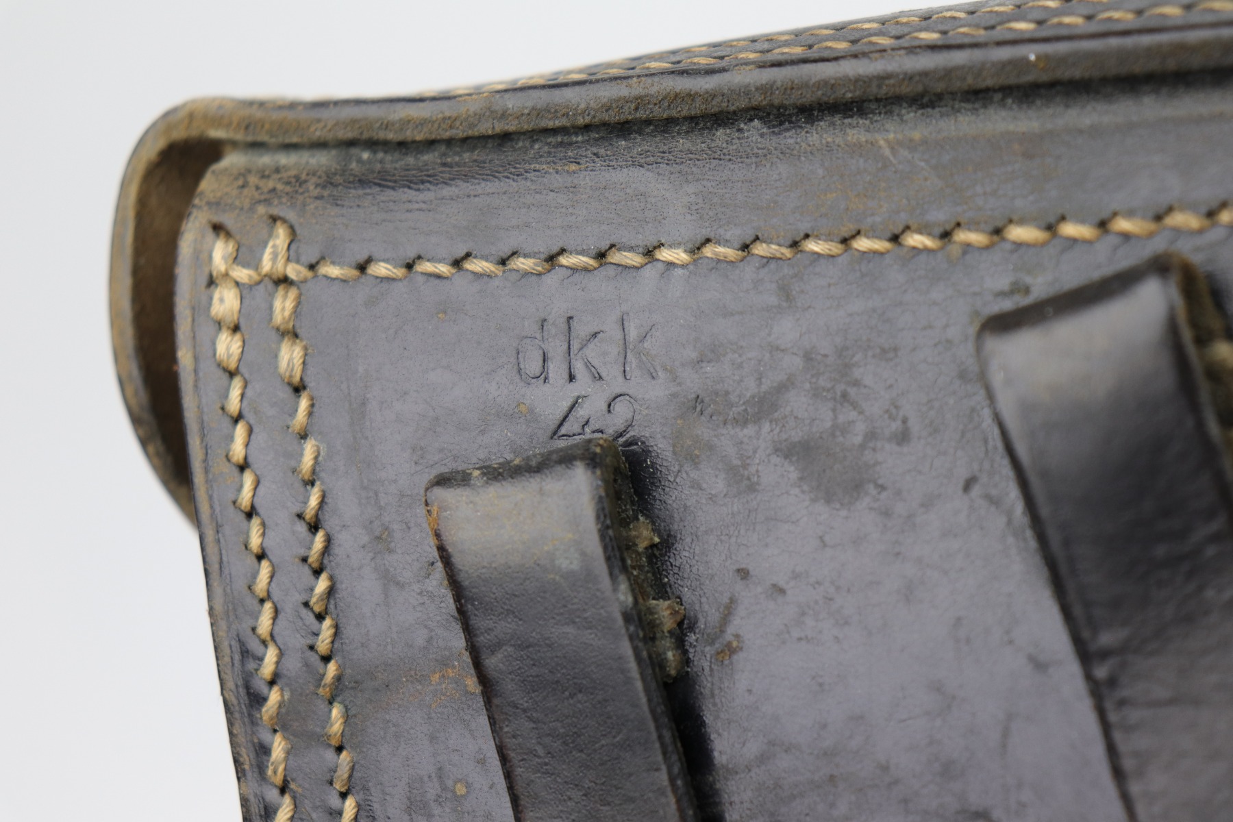 11/21/20 – This is an excellent example of a 1942 dated, P.38 holster. The leather and stitching are excellent. I think this one would be hard to upgrade. The maker is dkk, and the waffen stamp next to the maker mark is very faint. All original and excellent