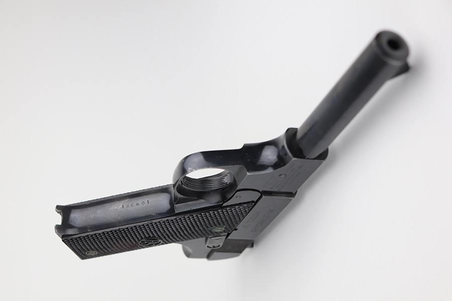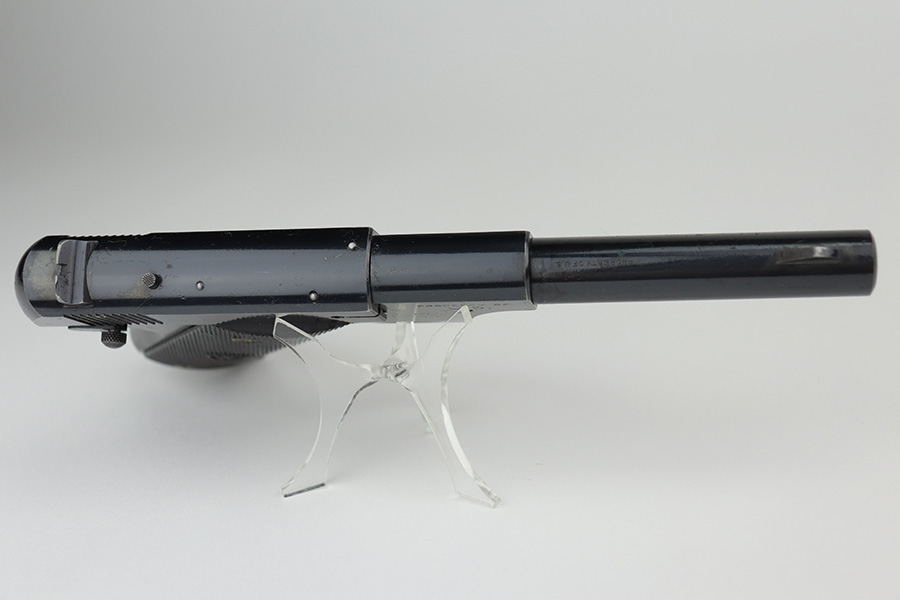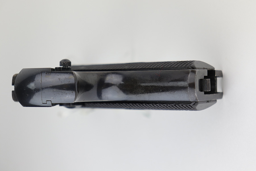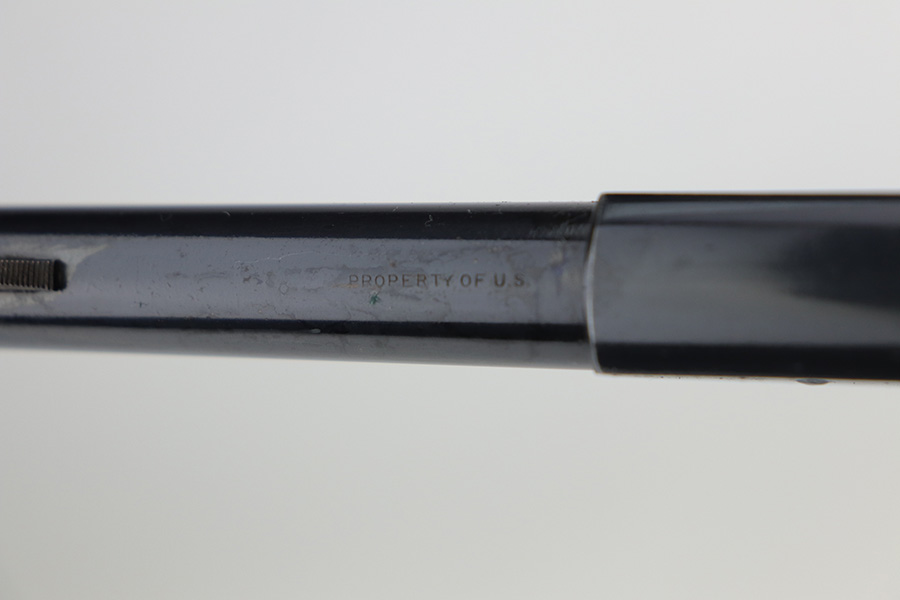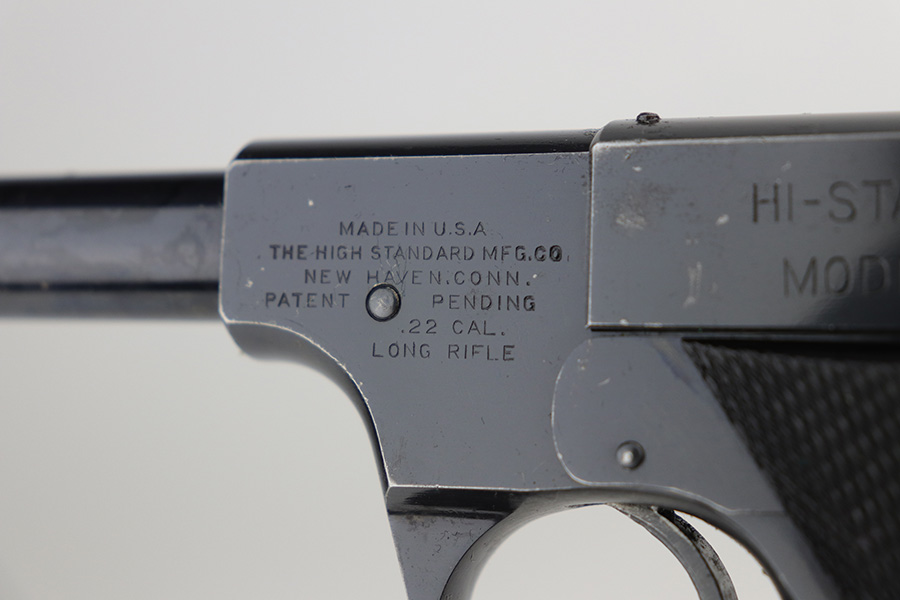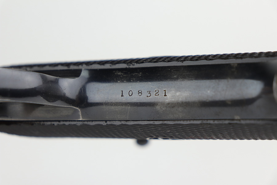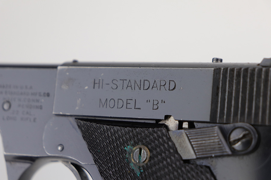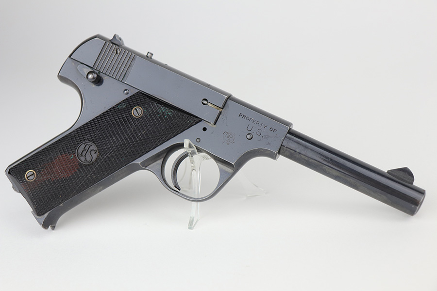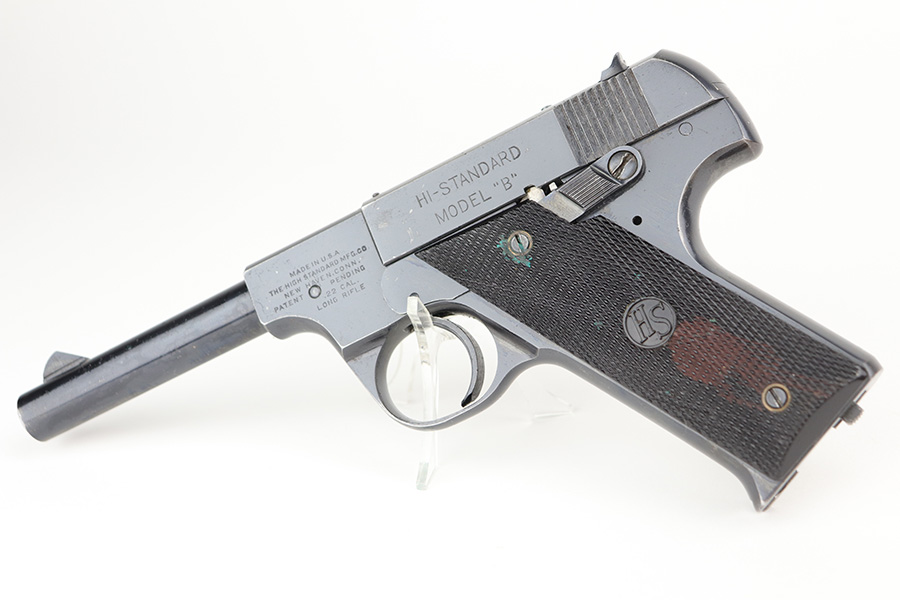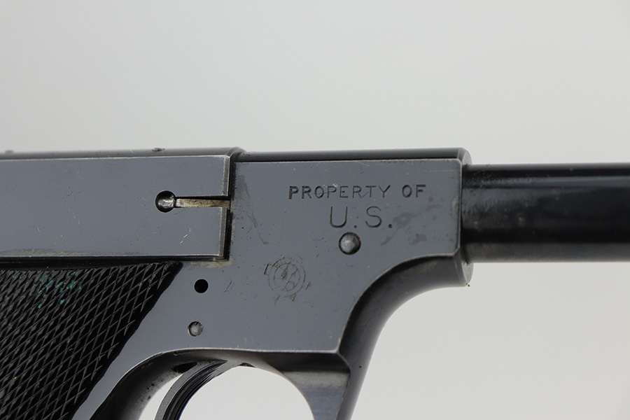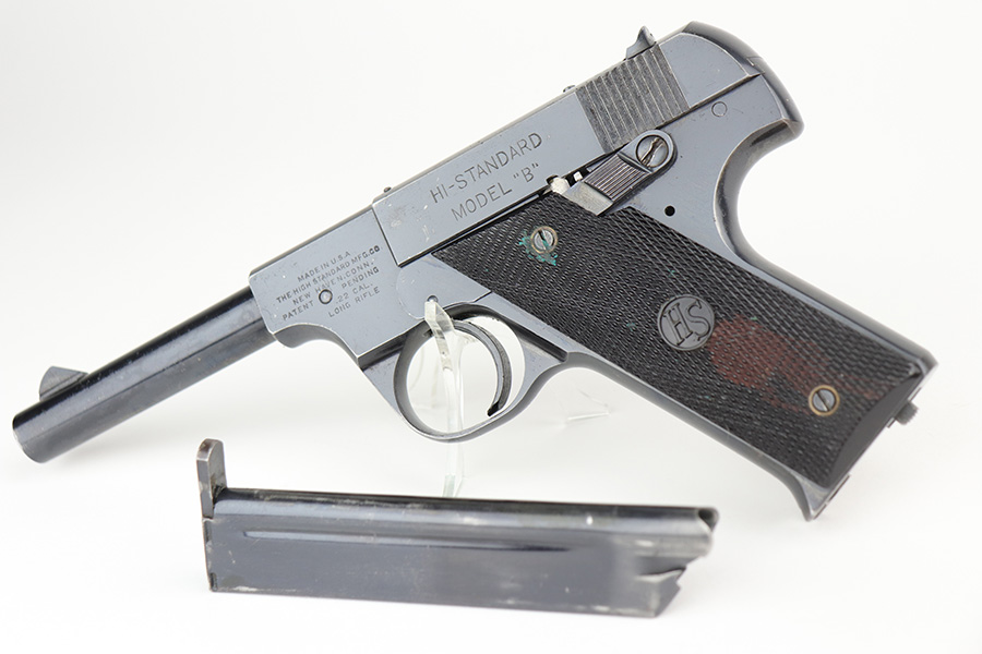 9/1/21 – This is a nice example of a Hi Standard Model B pistol, manufactured in the 1940’s. These were issued to the US military for service weapons training. They were widely used by the US Navy. About 14,000 made. This one is all matching, has the proper military cross-canon cartouche, and is properly “Property of US”-marked. It has retained about 90-92% of its gorgeous high polish finish. Most of the finish loss is on the grip straps, with a little wear on high edges and either side of the barrel. Mismatched serial on frame and slide. Comes with excellent grips and a proper magazine. Minty bore.