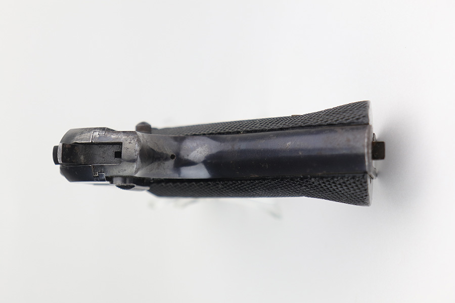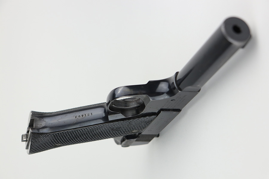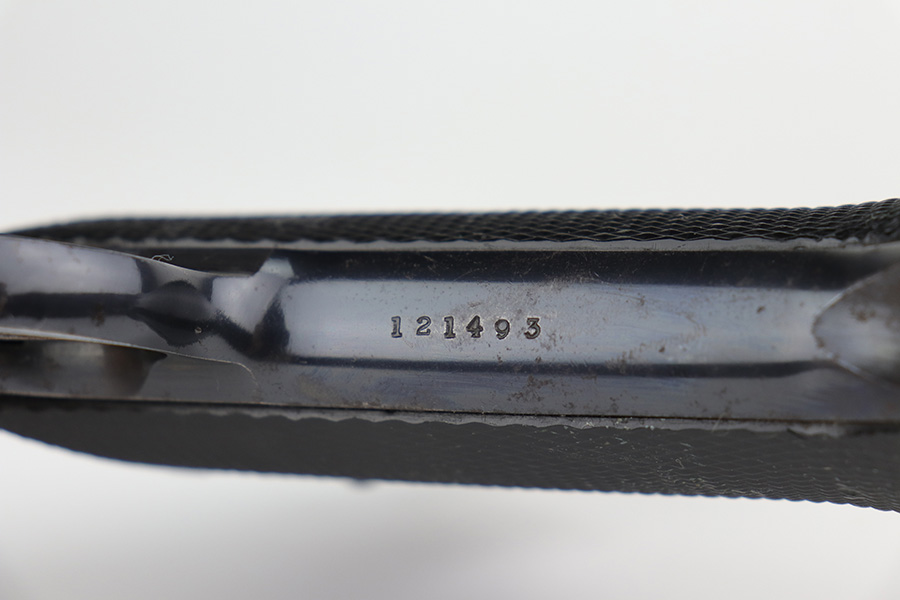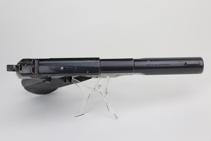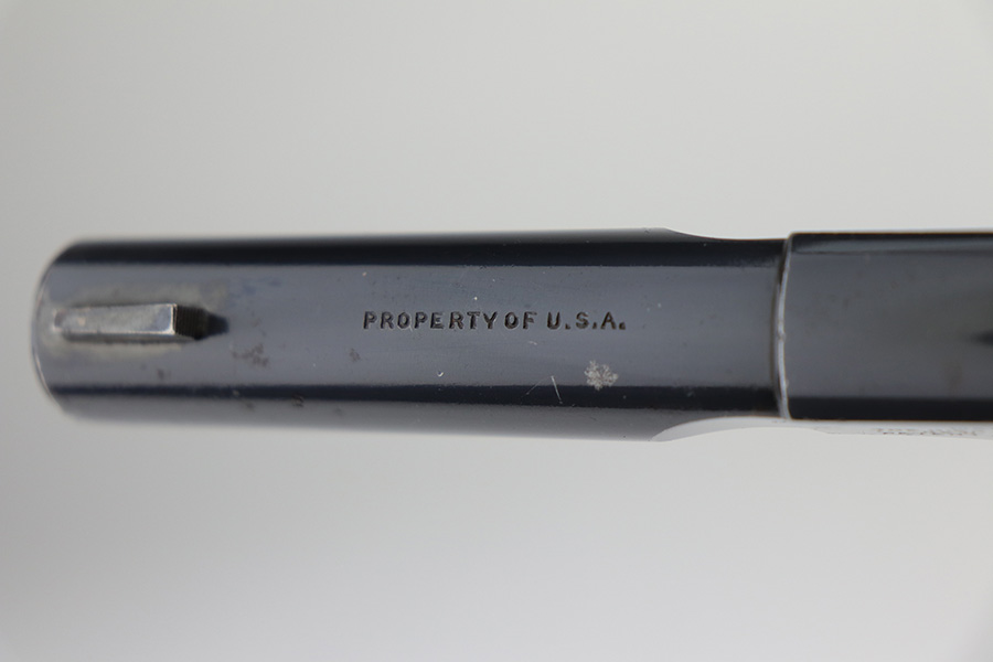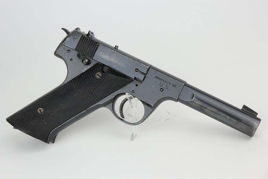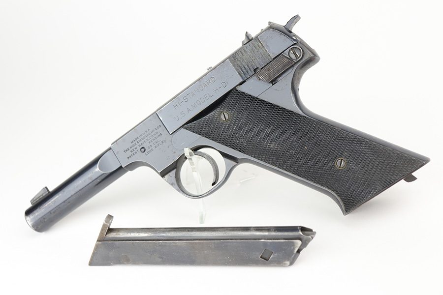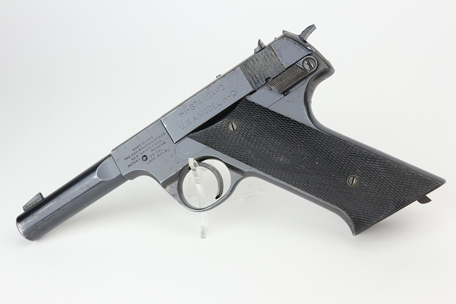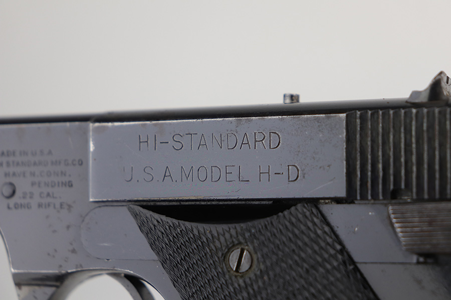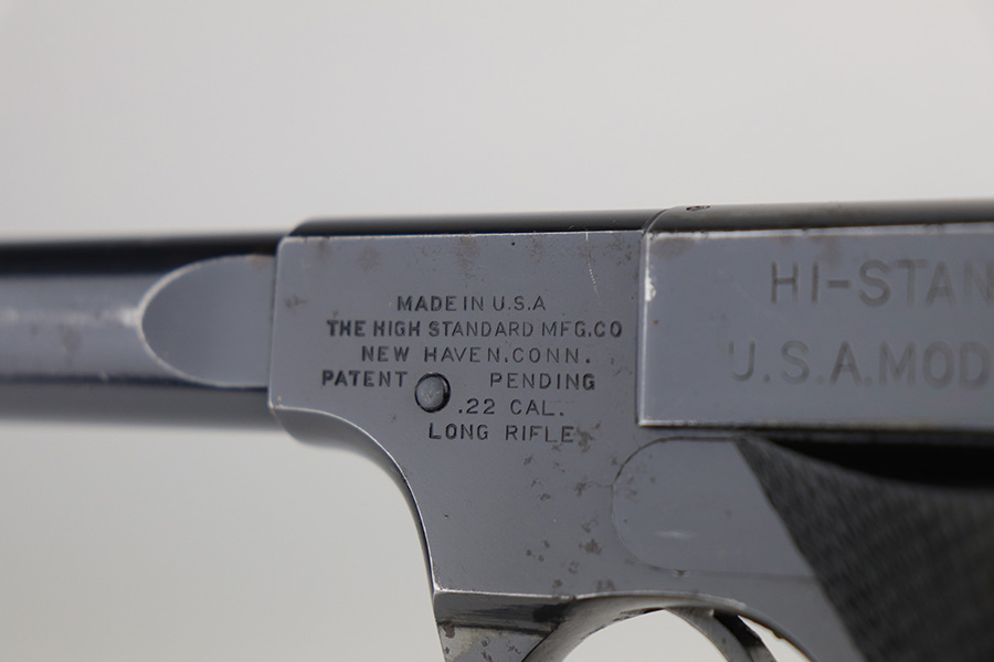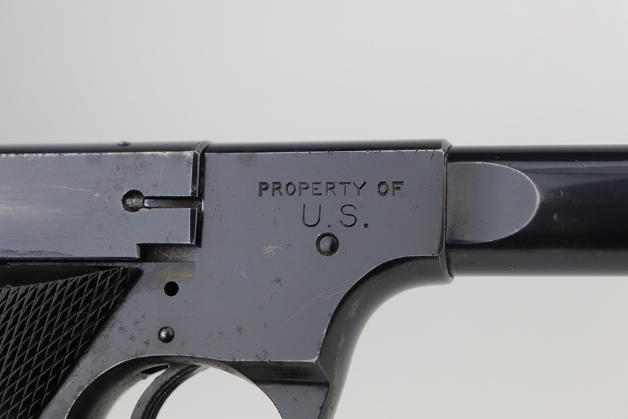 8/23/21 – This is an original High Standard Model H-D pistol that was issued to the U.S. Military in 1944. A total of ~32,000 Model H-D pistols were procured by the military from 1943-45. This one is marked PROPERTY OF U.S. on the right side of the frame. The original, high-polish blue rates at about 85-90% with some minor finish loss on the left side of the barrel, but more on right side of slide. There’s also some oxidation and freckling in several areas on the gun. Excellent bore. Nice grips with a few minor dings.
